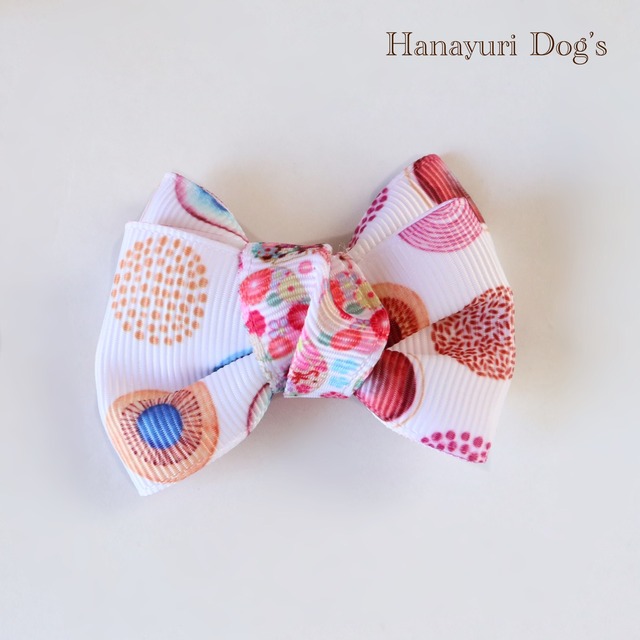 オレンジや赤、青色のなどのカラフルな丸模様がかわいい和風リボンです。 ふっくらとした厚みが、まるで和装の帯のように粋で素敵なお品です。 和風好きさんやお祭りなどにピッタリ。 こちらは小さい目サイズの長さ約5.5cm、3連リボンです。 毛が絡まりづらく、しっかり固定の日本製プラスチックバレッタを使用しています。 細く薄いバレッタはリボンの浮きが少なく見栄え良く、しっかり留まるので人間用にも最適です。髪の結び目の上などの飾りとして活躍します。 サイズ約5×5.5cm ぬいぐるみの頭の大きさは約8 cmです。 リボンの大きさの参考になさってください。