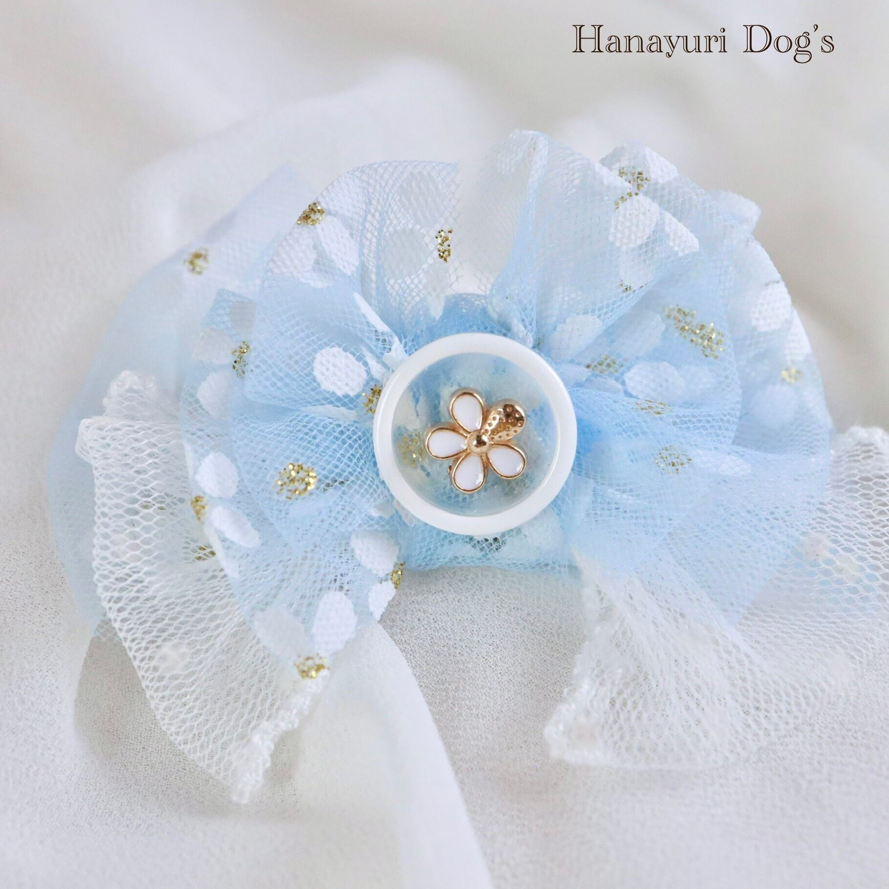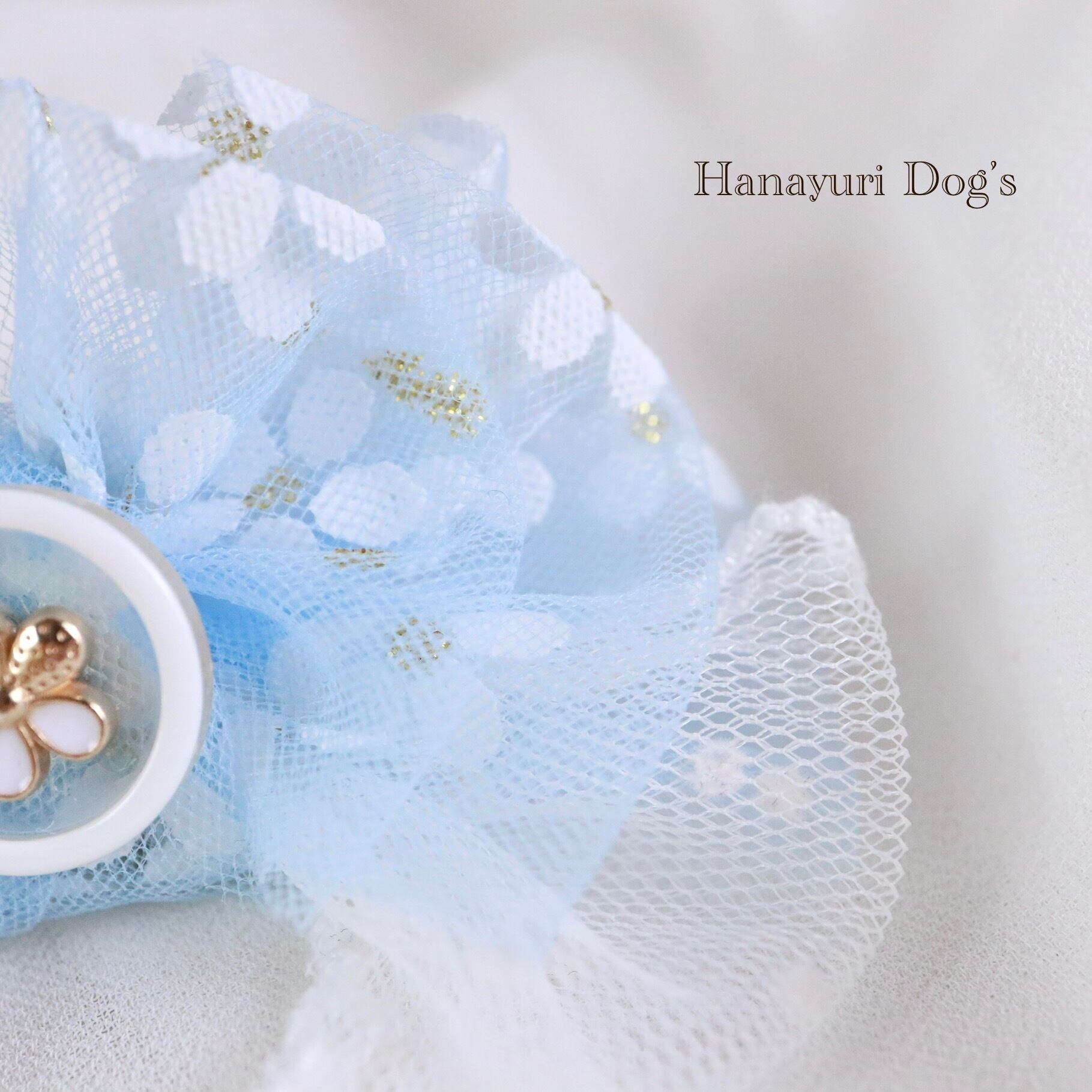 ブルーのチュールは真っ白な花にゴールドラメ。