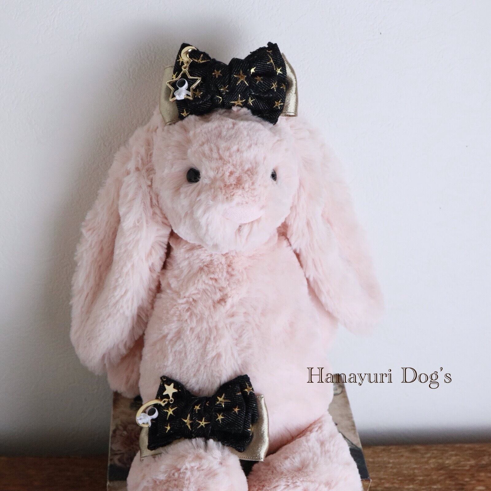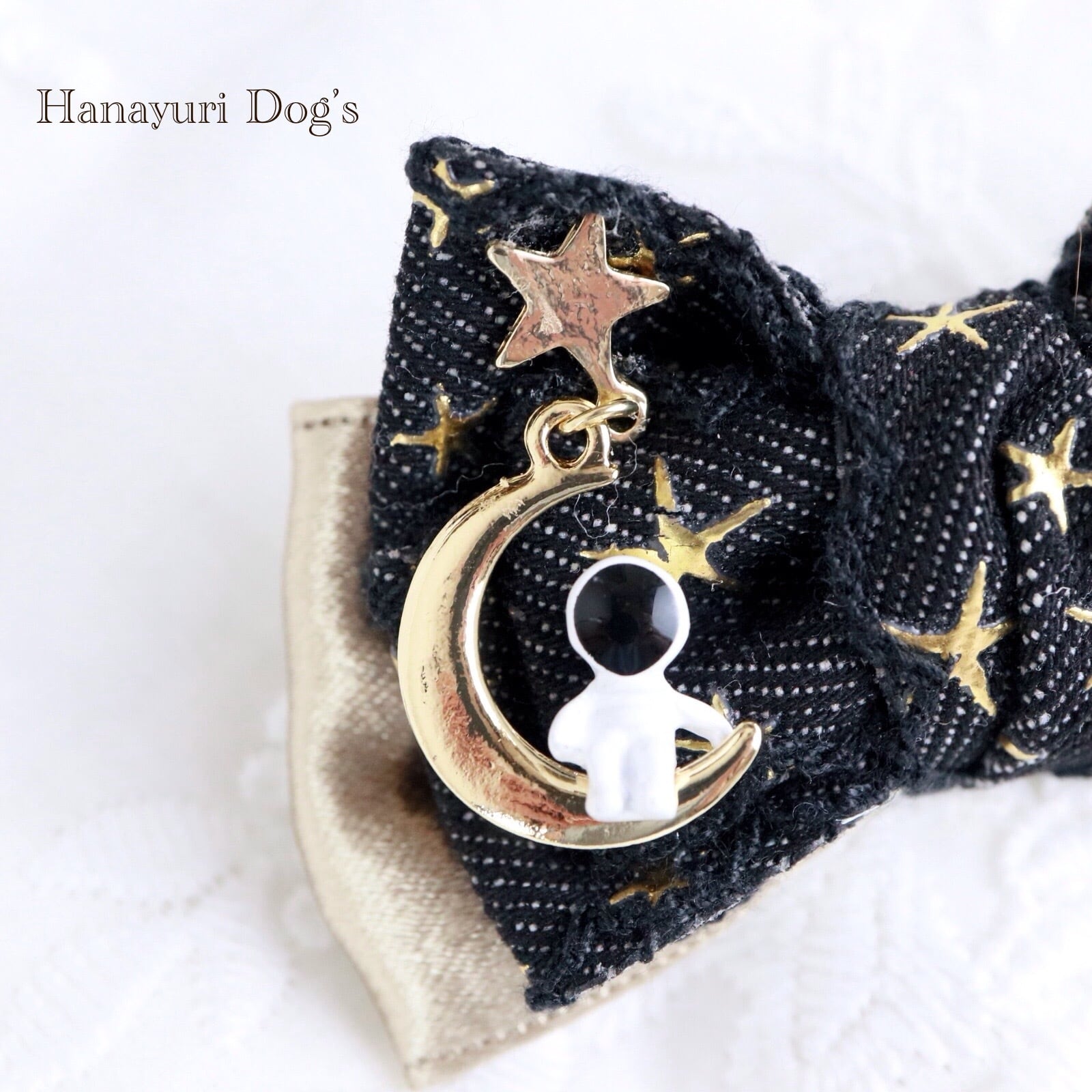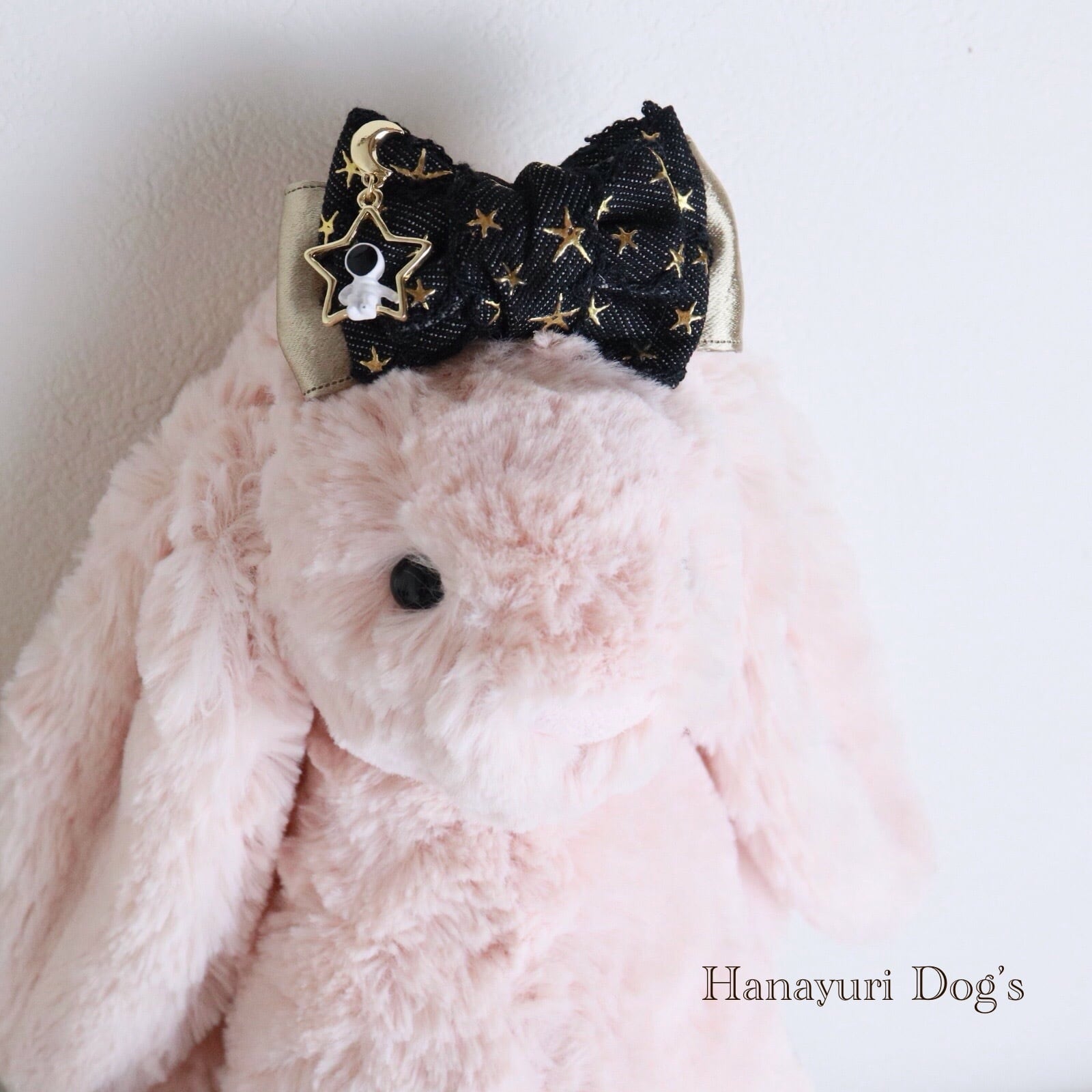 デニムブラック×ゴールド 宇宙飛行士 月と星 犬バレッタ キッズ・子供リボン 猫 ペット ヘアアクセサリー 髪飾り 普段着 うちの子記念日 誕生日 プレゼント オフ会 撮影 | Hanayuri Dog’s