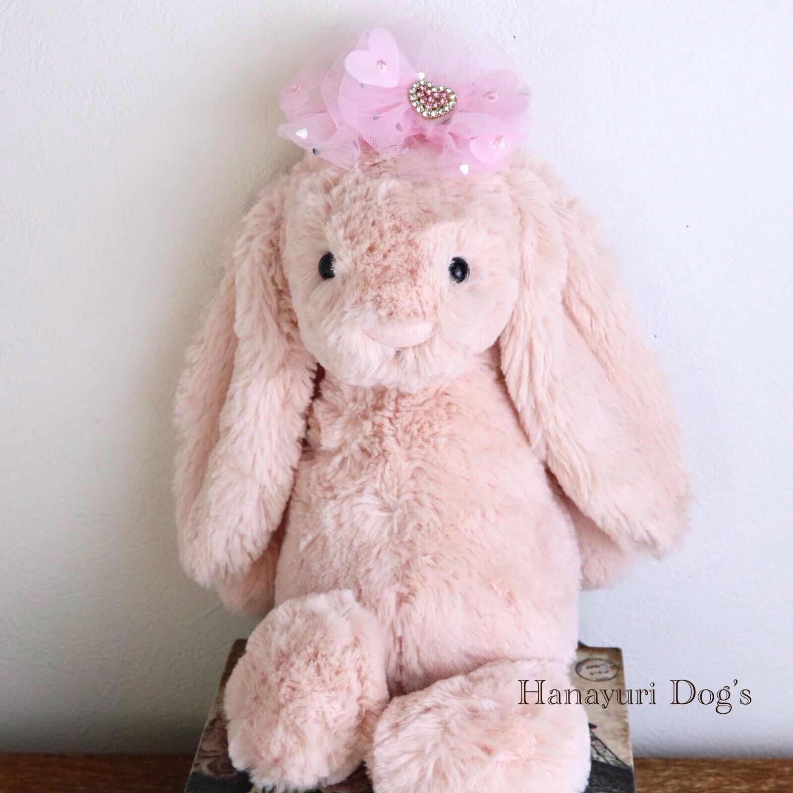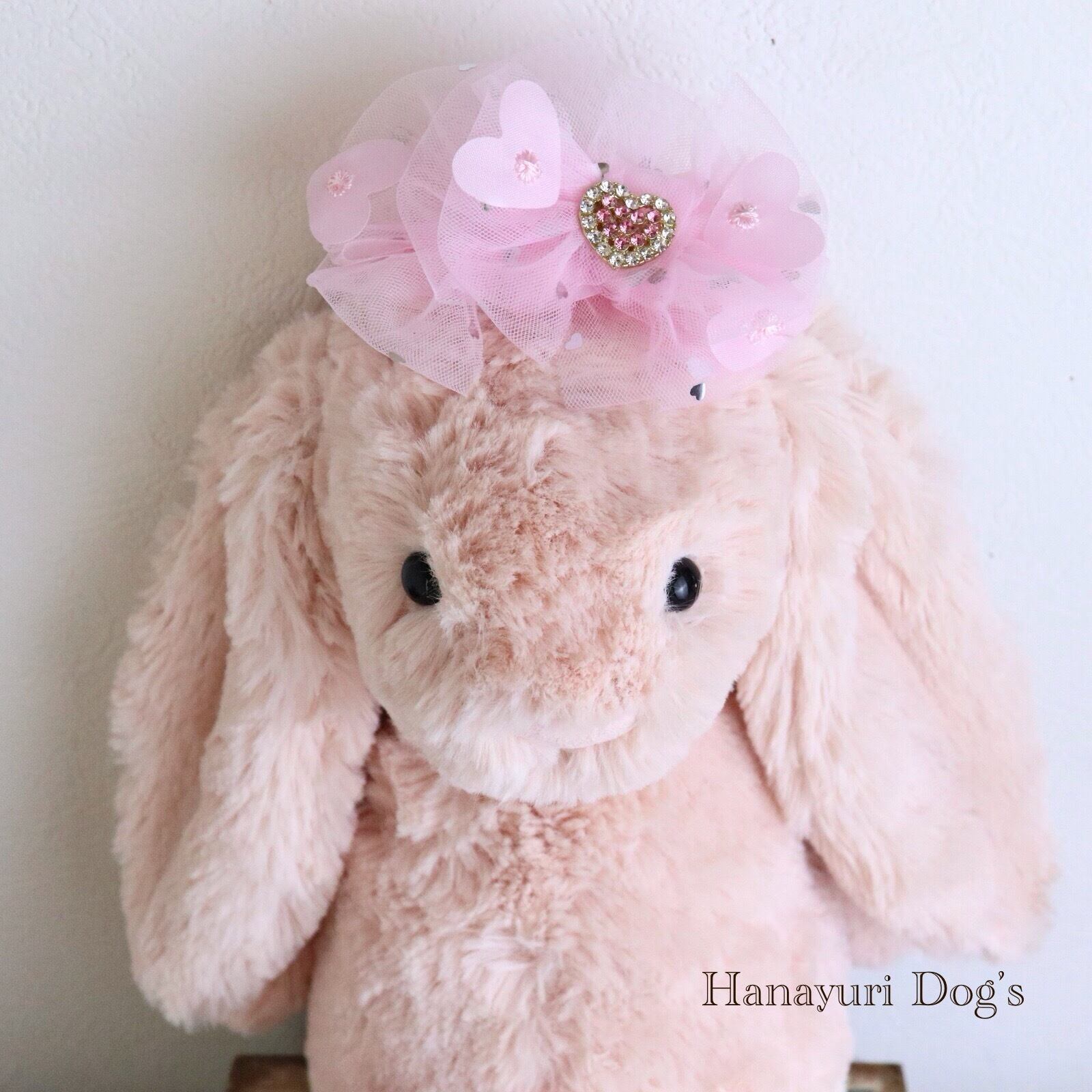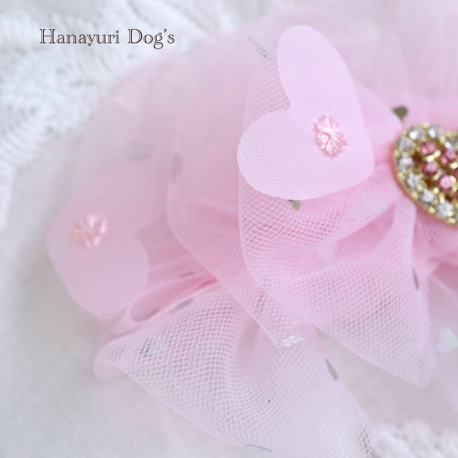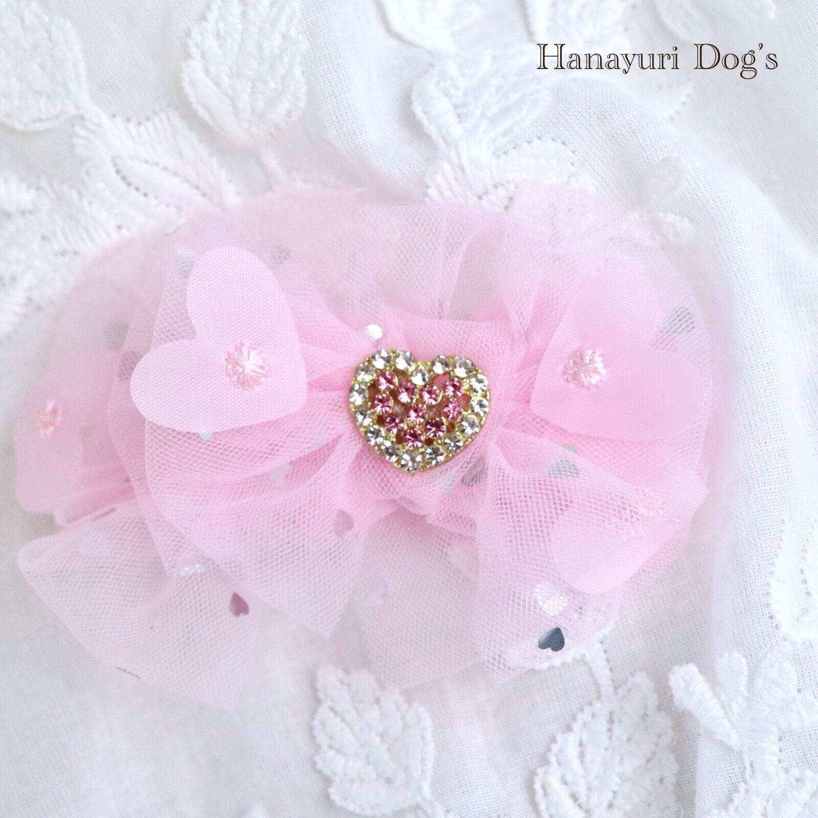 淡いピンクのチュールに銀の箔のきらめきがきれいなハート、そして大き目なピンクのハートがちりばめられたキュートなリボン。