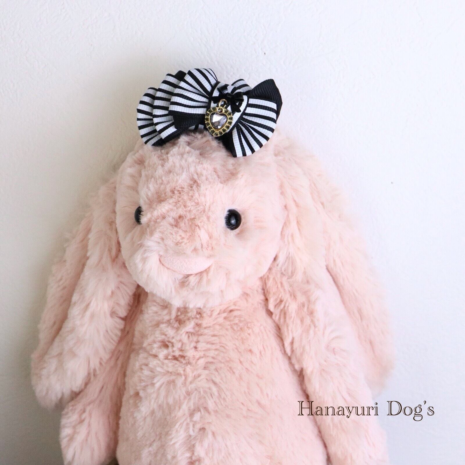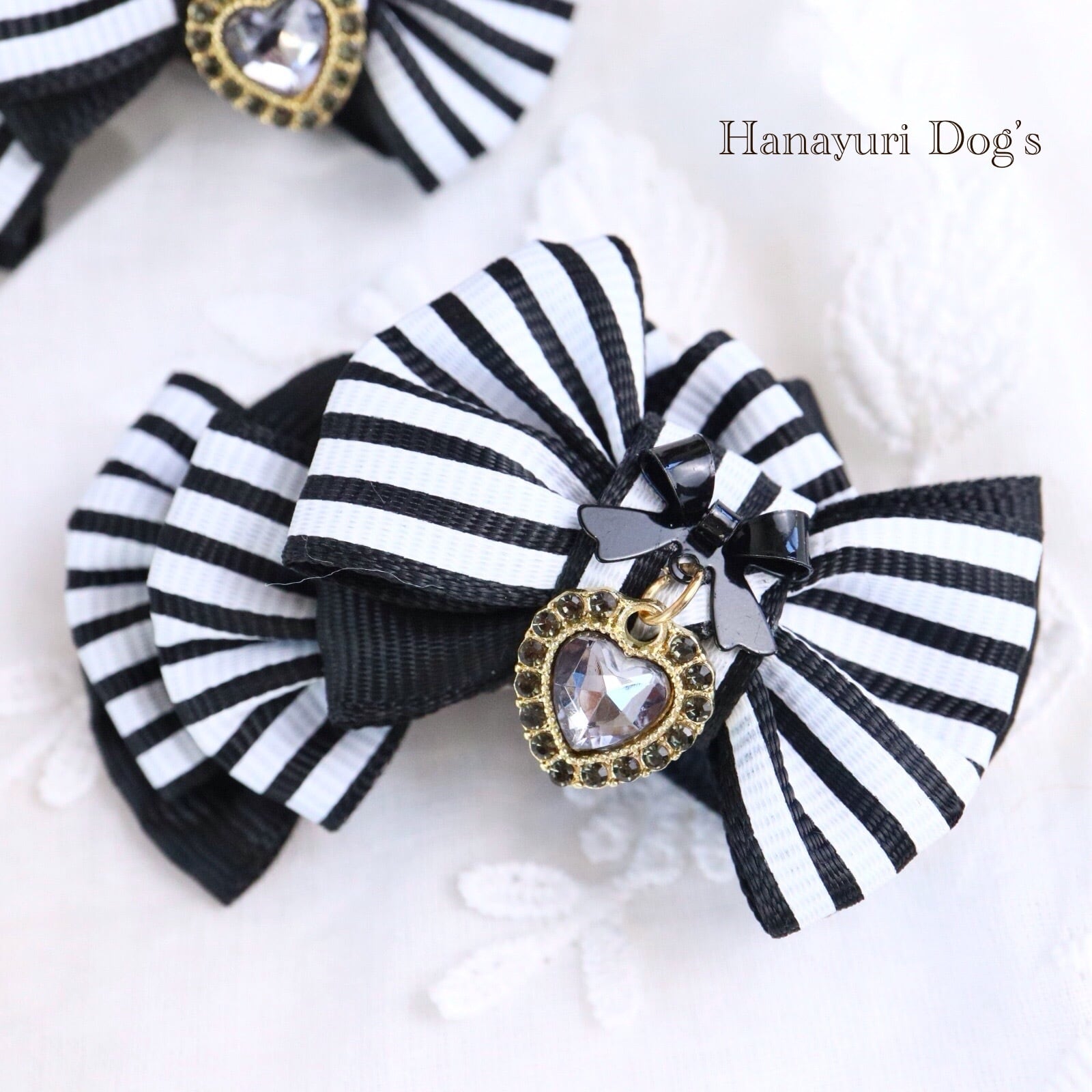 モノトーンコーデ ストライプ ハートビジュー モノクロ 白黒 犬バレッタ キッズ・子供リボン 猫 ペット ヘアアクセサリー 髪飾り うちの子記念日 誕生日 プレゼント オフ会 撮影 普段着 | Hanayuri Dog’s