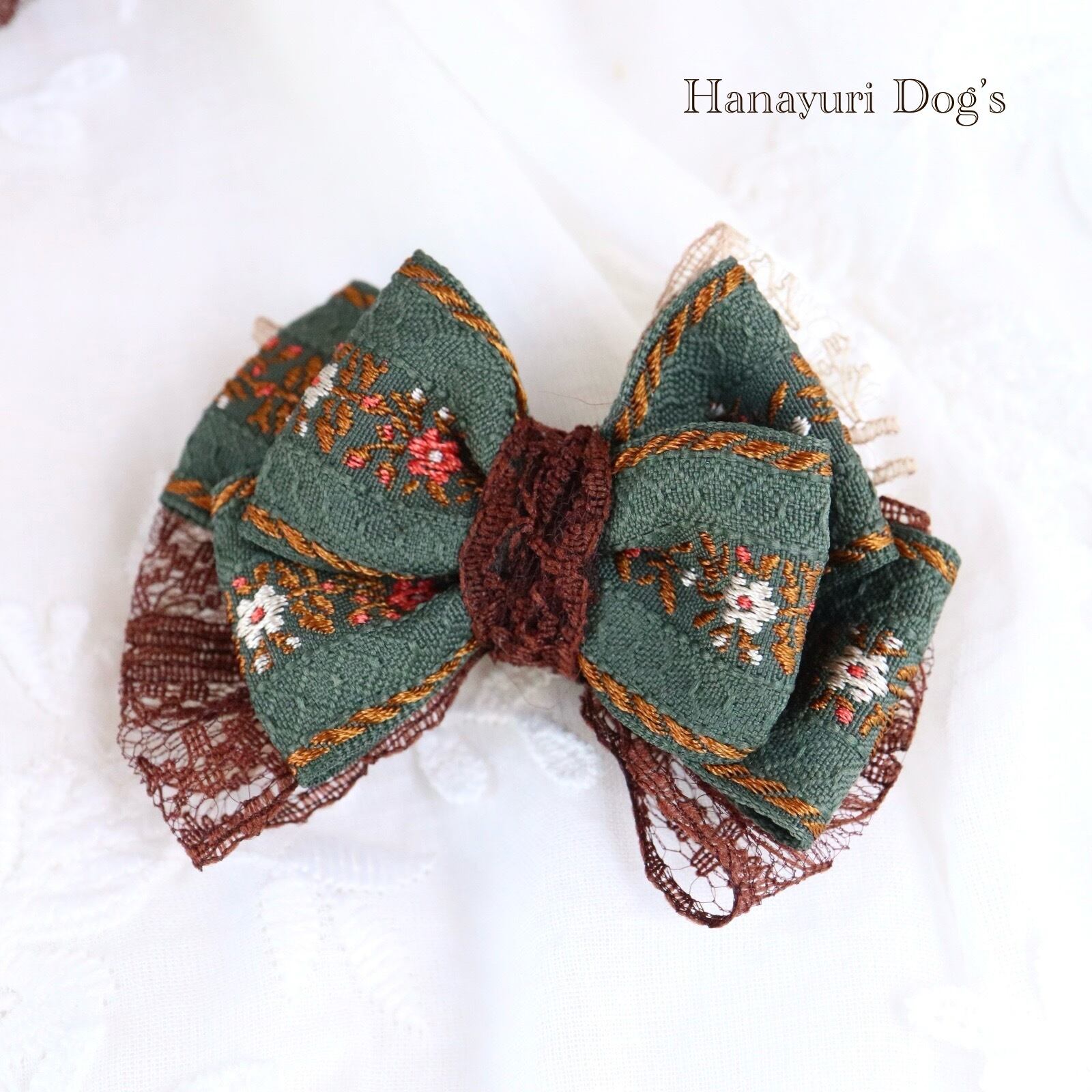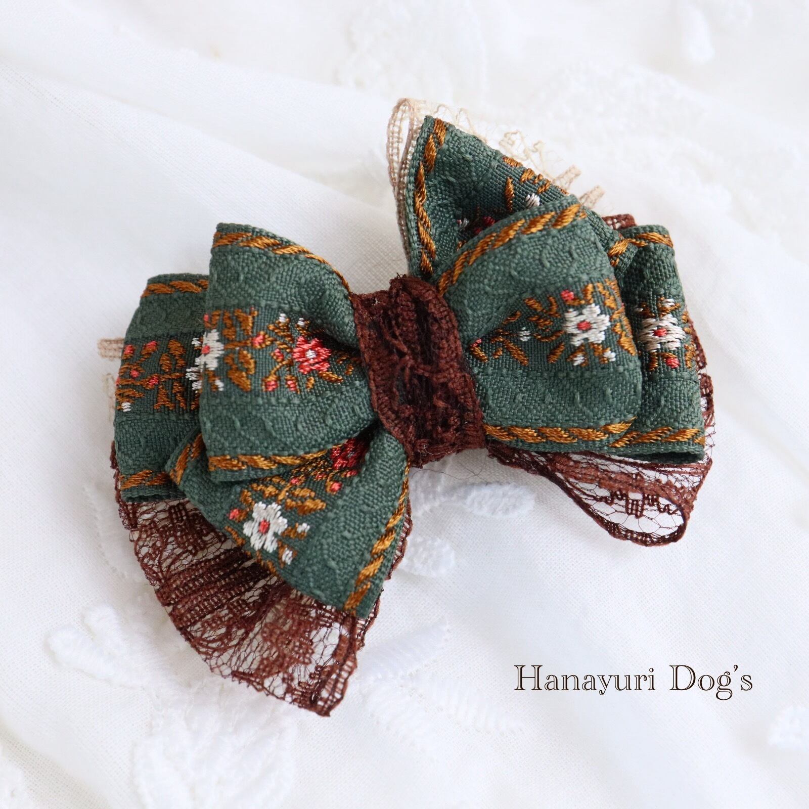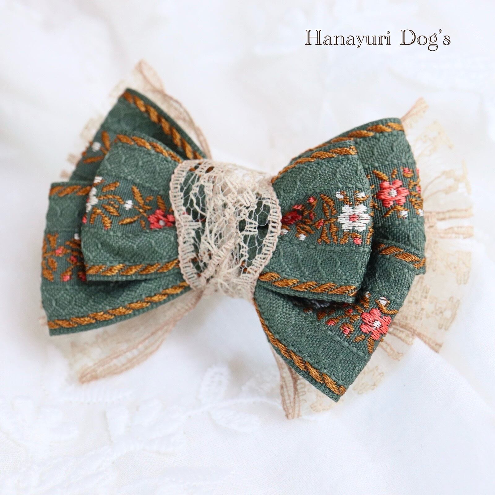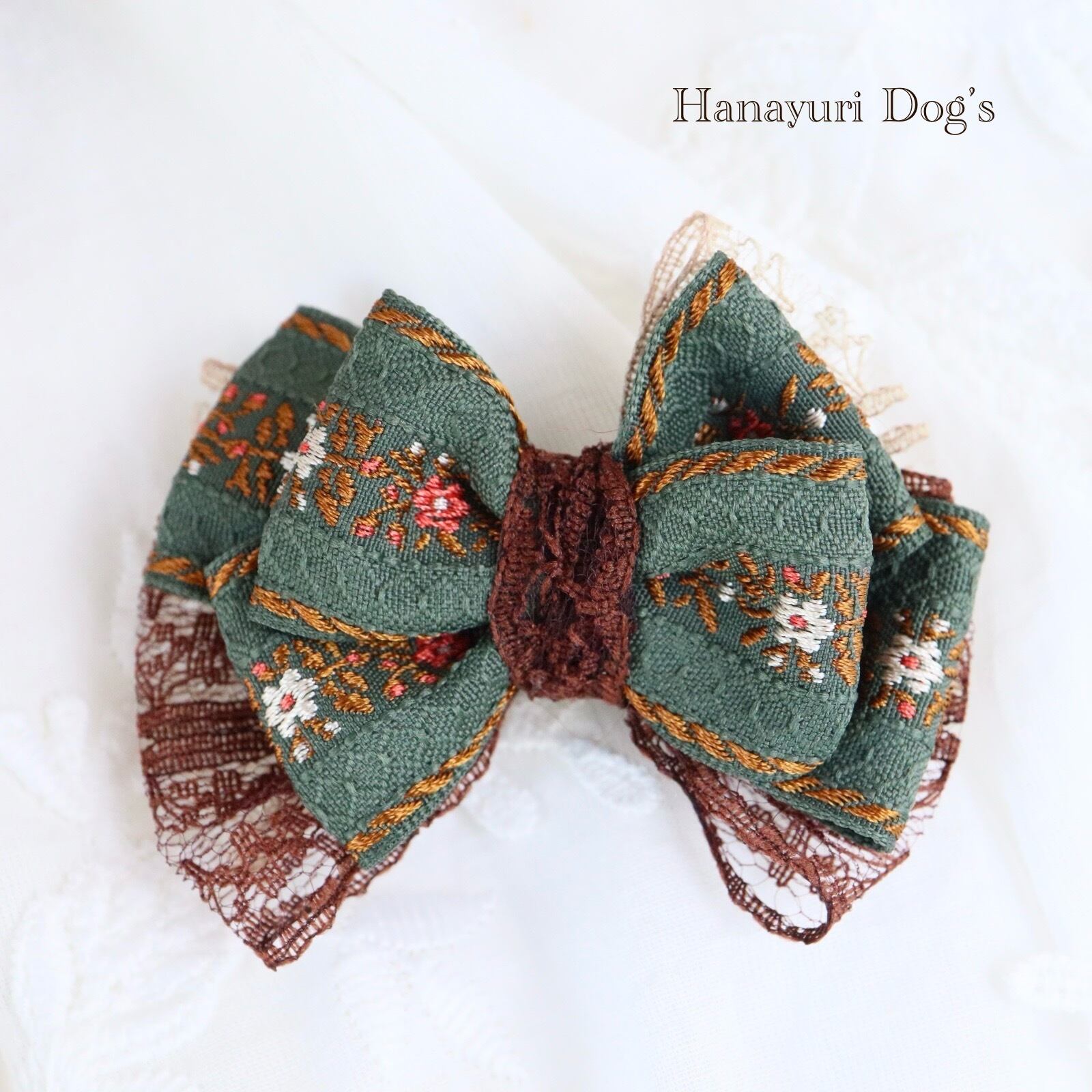 刺繍リボン レトログリーン ベージュまたはブラウン1P 犬バレッタ キッズ・子供リボン 猫 ペット ヘアアクセサリー 髪飾り 普段着 うちの子記念日 誕生日 プレゼント オフ会 撮影 | Hanayuri Dog’s