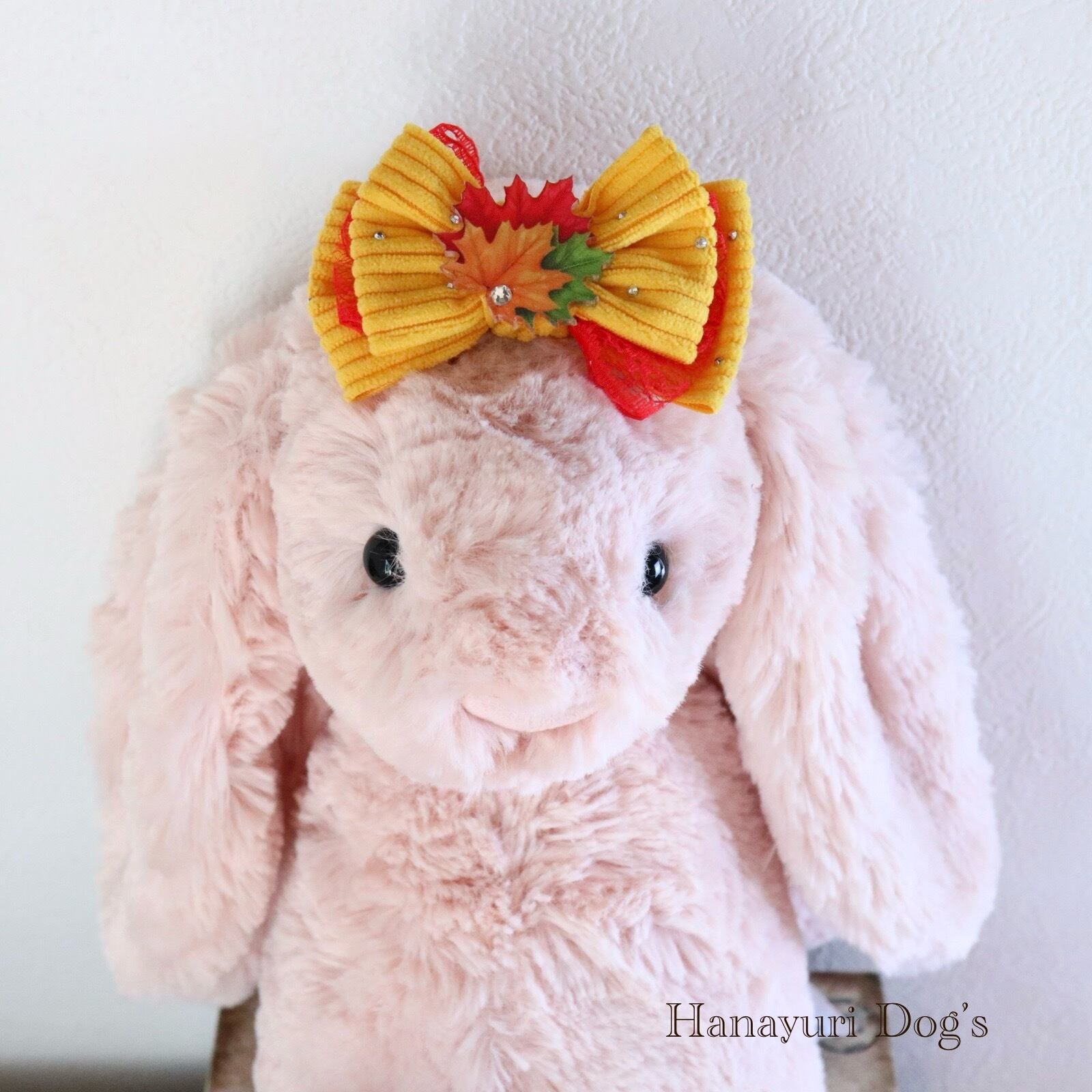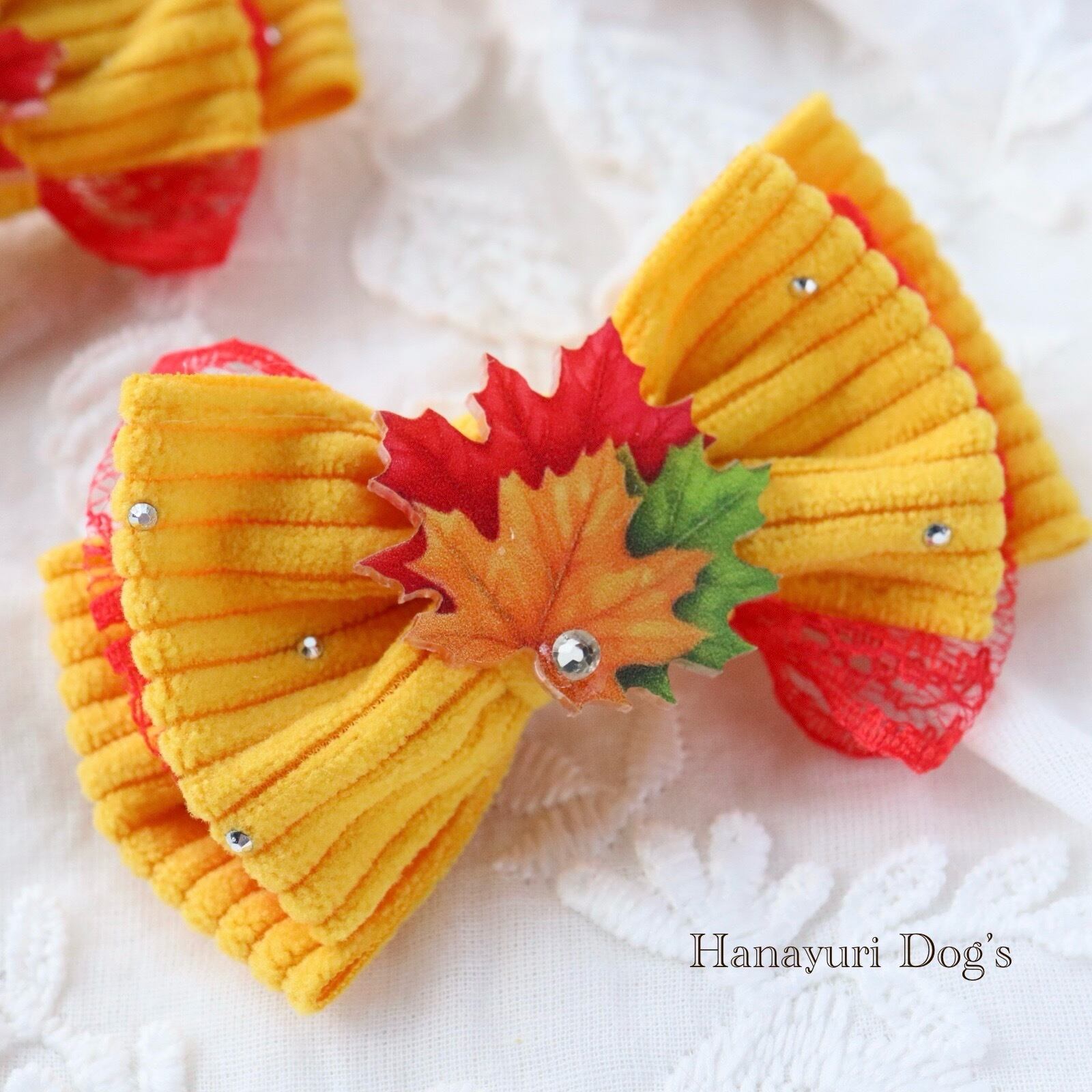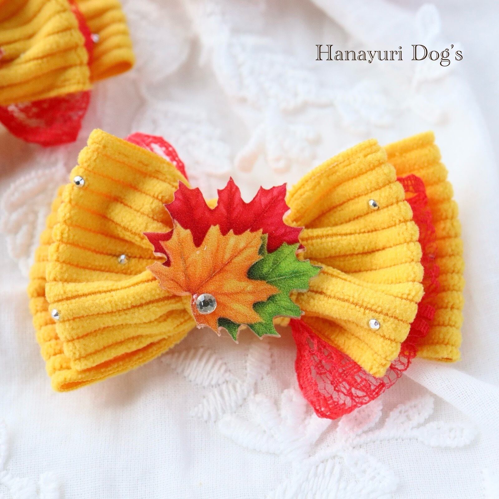 コーデュロイ 黄色×赤 紅葉 もみじ 秋 犬バレッタ キッズ・子供リボン 猫 ペット ヘアアクセサリー 髪飾り 普段着 うちの子記念日 誕生日 プレゼント オフ会 撮影 | Hanayuri Dog’s