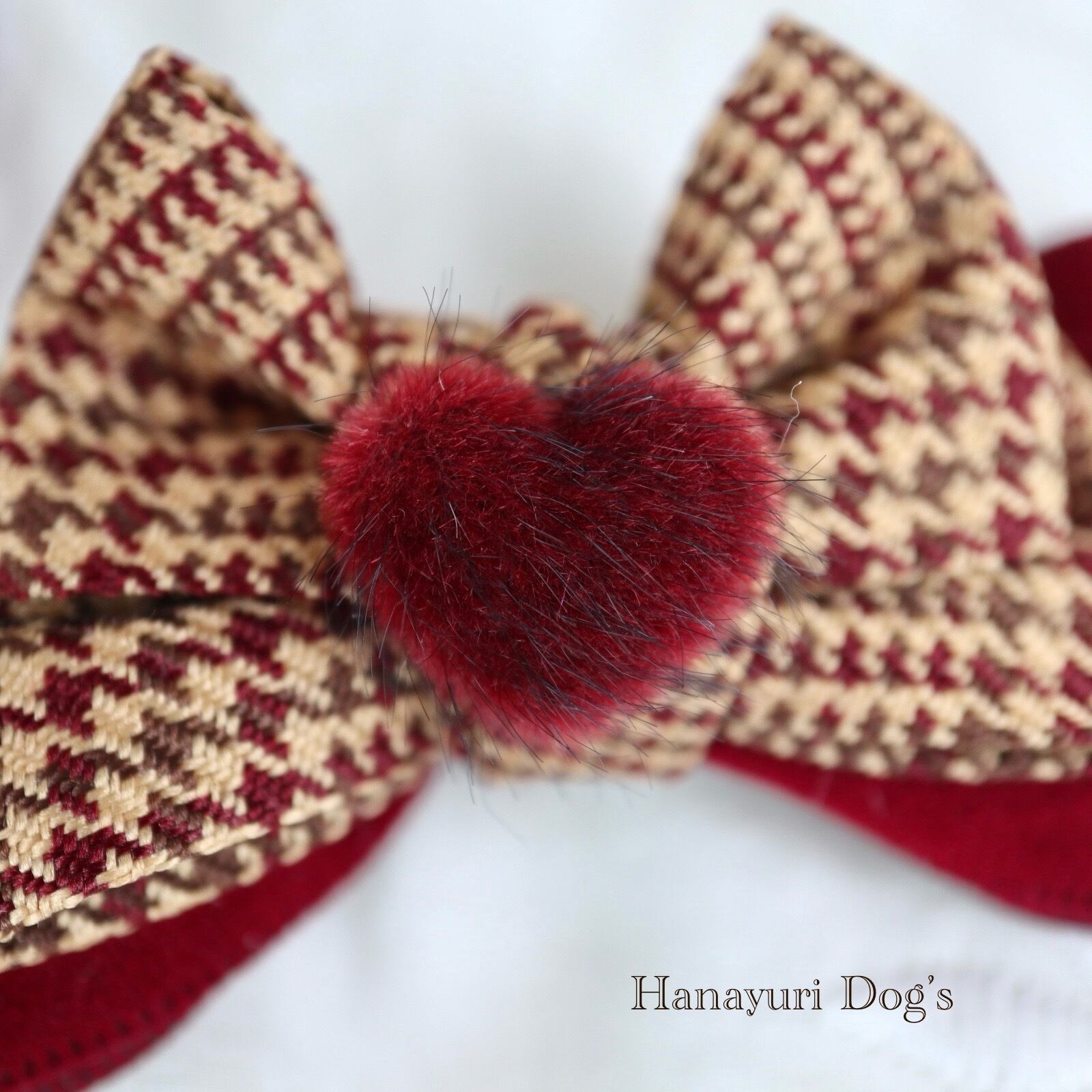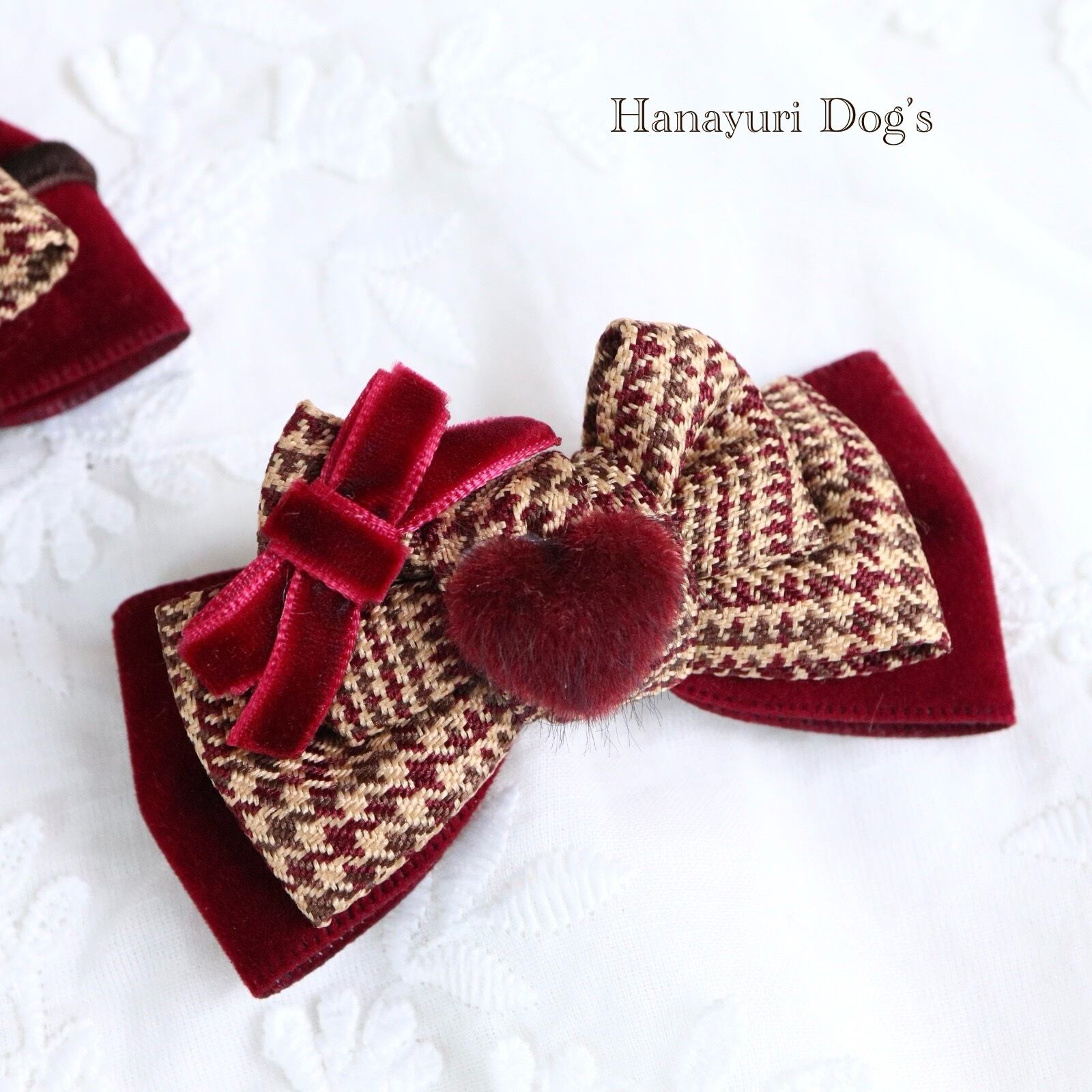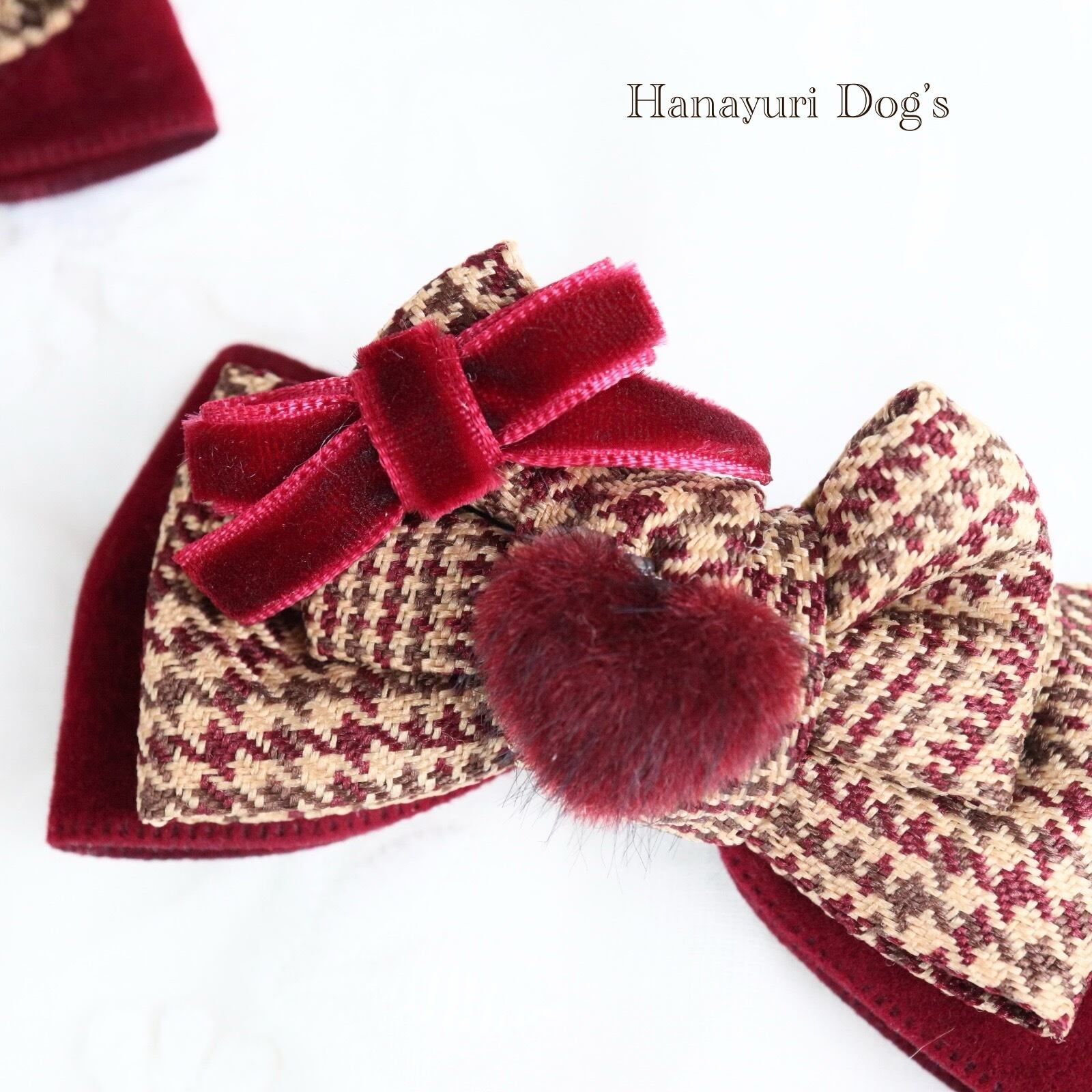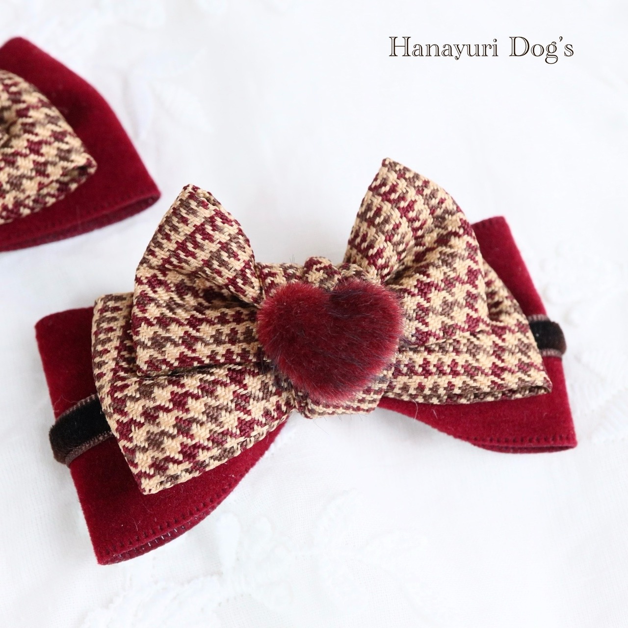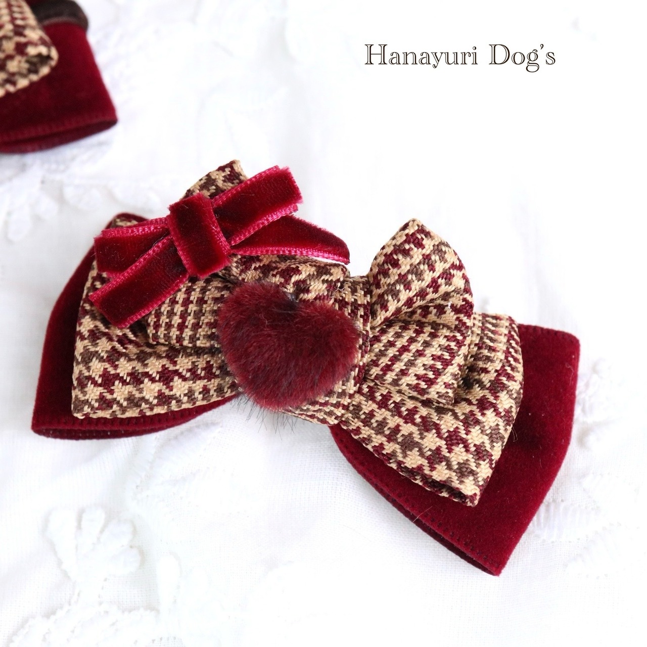 変わり格子 2種1P 千鳥格子 チェック スコティッシュ ワインレッド 異素材 スエード ハート 犬バレッタ キッズ・子供リボン 猫 ペット ヘアアクセサリー 髪飾り 普段着 うちの子記念日 誕生日 プレゼント オフ会 撮影 | Hanayuri Dog’s