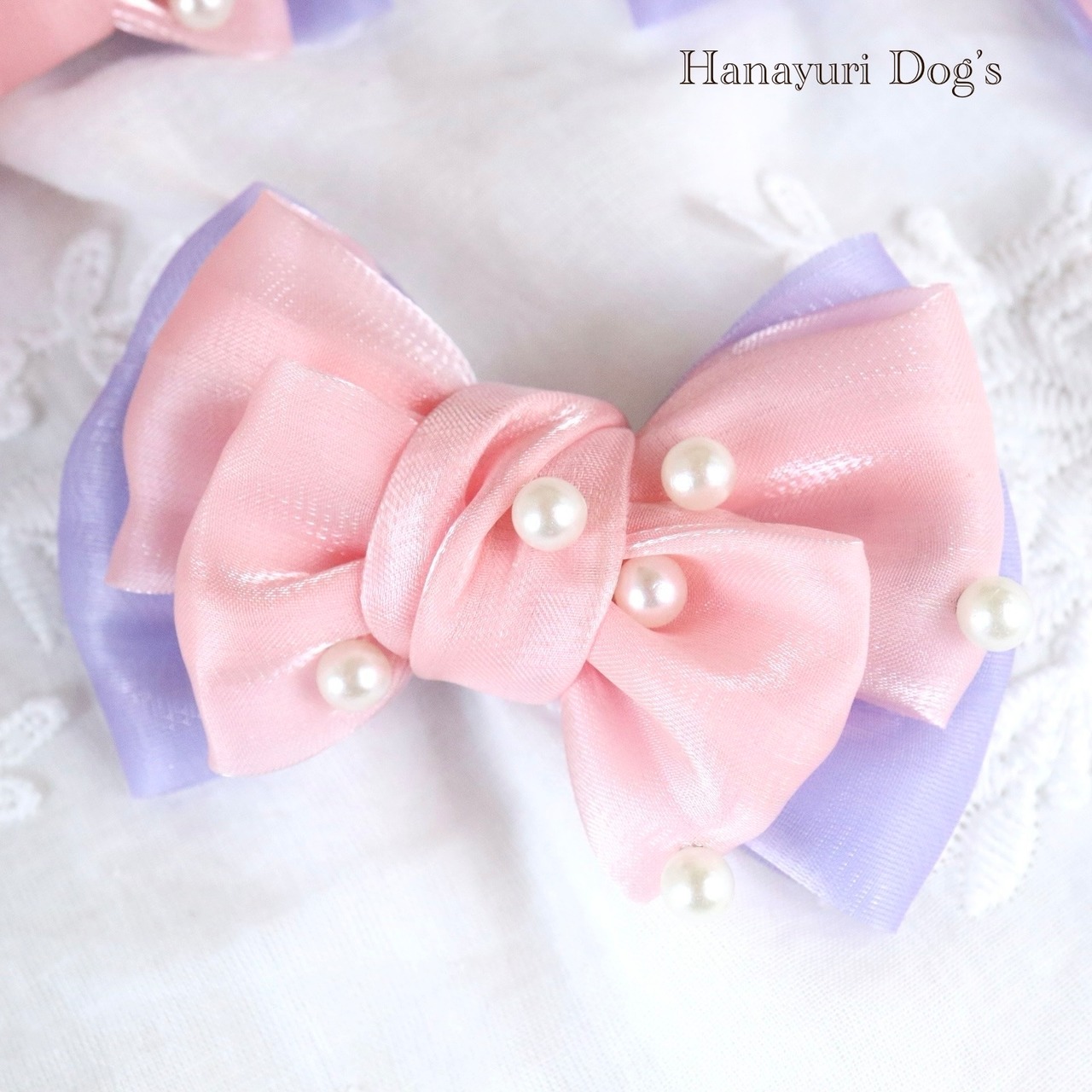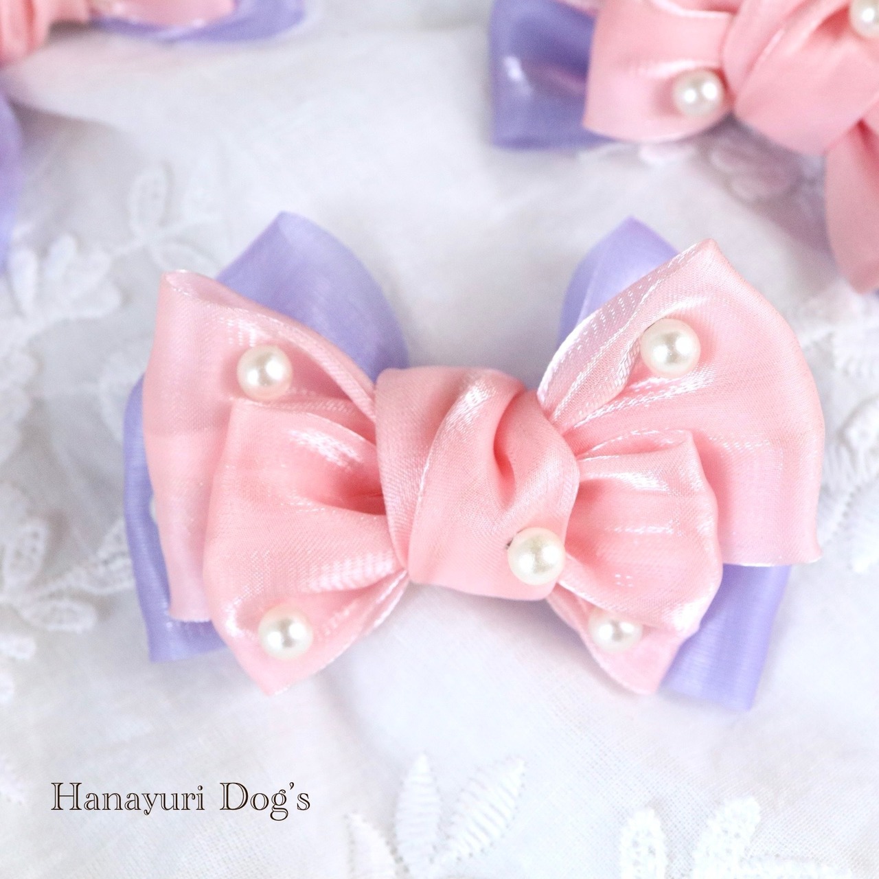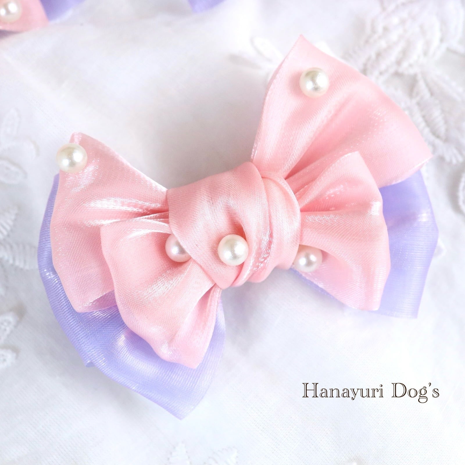 ピンクと紫のエレガントコンビにパールが散りばめられたバレッタリボンです。