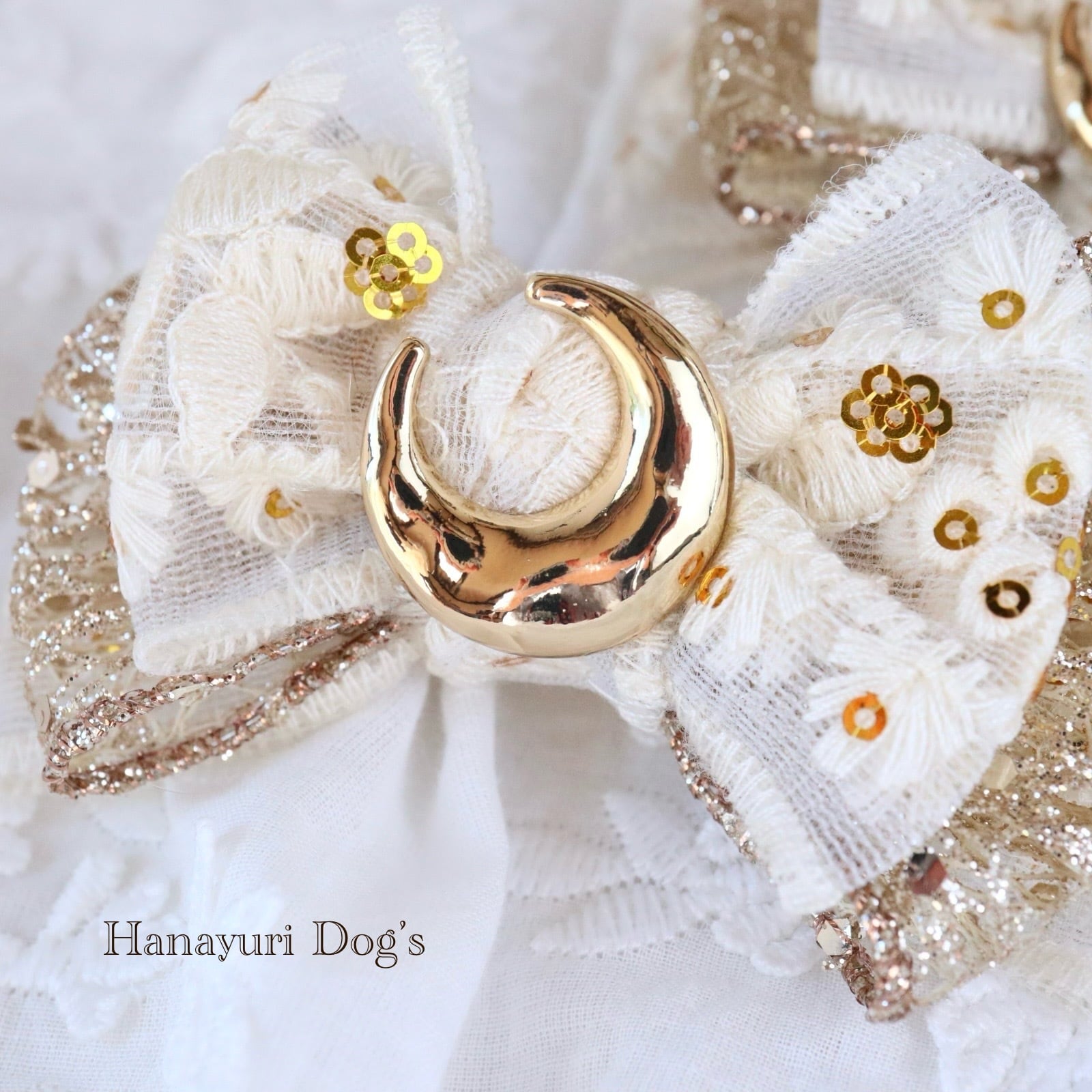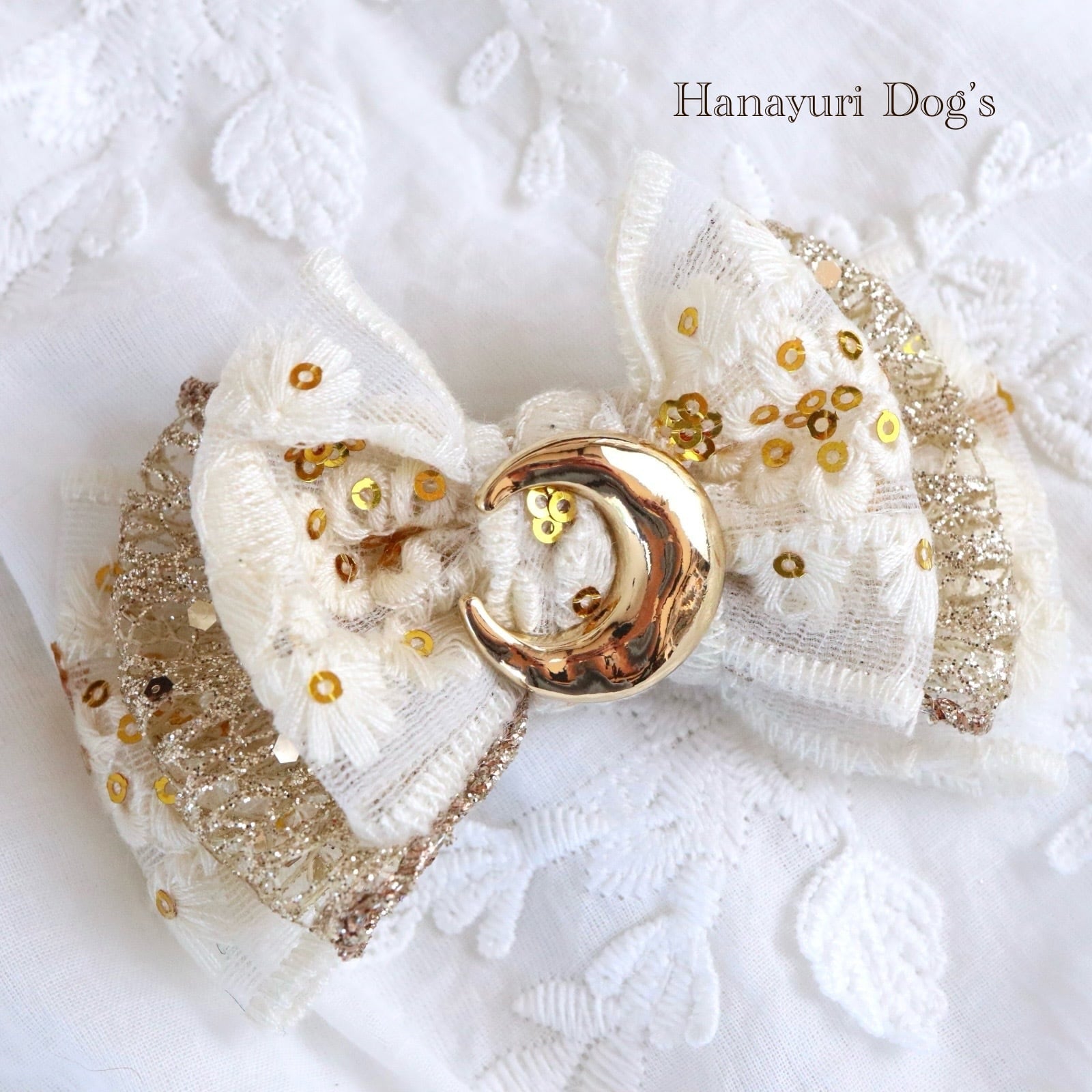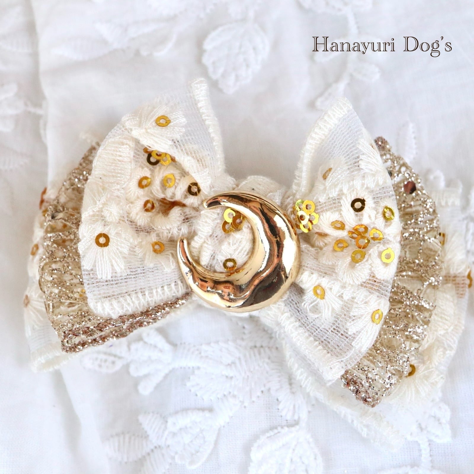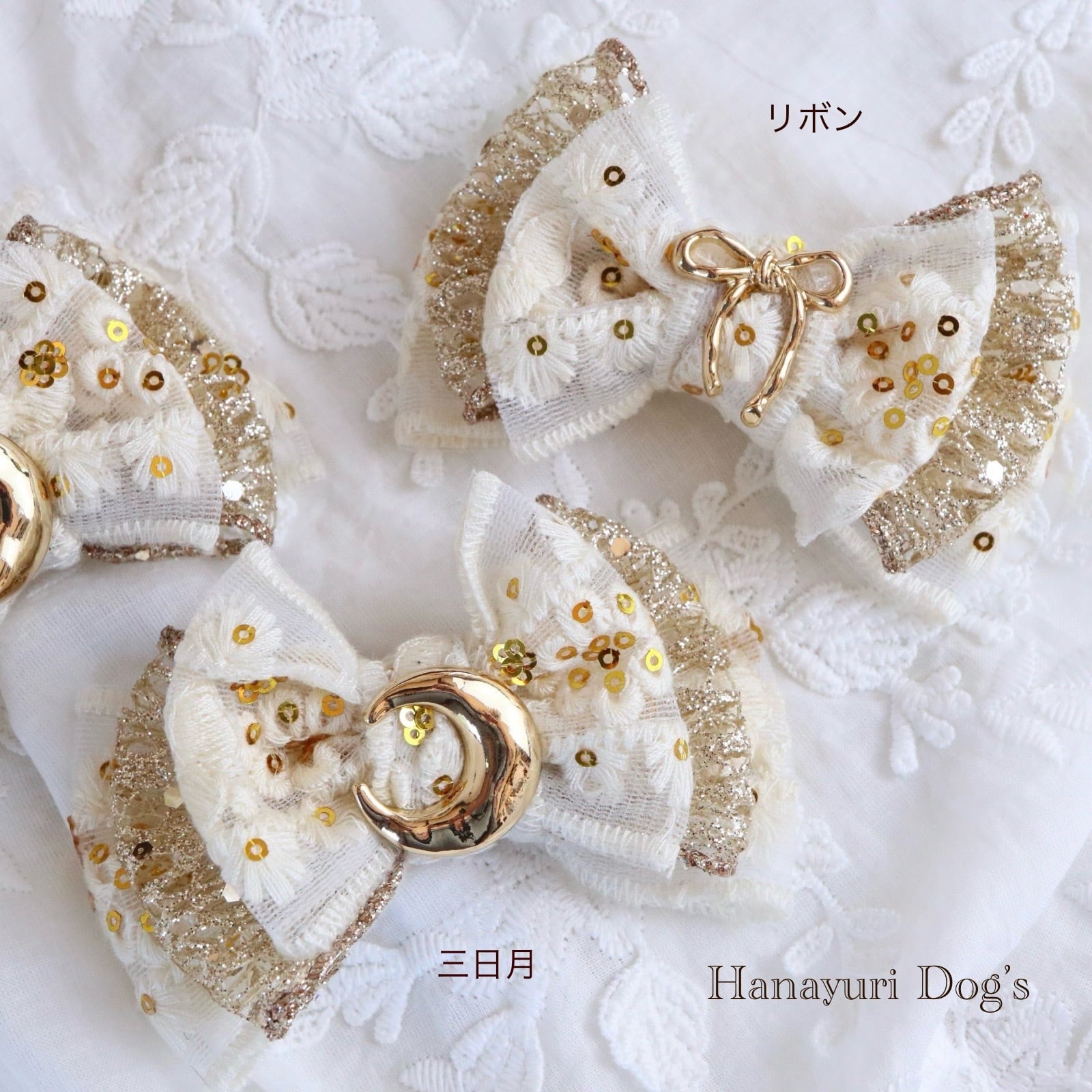 レース刺繍とスパンコール ゴールド 三日月またはリボンビジュー 犬バレッタ キッズ・子供リボン 猫 ペット ヘアアクセサリー 髪飾り 普段着 うちの子記念日 誕生日 プレゼント オフ会 イベント 撮影 | Hanayuri Dog’s