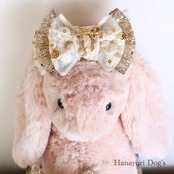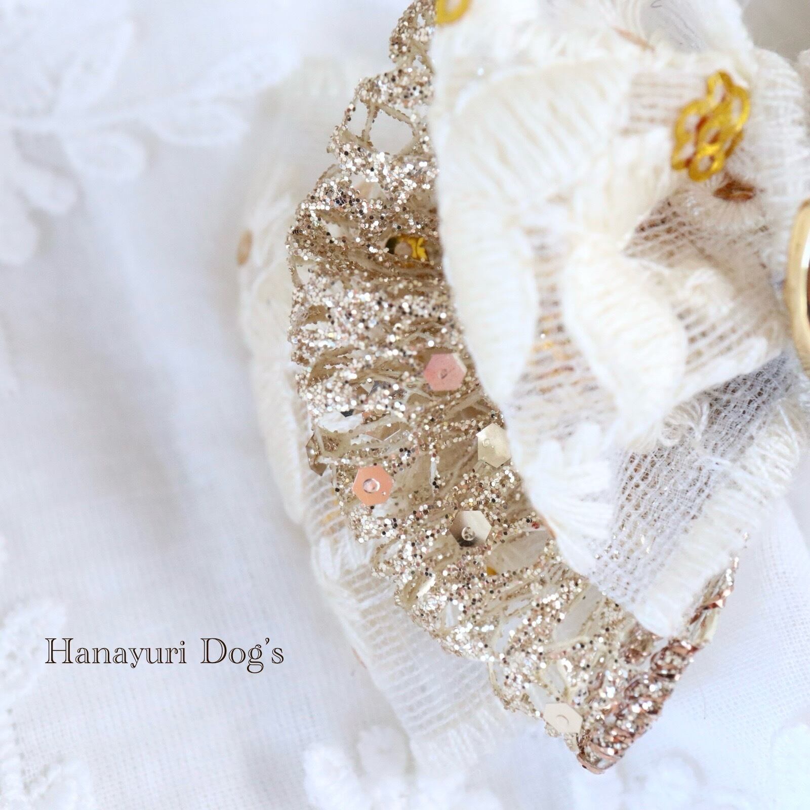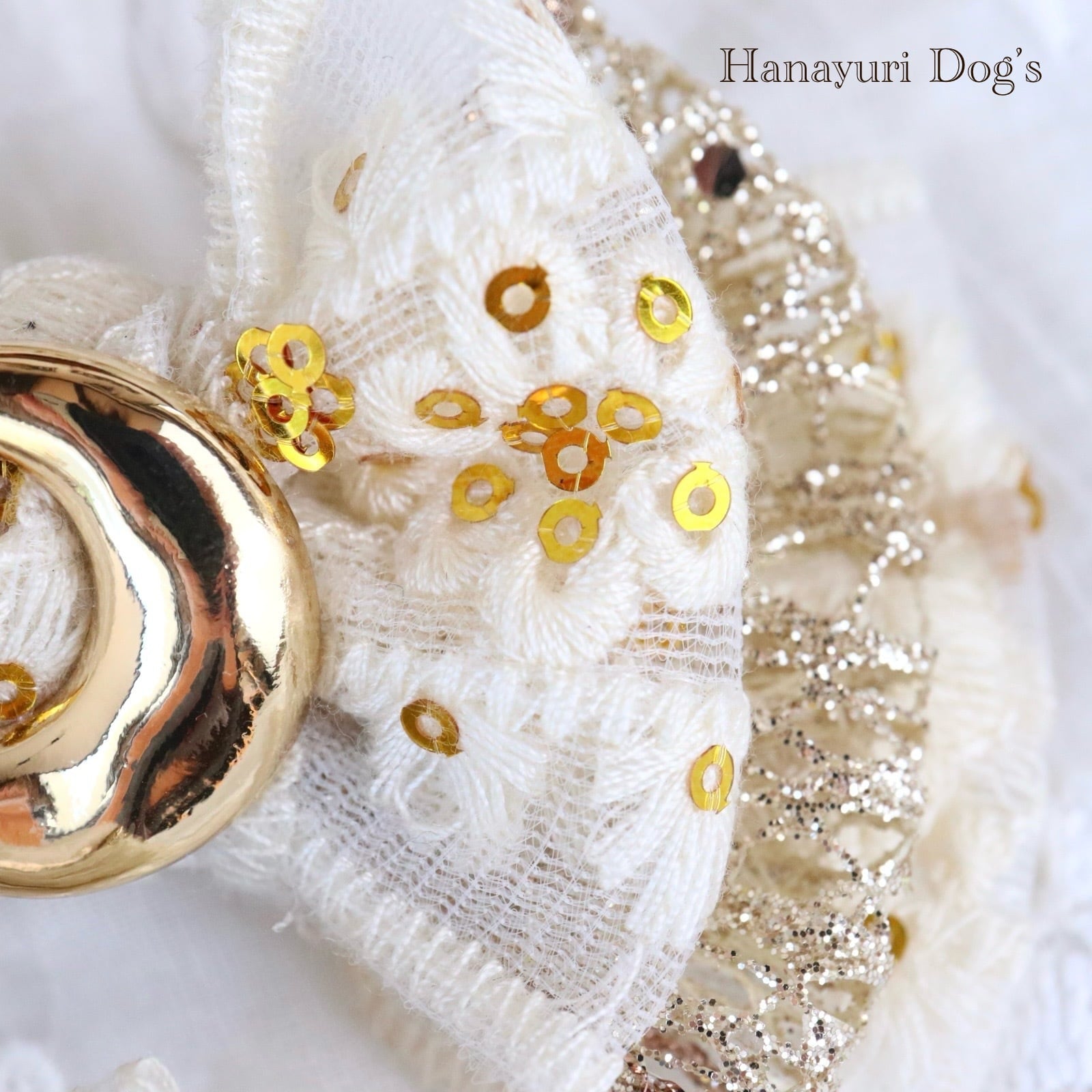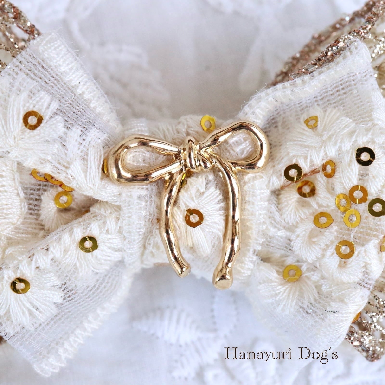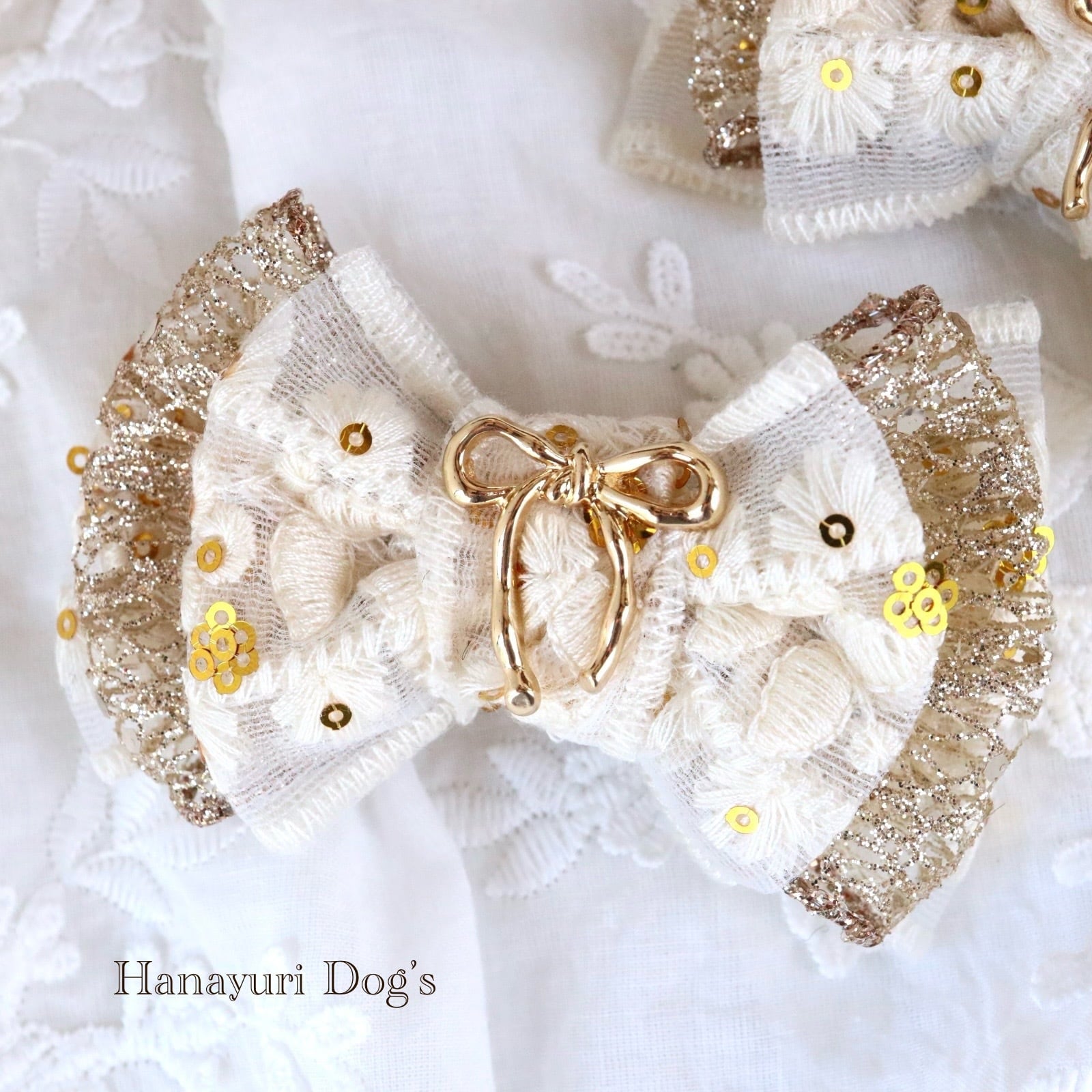 レース刺繍とスパンコール ゴールド 三日月またはリボンビジュー 犬バレッタ キッズ・子供リボン 猫 ペット ヘアアクセサリー 髪飾り 普段着 うちの子記念日 誕生日 プレゼント オフ会 イベント 撮影 | Hanayuri Dog’s