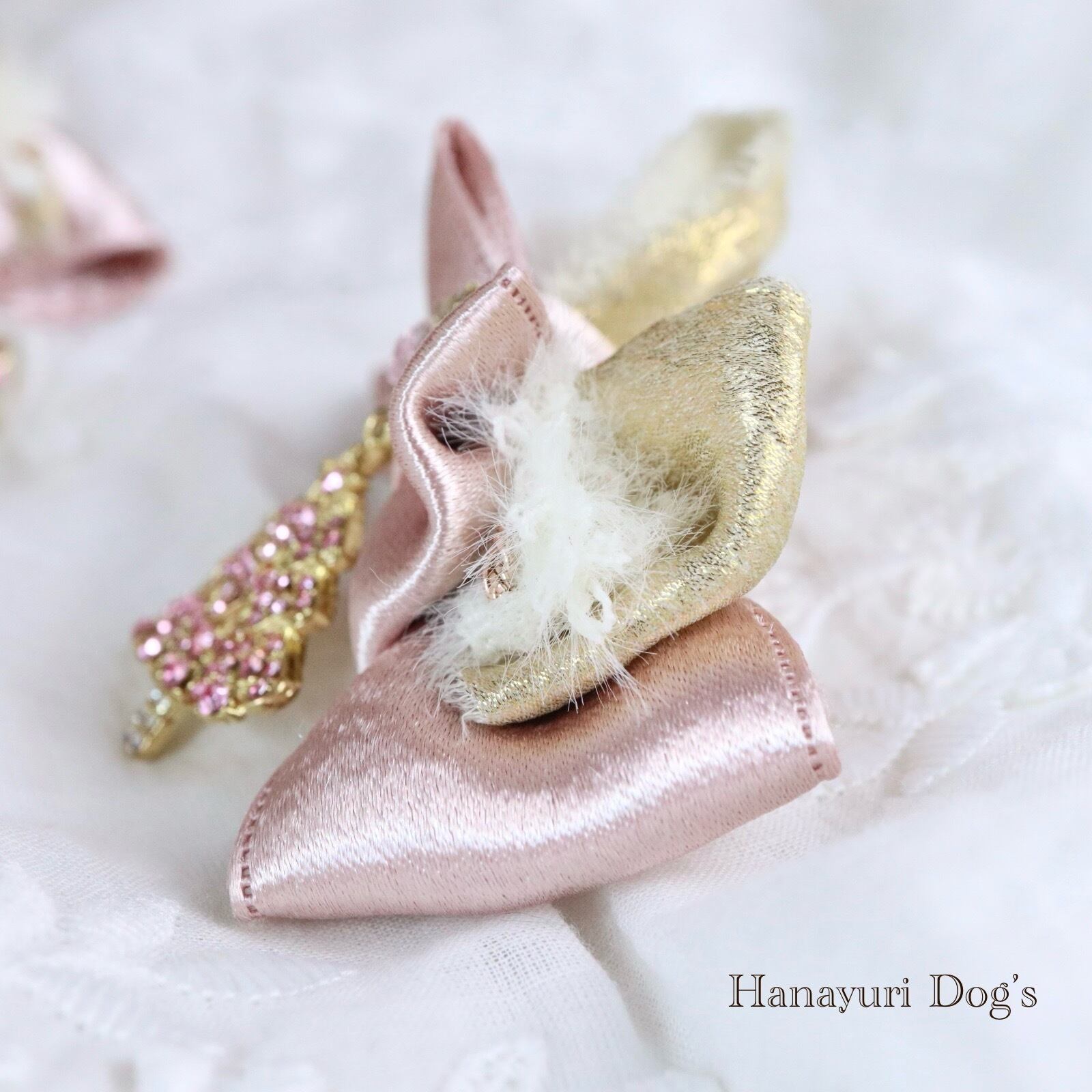 ゴールドの箔リボンとゴールドラインが入ったファーを覗かせて柔らかな煌びやかさをプラス。