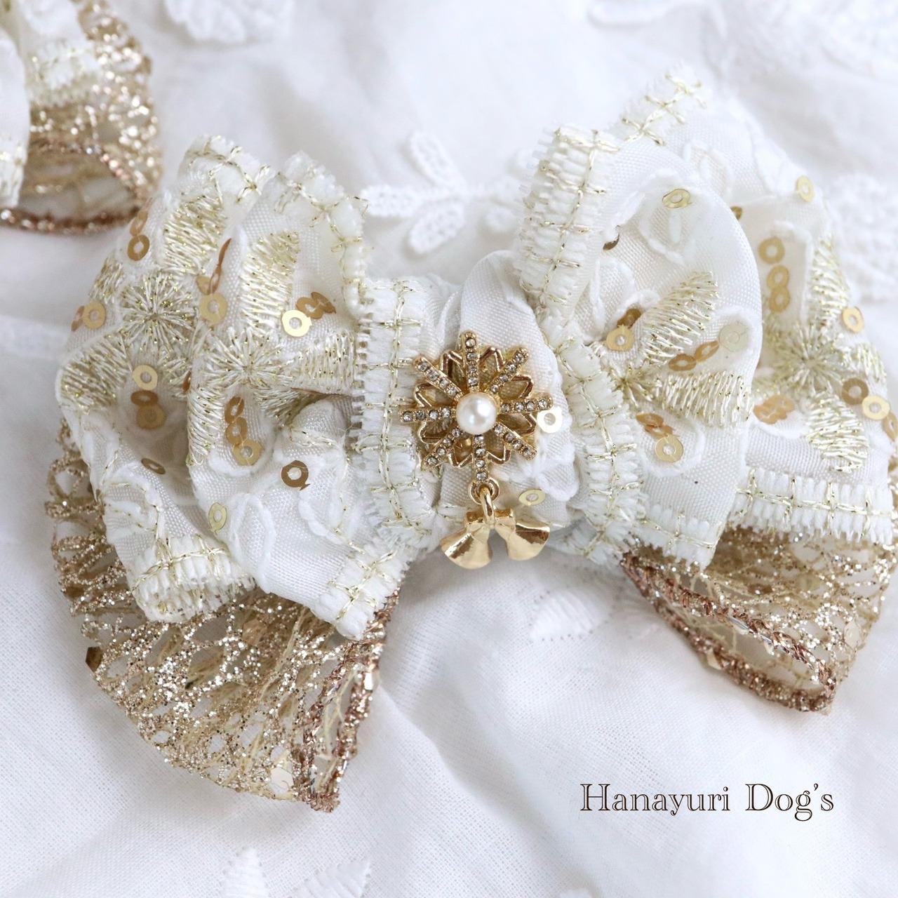スパンコール刺繍 ゴールド 雪の結晶とベルビジュー クリスマス 冬 犬バレッタ キッズ・子供リボン 猫 ペット ヘアアクセサリー 髪飾り 普段着 うちの子記念日 誕生日 プレゼント オフ会 イベント 撮影 | Hanayuri Dog’s