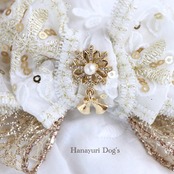 豪華な刺繍とゴールドのスパンコールのリボンは、結んでしまうと分かりづらいですが雪の結晶模様。中央に施した雪の結晶とベルビジューとお揃いとなっております。