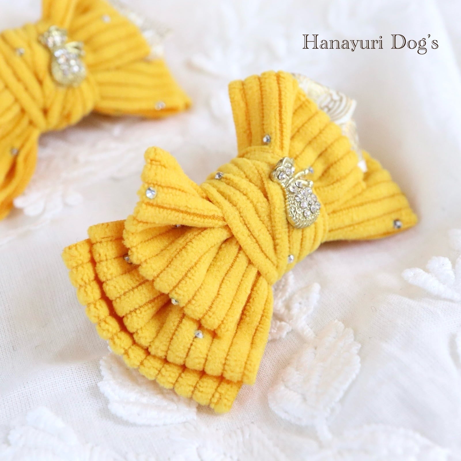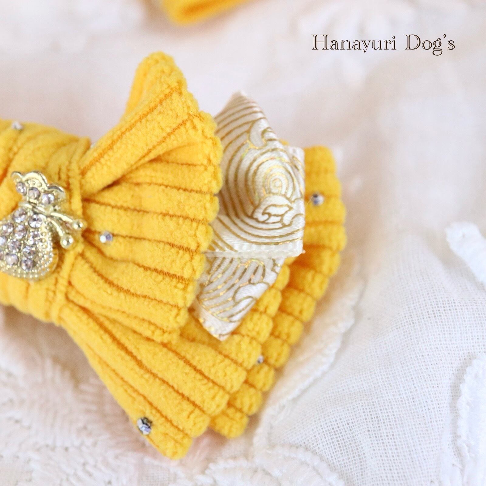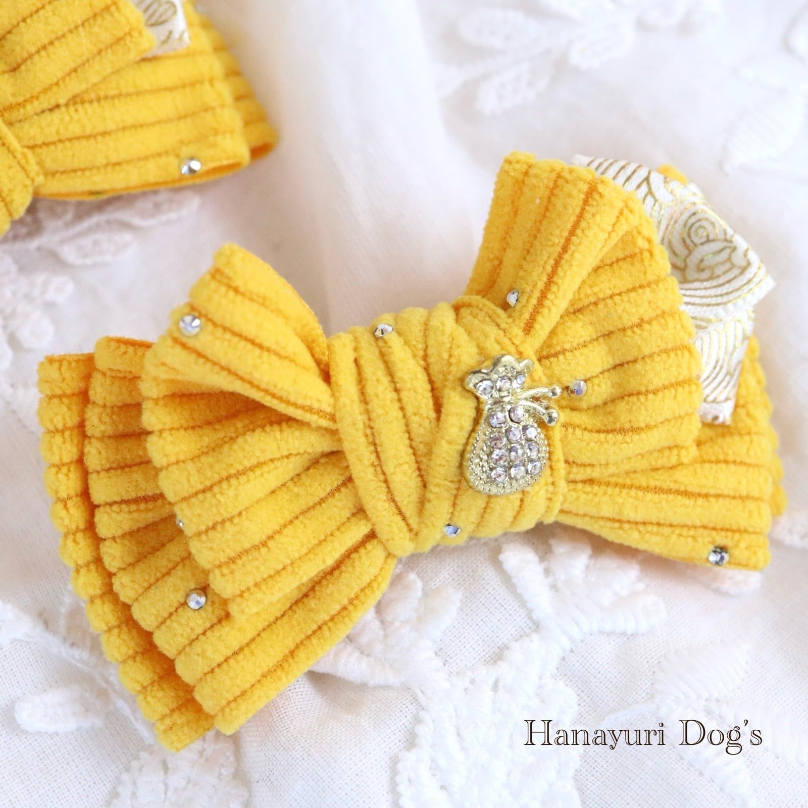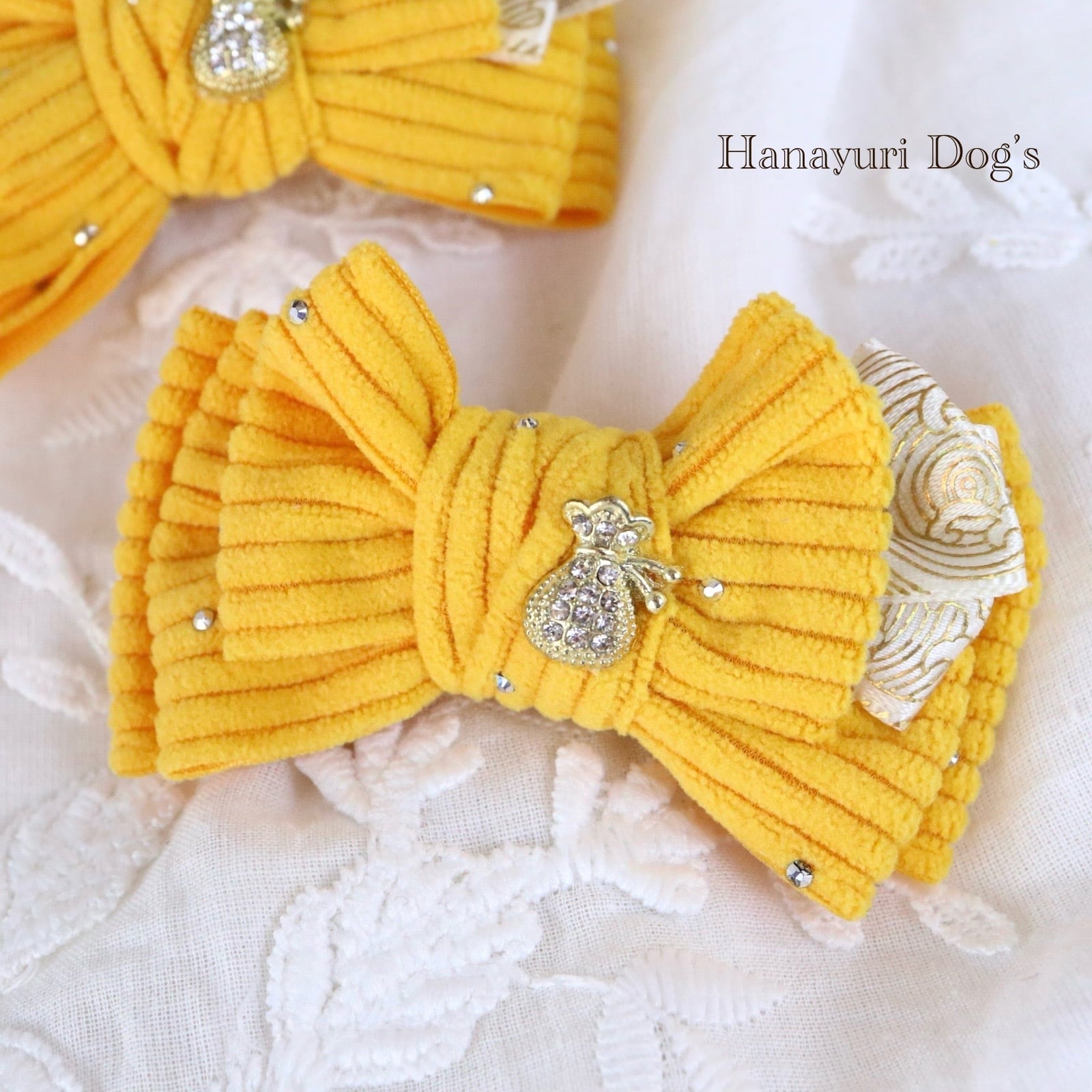 ラインストーンコーデュロイ 金の袋 お正月 冬 犬バレッタ キッズ・子供リボン 猫 ペット ヘアアクセサリー 髪飾り 普段着 うちの子記念日 誕生日 プレゼント オフ会 イベント 撮影 | Hanayuri Dog’s