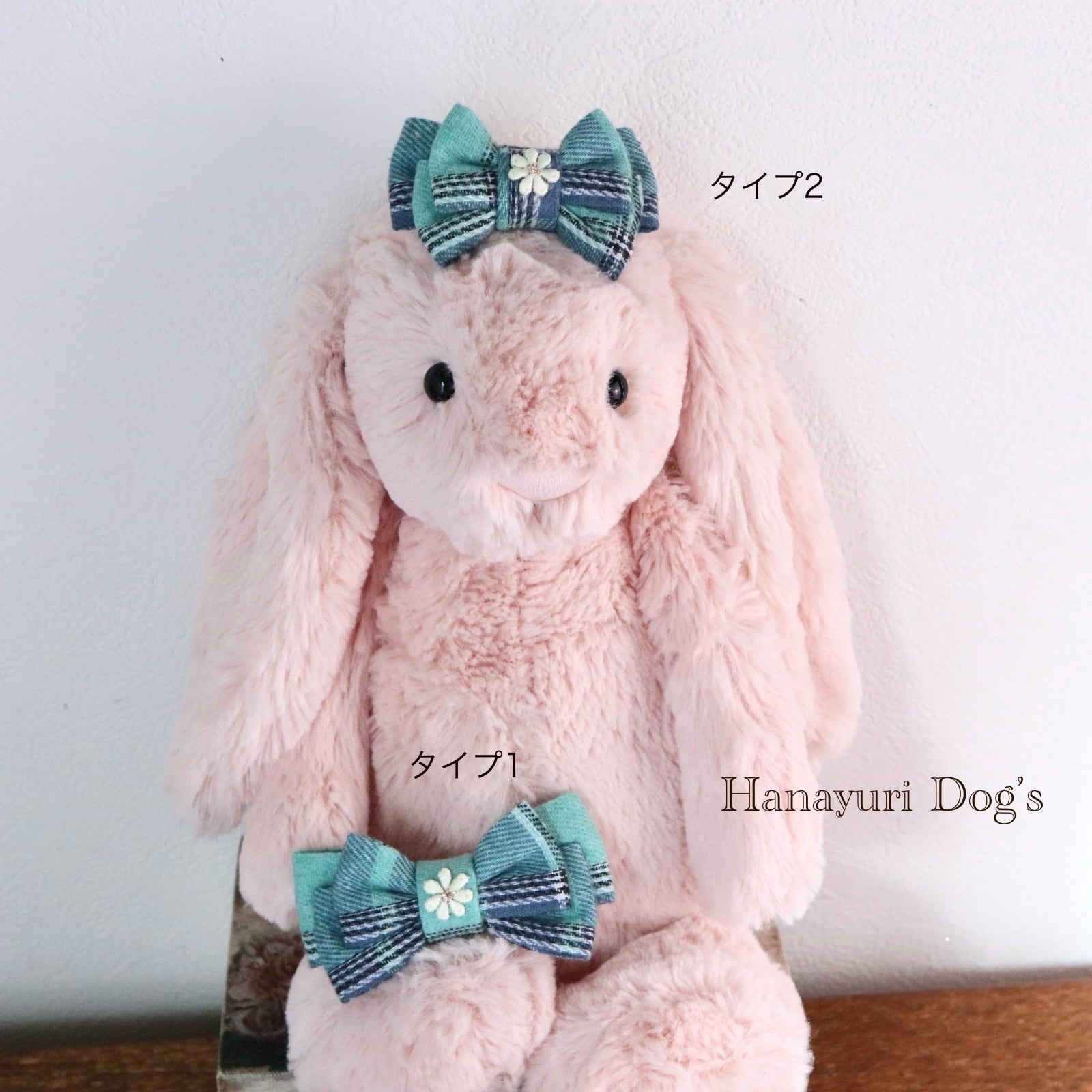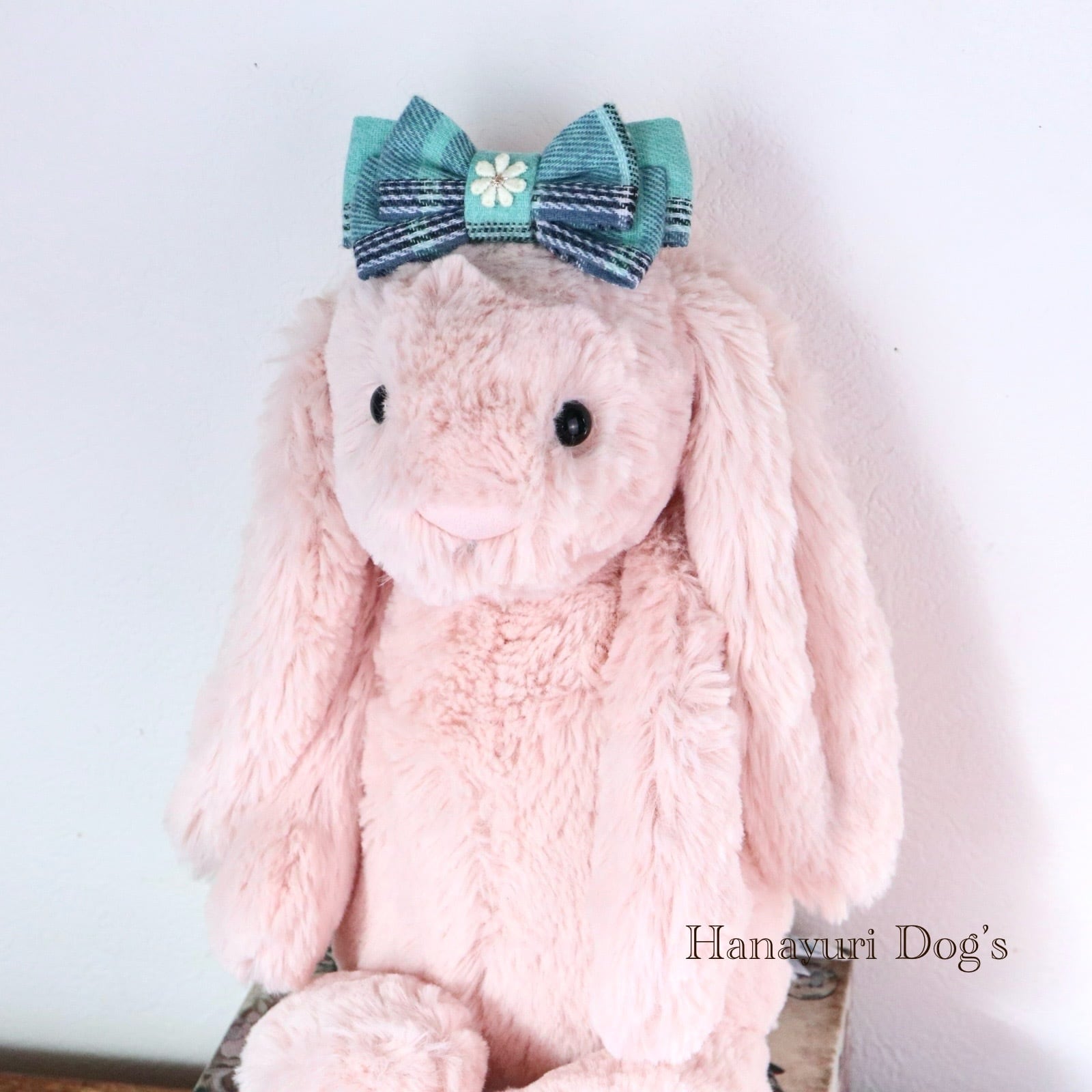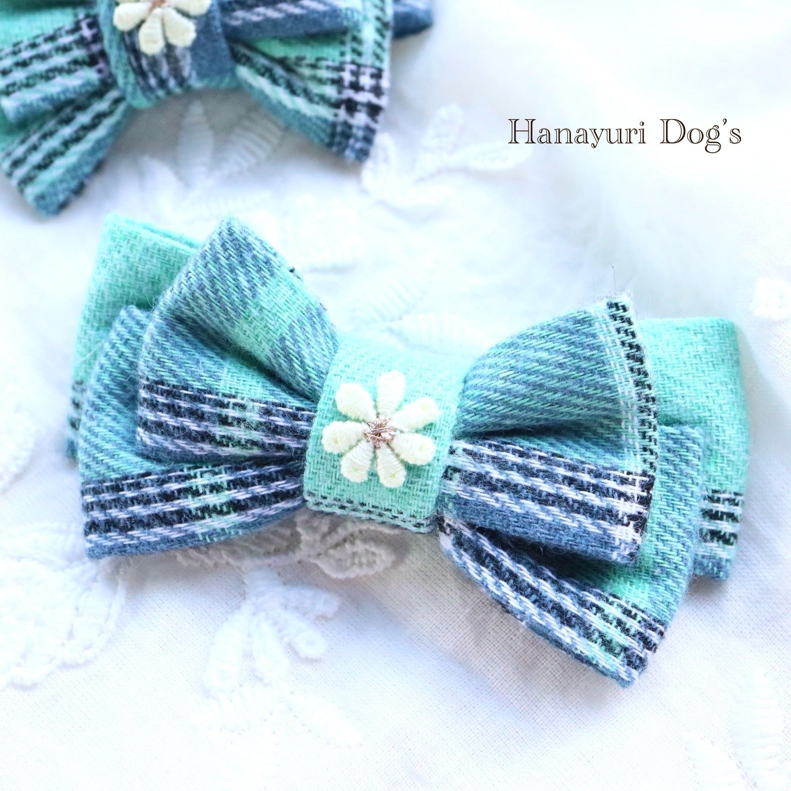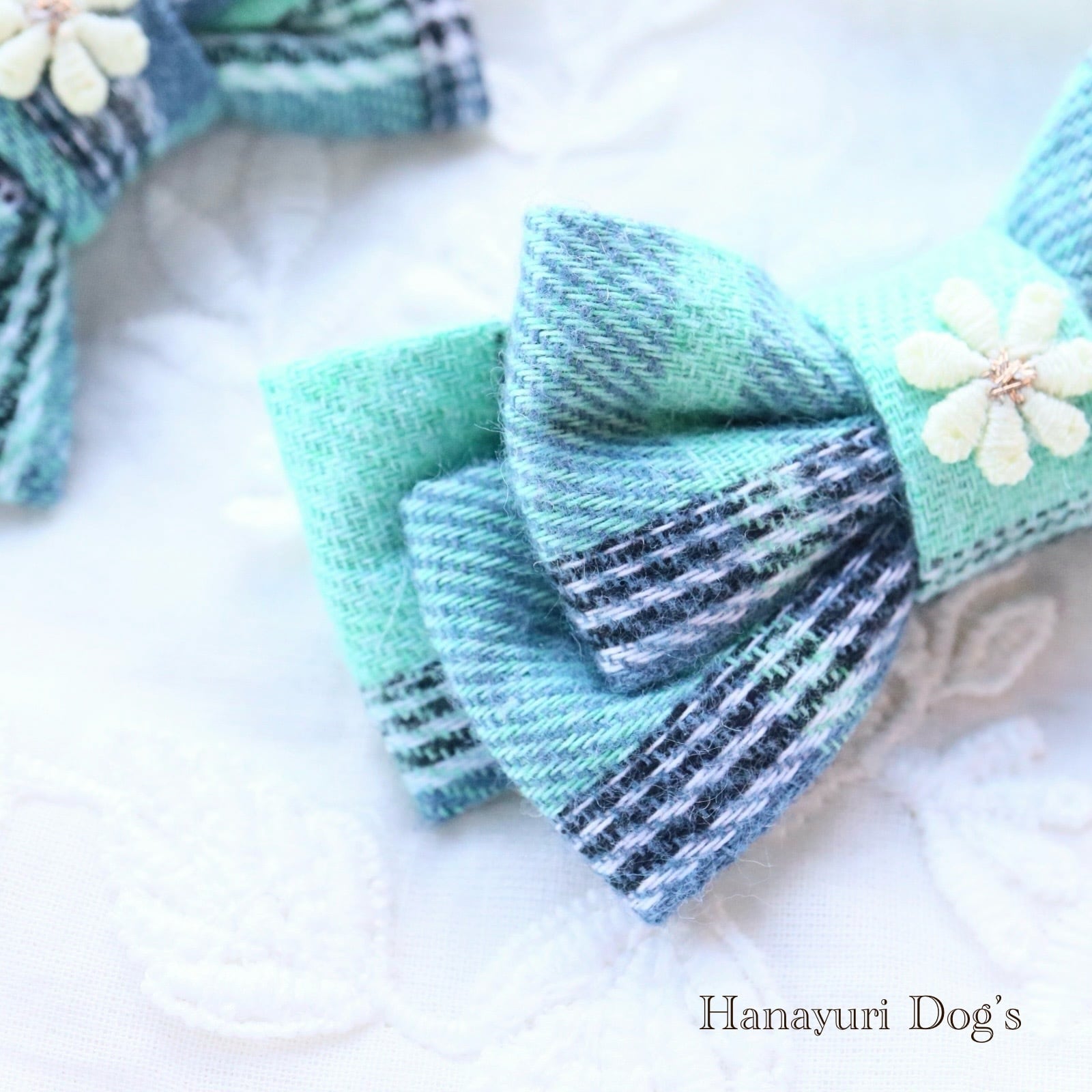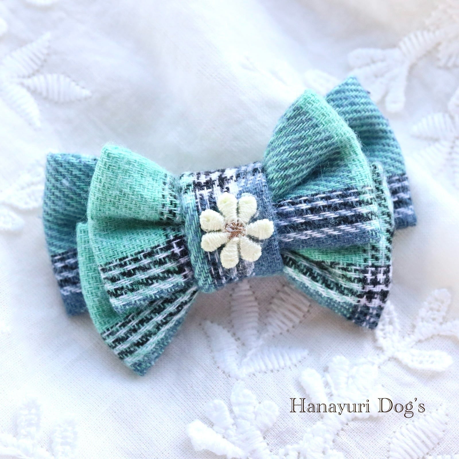 ブルーグリーンチェック 秋冬 犬バレッタ キッズ・子供リボン ペット ぬいぐるみ ヘアアクセサリー 髪飾り 普段着 うちの子記念日 誕生日 プレゼント オフ会 イベント 撮影 | Hanayuri Dog’s