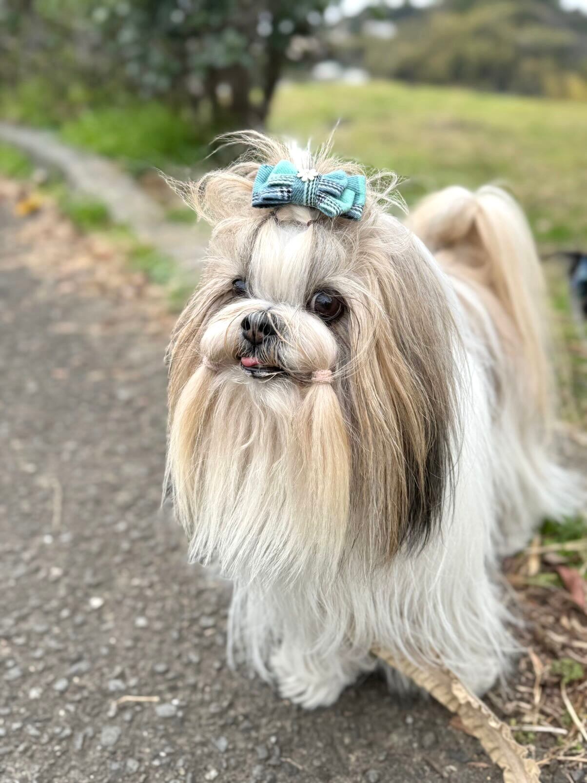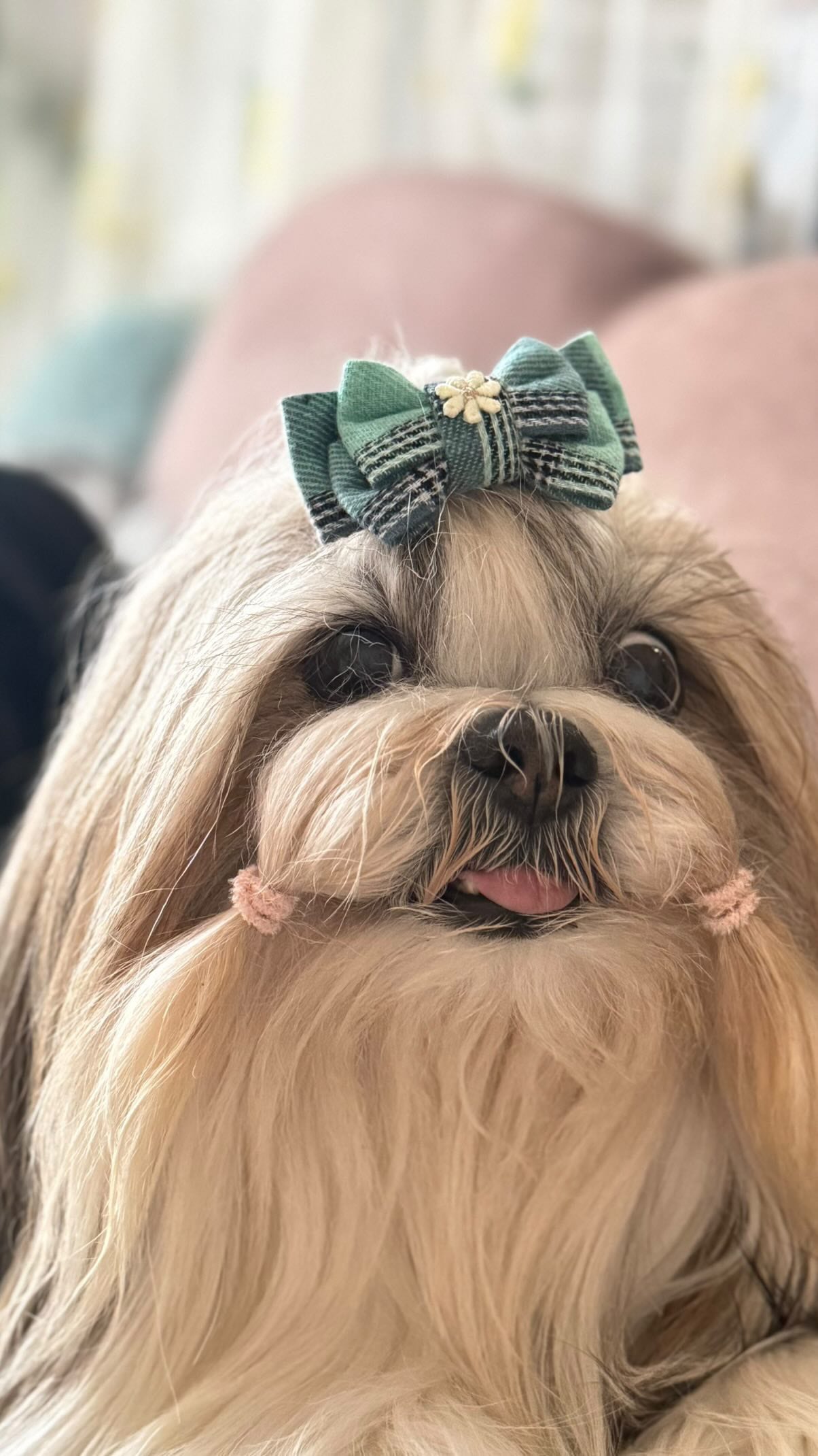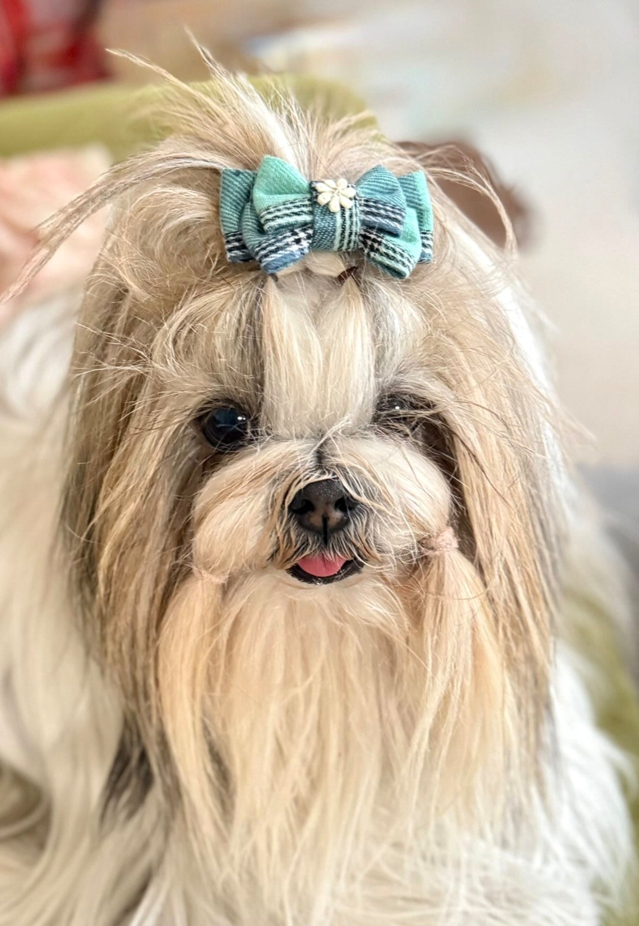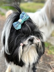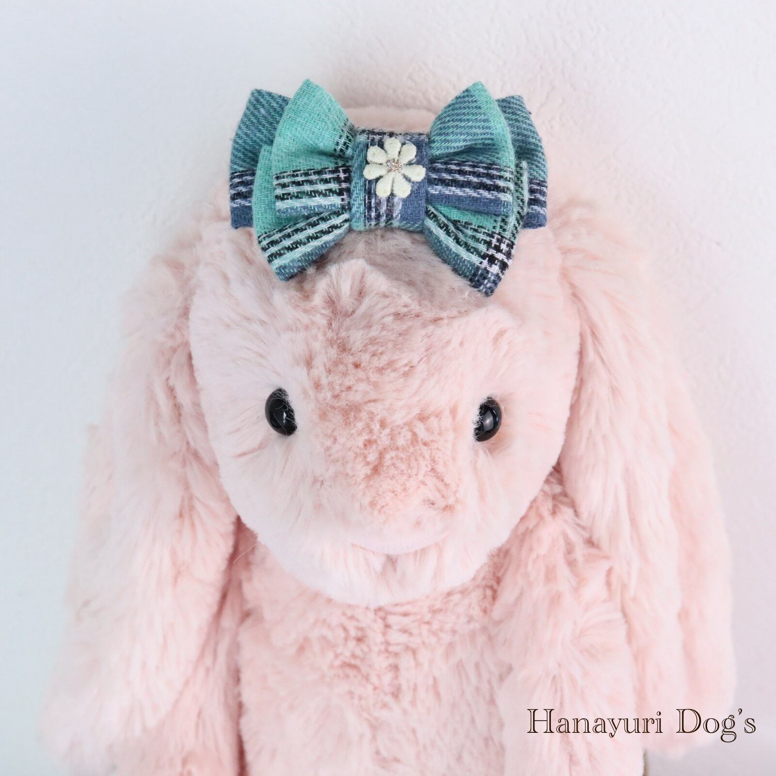 ブルーグリーンチェック 秋冬 犬バレッタ キッズ・子供リボン ペット ぬいぐるみ ヘアアクセサリー 髪飾り 普段着 うちの子記念日 誕生日 プレゼント オフ会 イベント 撮影