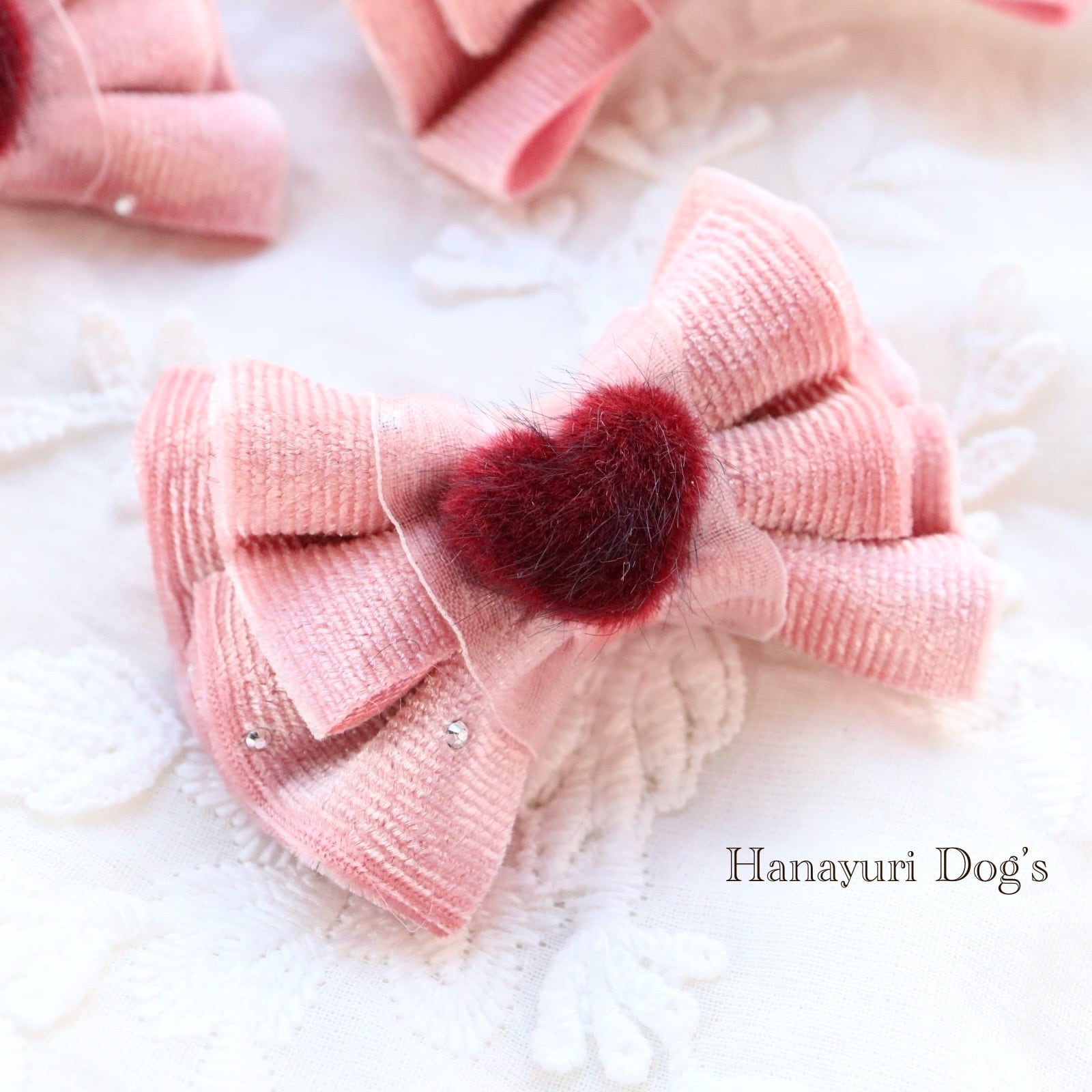 ピンクベルベット ラインストーン付き レッドハート 秋冬 犬バレッタ キッズ・子供リボン ペット ぬいぐるみ ヘアアクセサリー 髪飾り 普段着 うちの子記念日 誕生日 プレゼント オフ会 イベント 撮影 | Hanayuri Dog’s