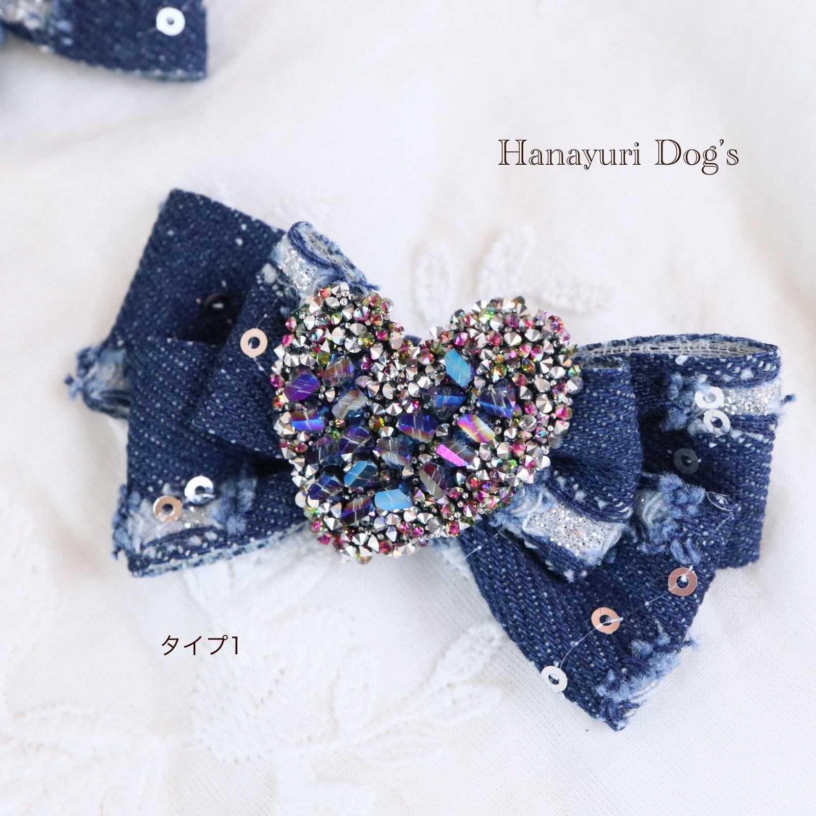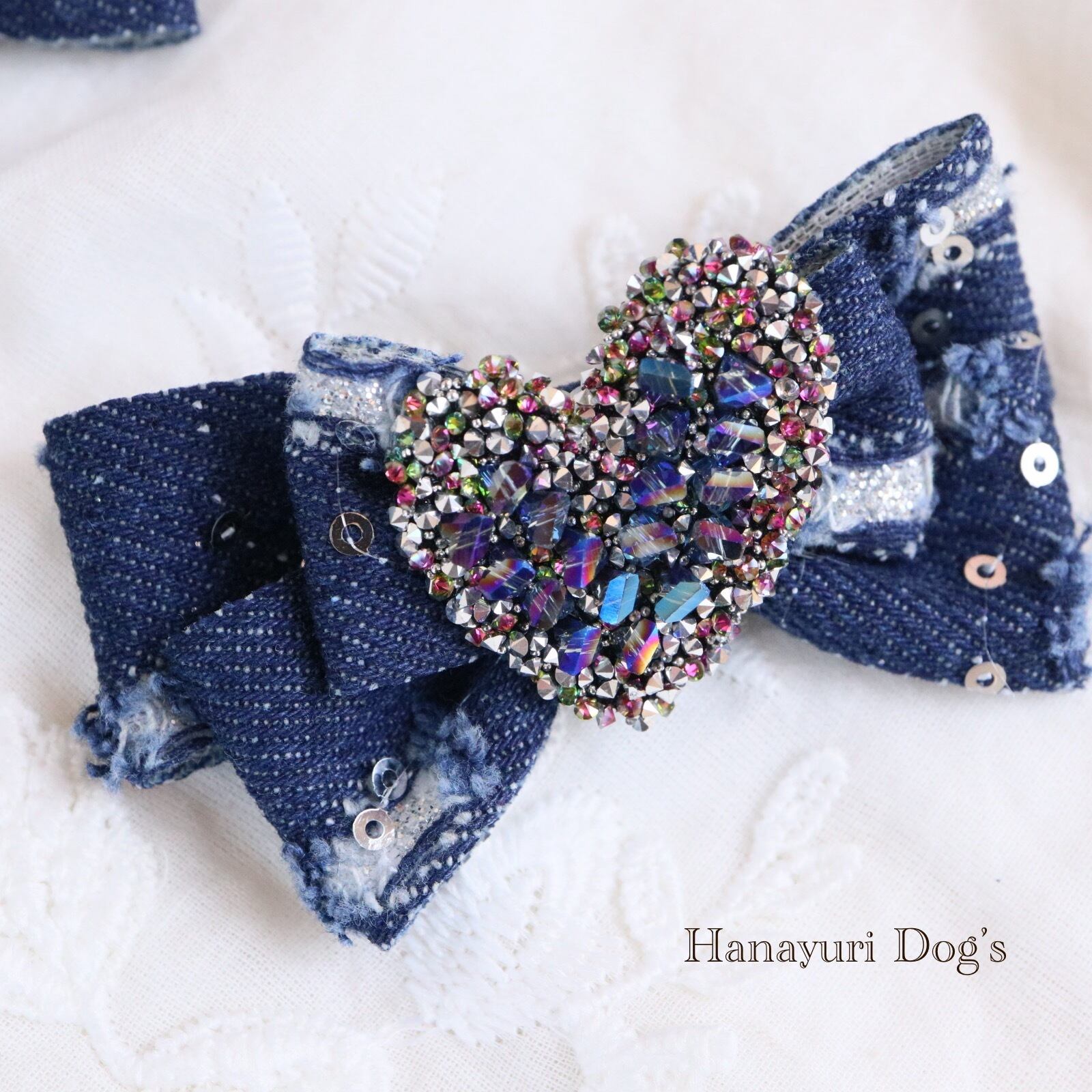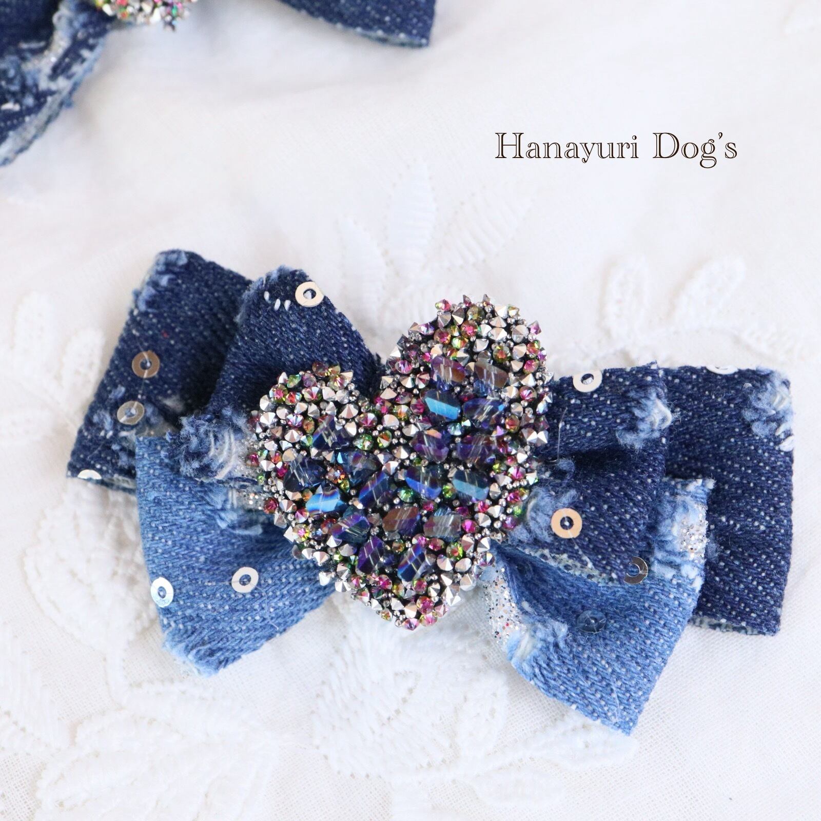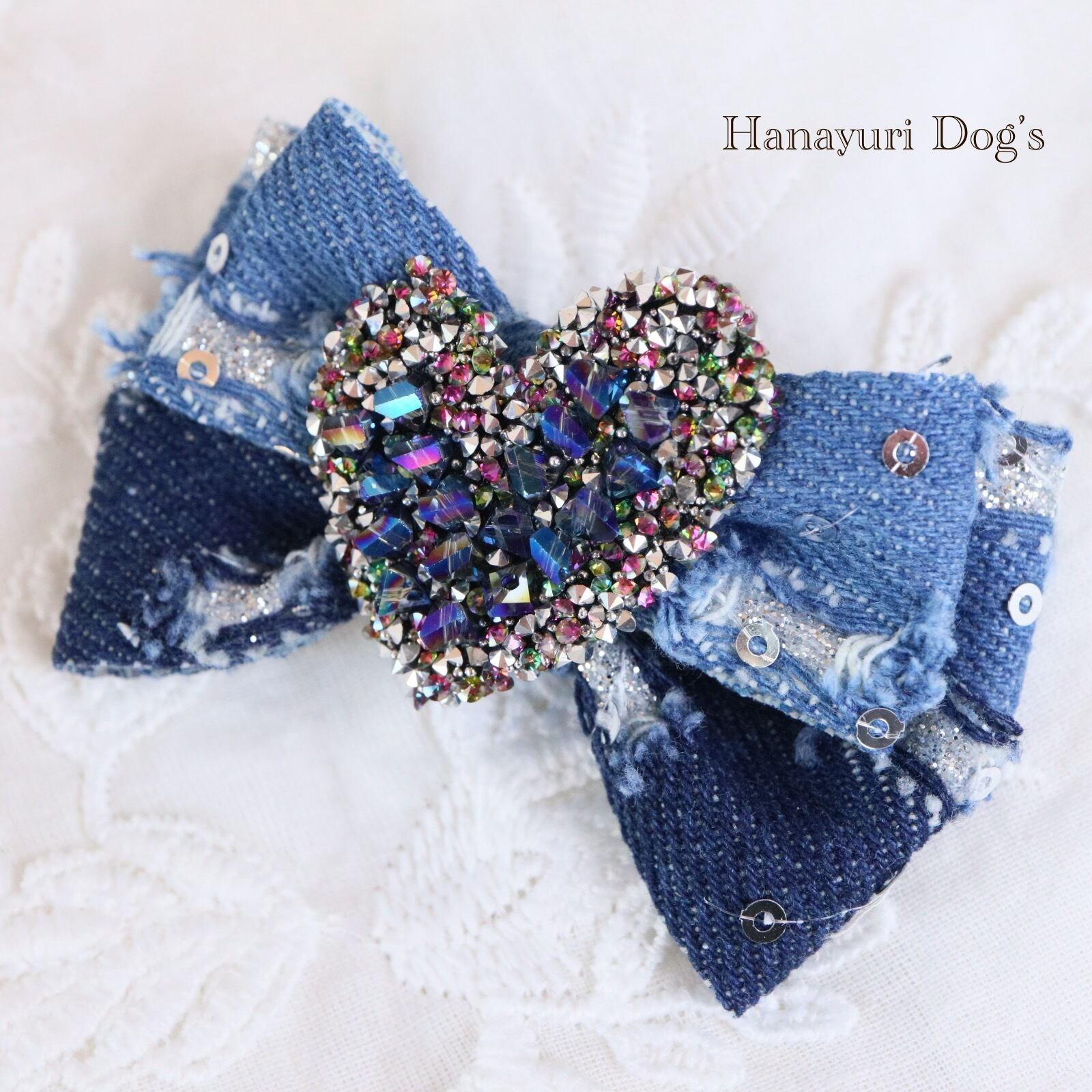 ダメージデニム スパンコール キラキラハート 4種1P 犬バレッタ キッズ・子供リボン ペット ぬいぐるみ ヘアアクセサリー 髪飾り 普段着 うちの子記念日 誕生日 プレゼント オフ会 イベント 撮影 | Hanayuri Dog’s