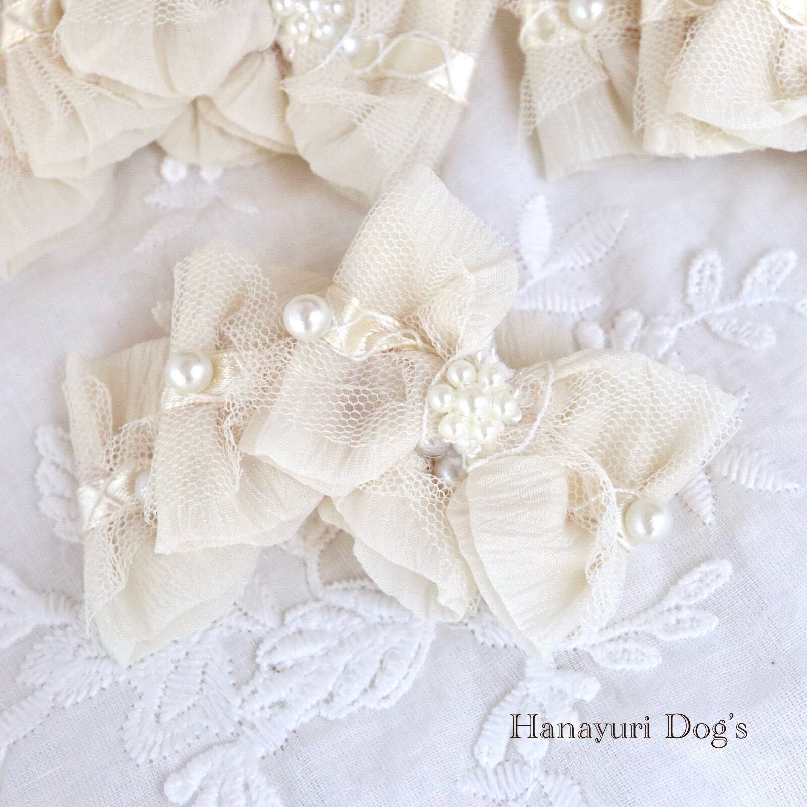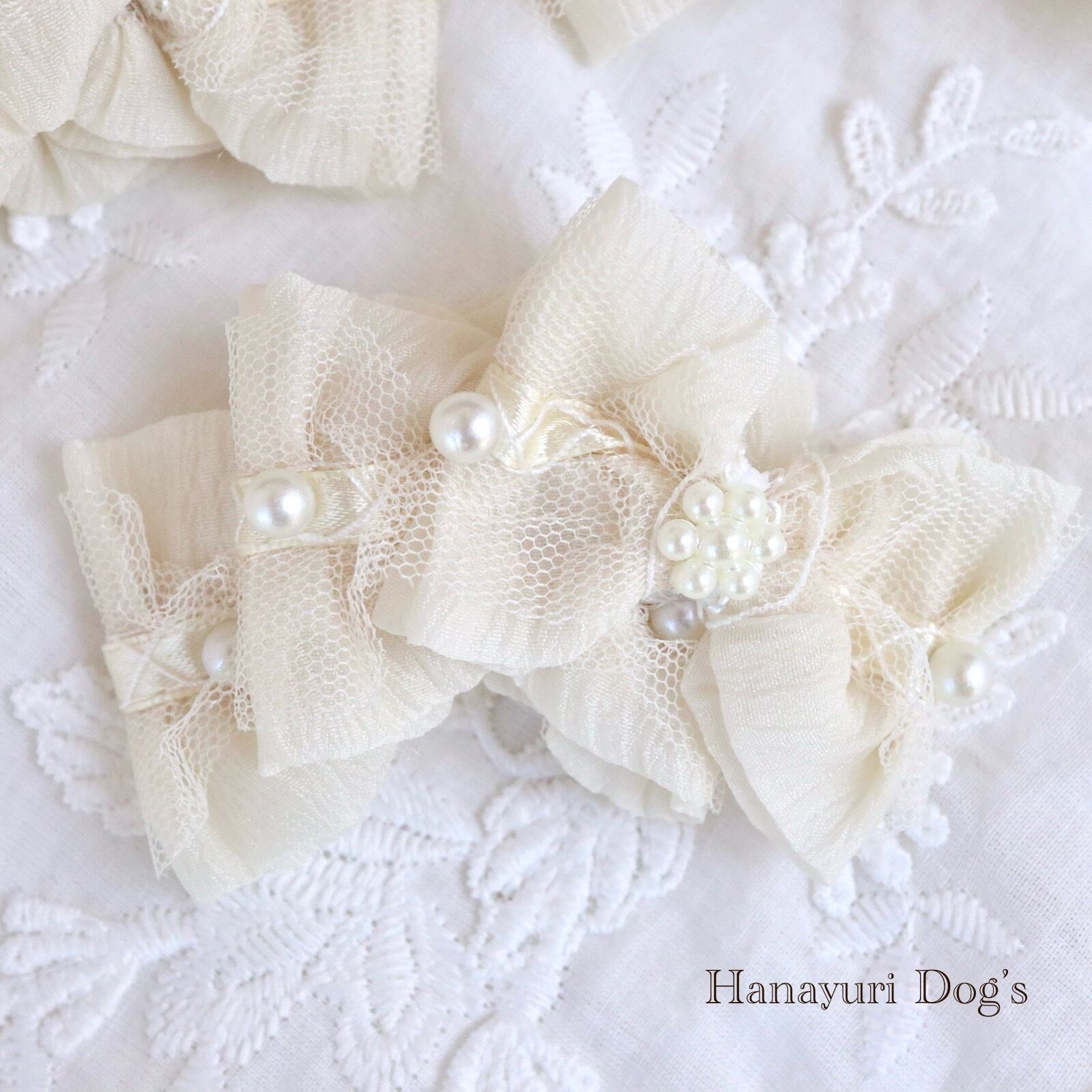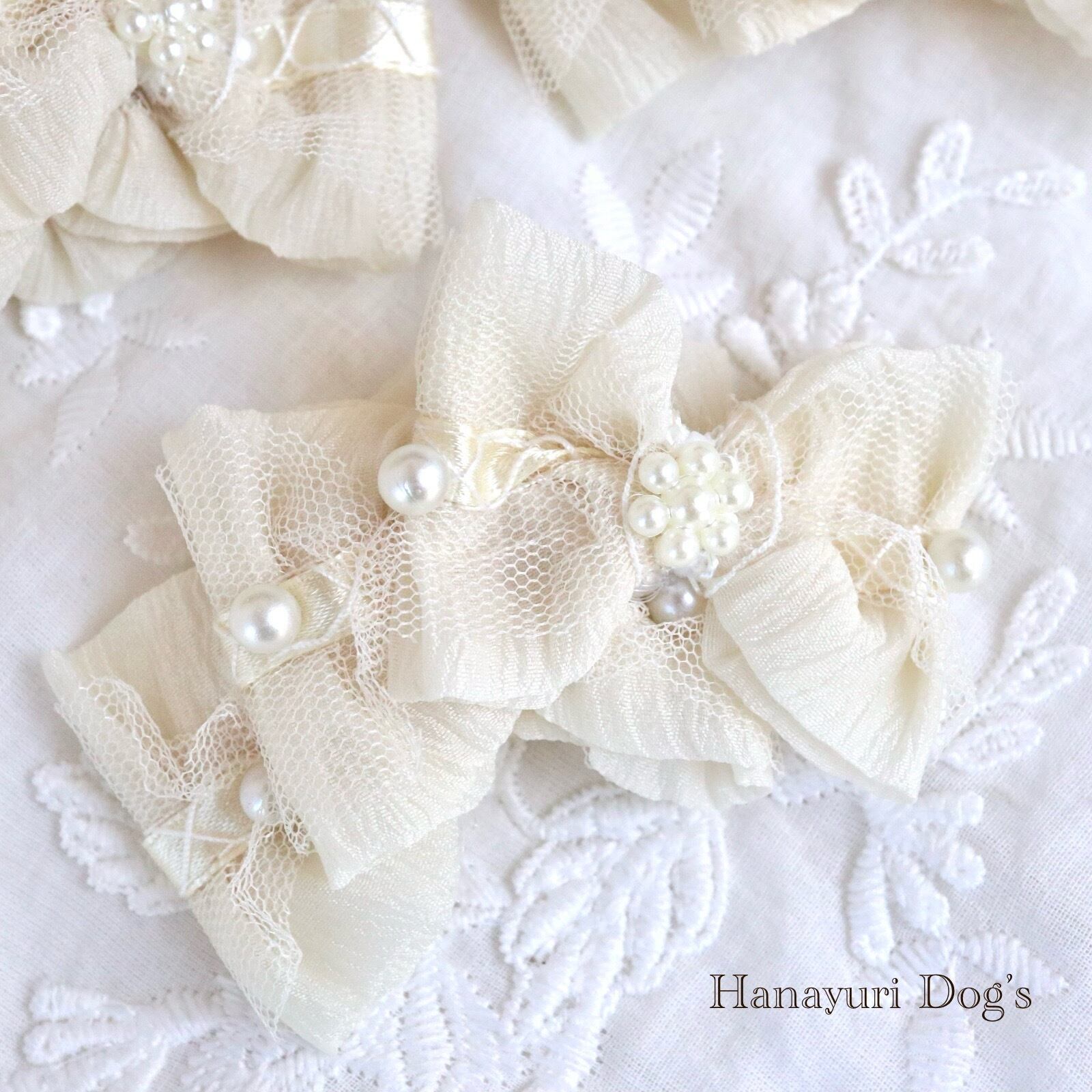 エレガントレースとパール オフホワイト 3連 犬バレッタ キッズ・子供リボン ペット ぬいぐるみ ヘアアクセサリー 髪飾り 普段着 うちの子記念日 誕生日 プレゼント オフ会 イベント 撮影 | Hanayuri Dog’s