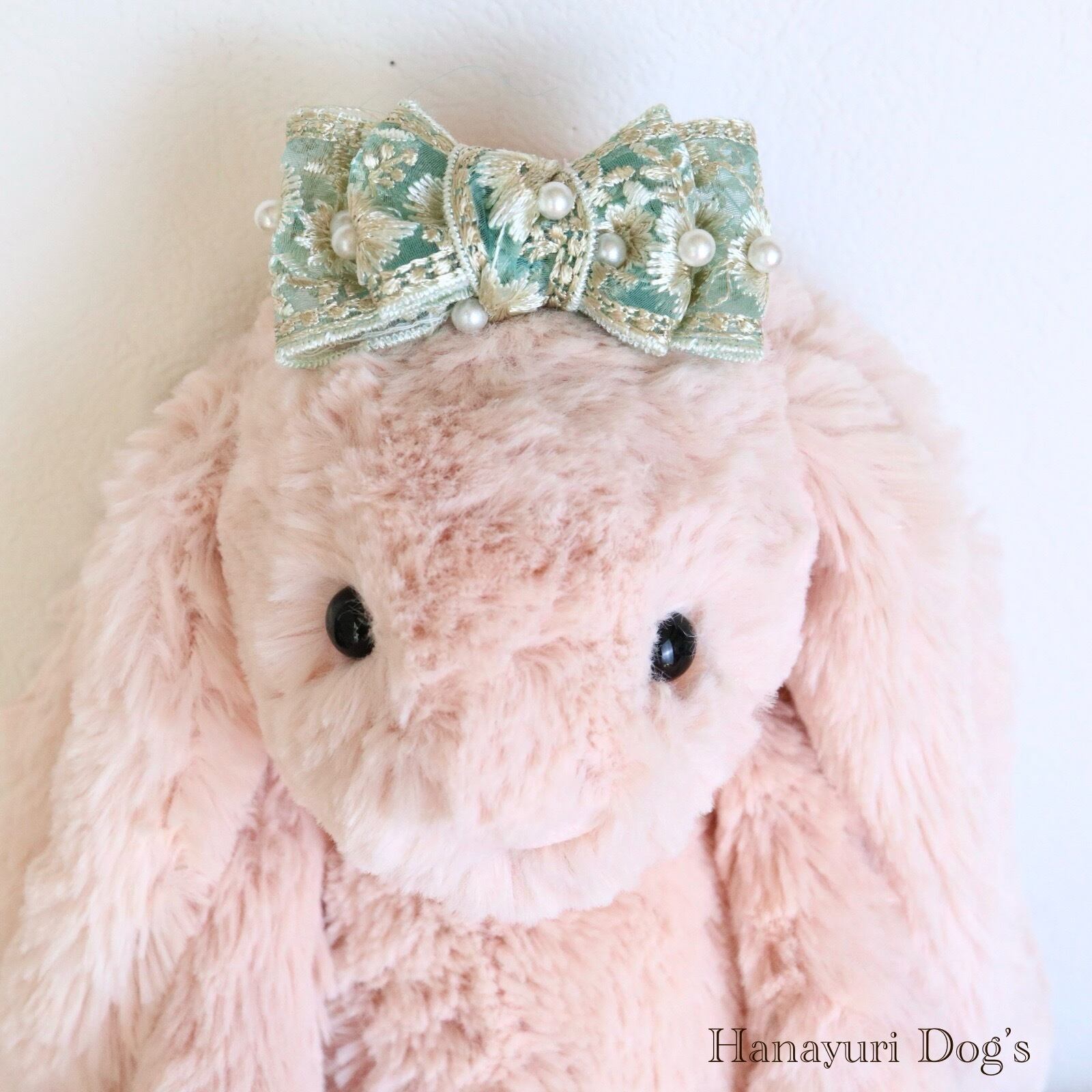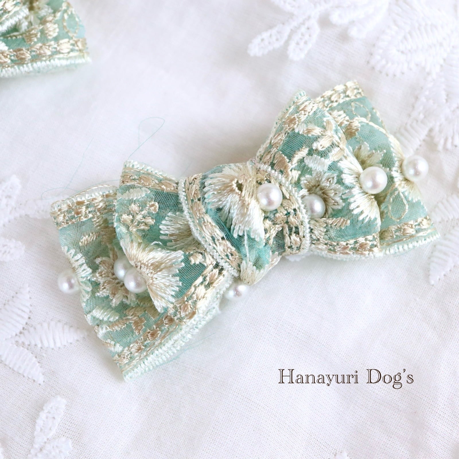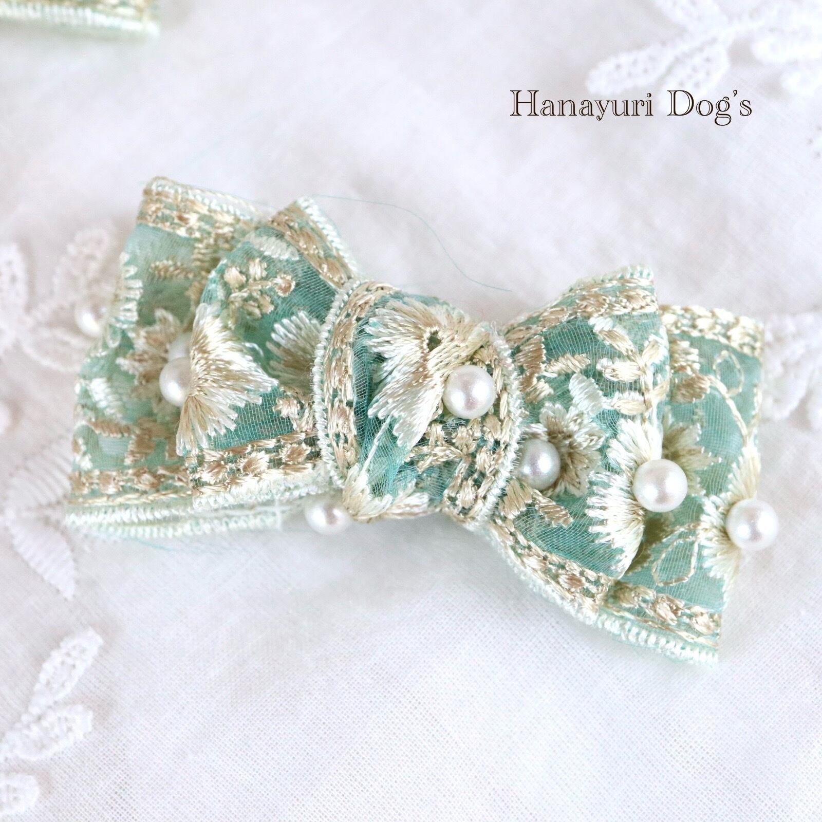 ブルーグリーン 刺繍とパール小 犬バレッタ キッズ・子供リボン ペット ぬいぐるみ ヘアアクセサリー 髪飾り 普段着 うちの子記念日 誕生日 プレゼント オフ会 イベント 撮影 | Hanayuri Dog’s