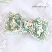 透き通るブルーグリーンのオーガンジーに豪華な刺繍とパールが施されたバレッタリボンです。