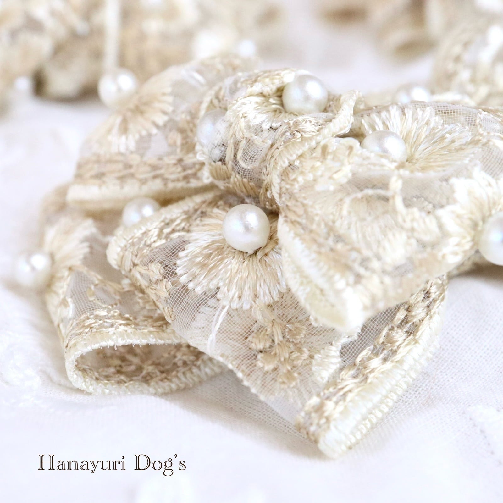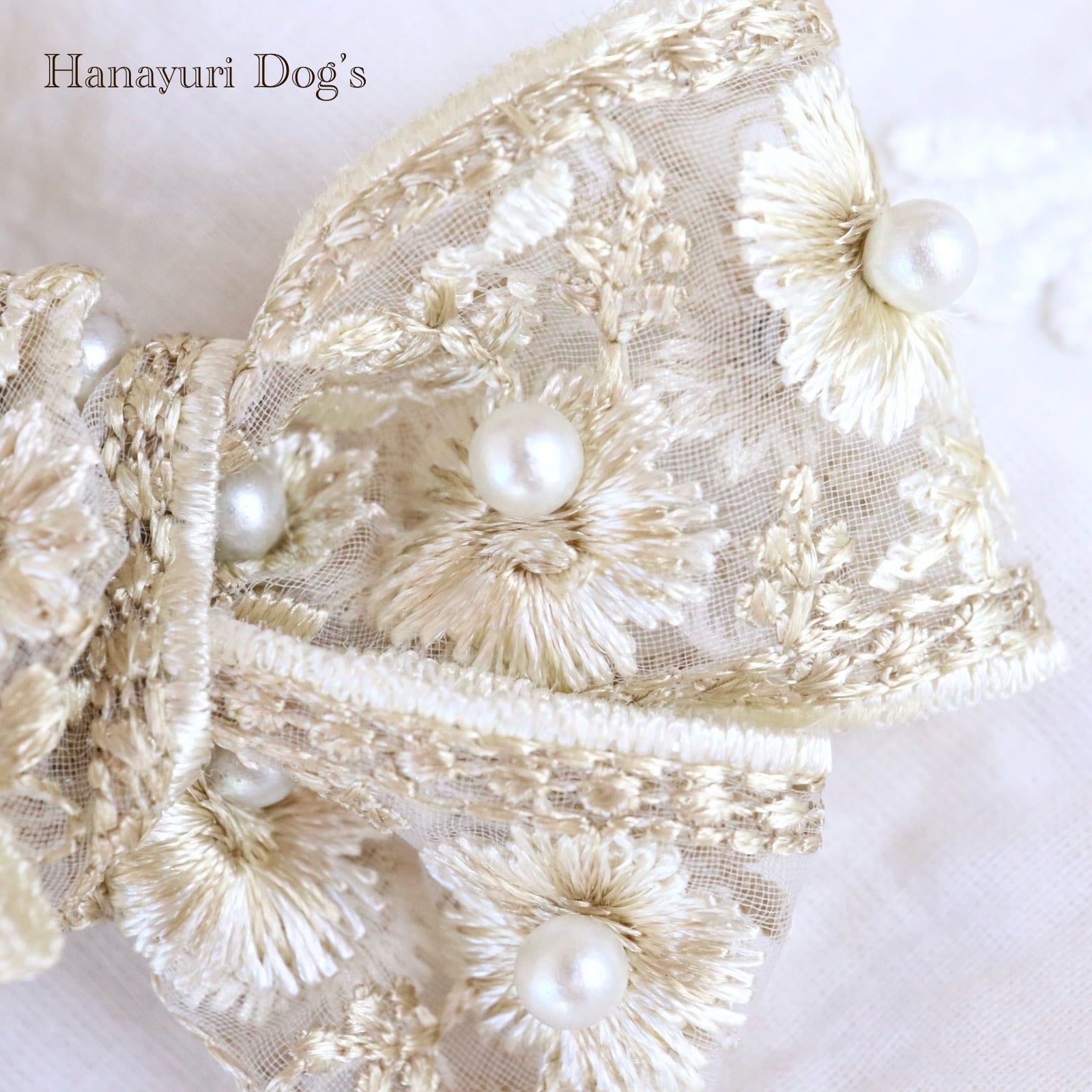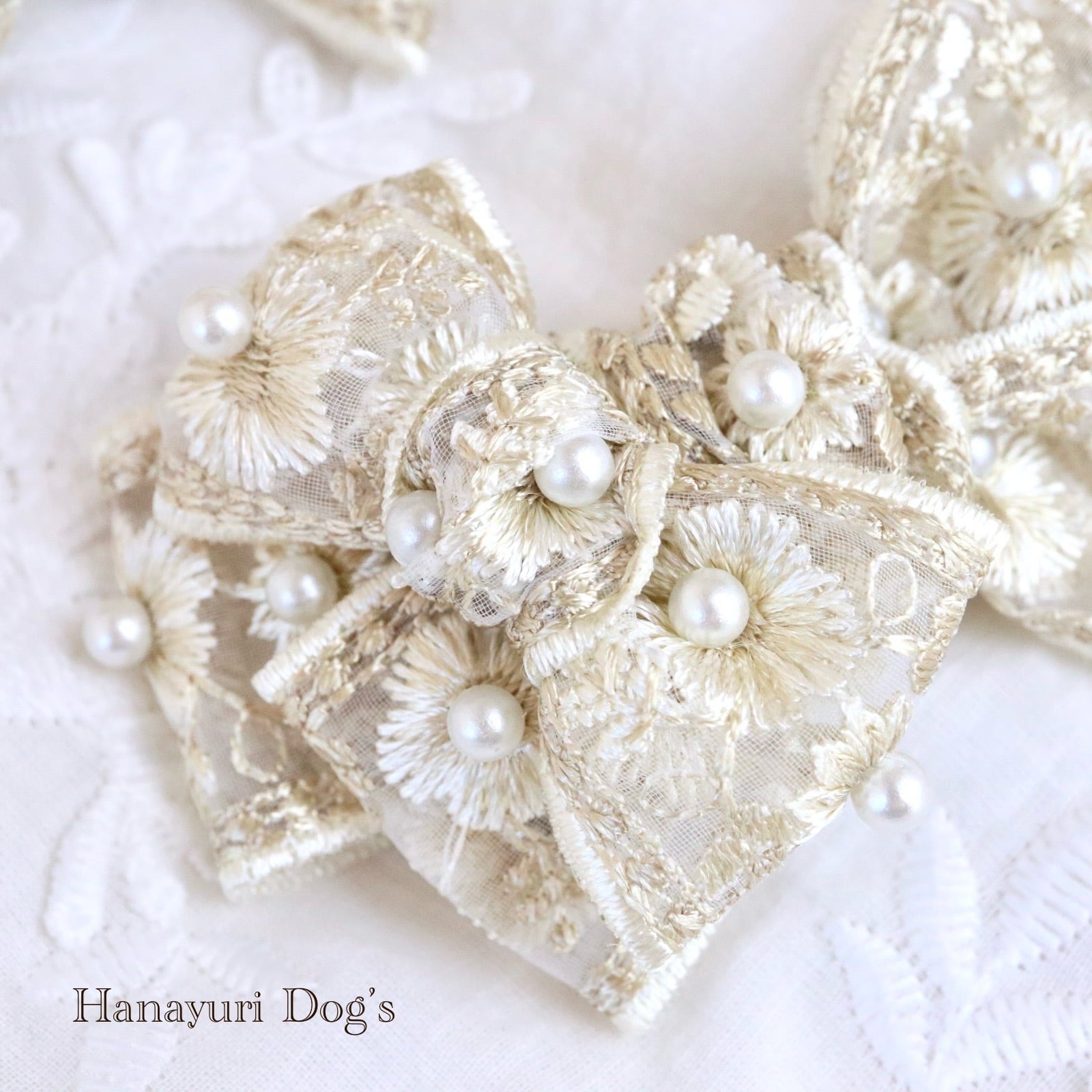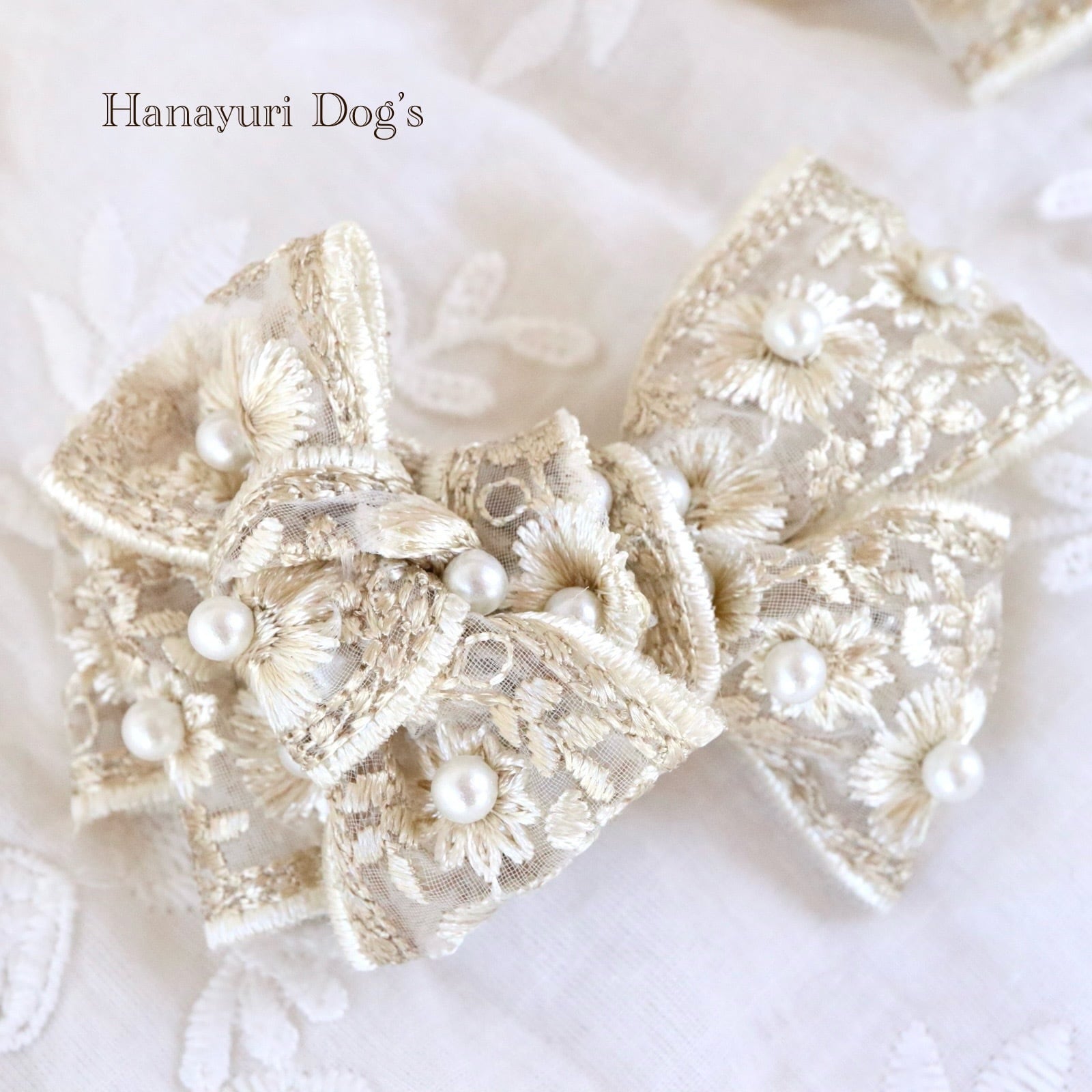 豪華刺繍レースと贅沢パール クラシカル ベージュ 犬バレッタ キッズ・子供リボン ペット ぬいぐるみ ヘアアクセサリー 髪飾り 普段着 うちの子記念日 誕生日 プレゼント オフ会 イベント 撮影