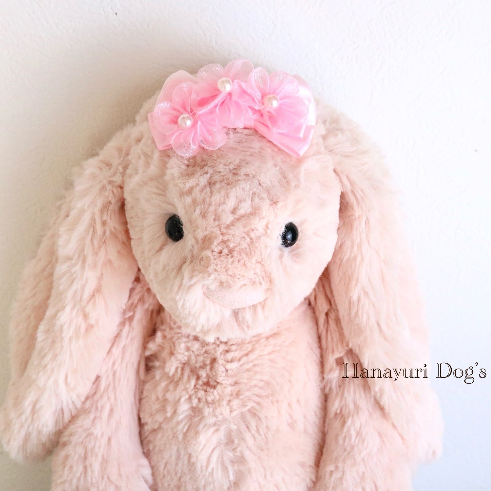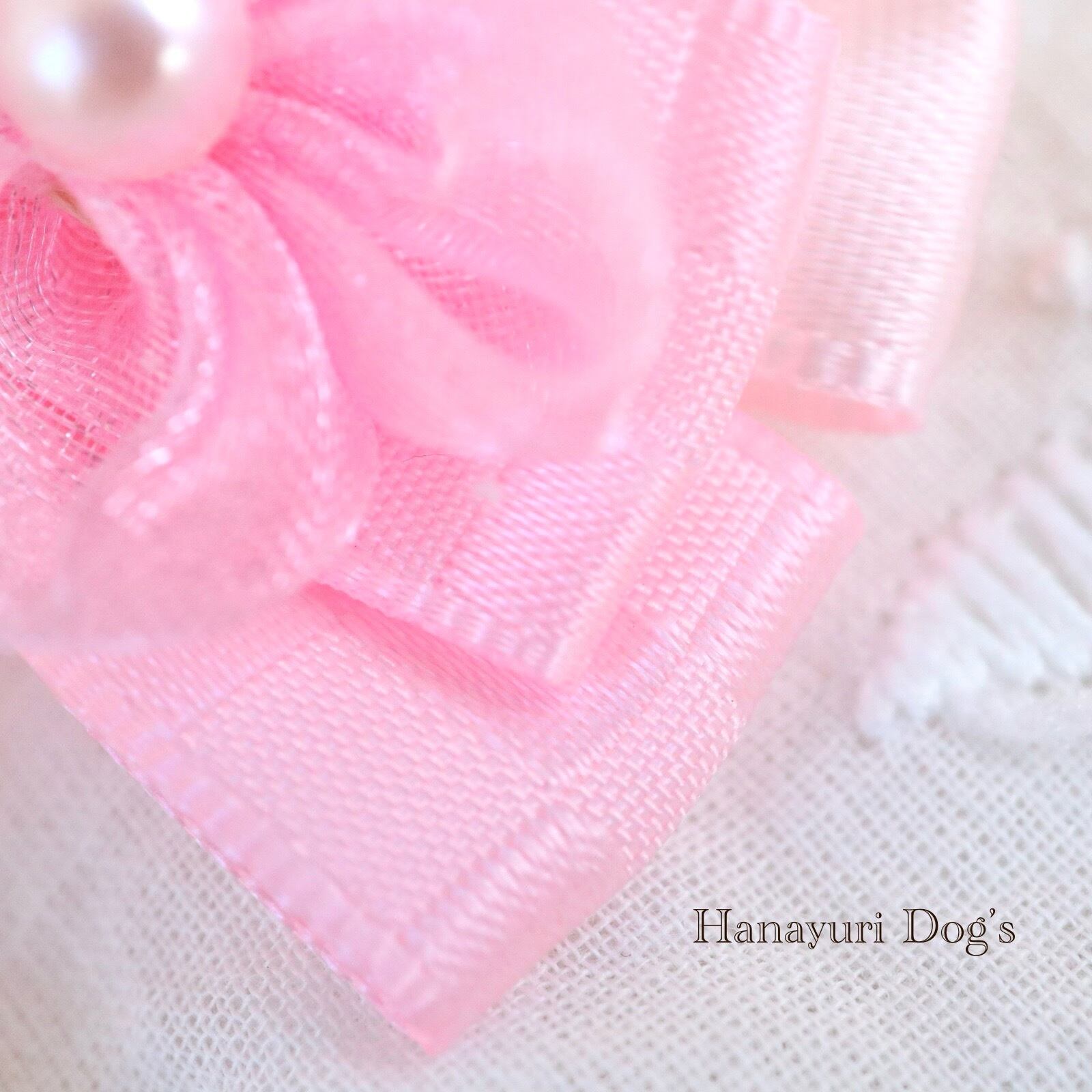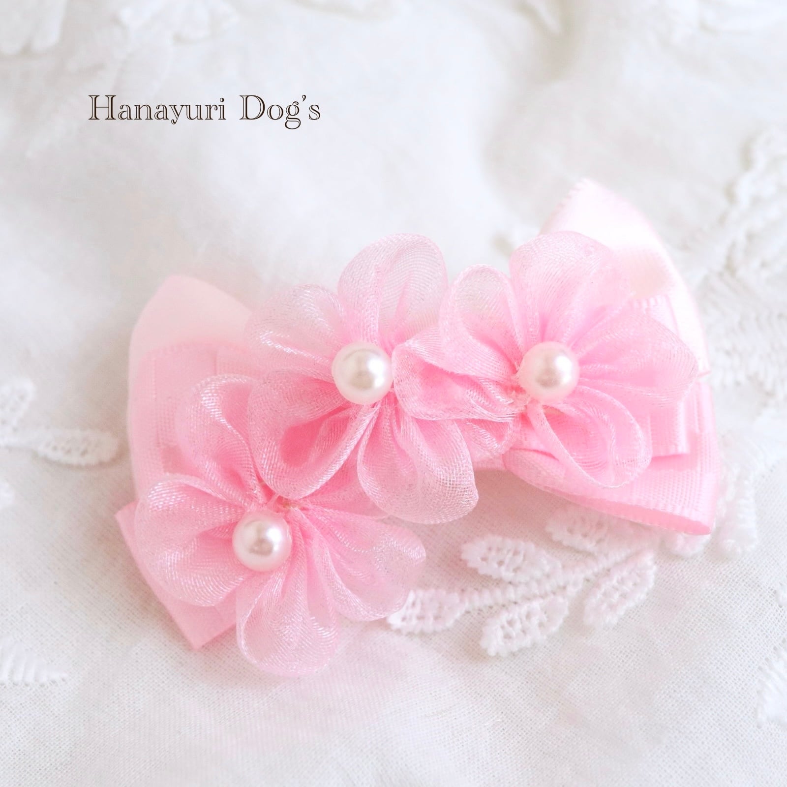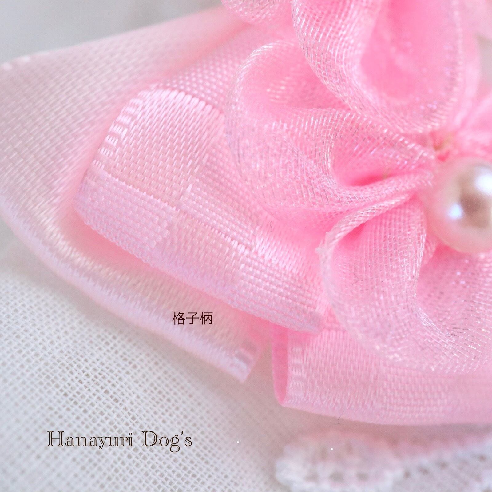 ピンクオーガンジーの花 パール 格子柄 お花見 犬バレッタ キッズ・子供リボン ペット ぬいぐるみ ヘアアクセサリー 髪飾り 普段着 うちの子記念日 誕生日 プレゼント オフ会 イベント 撮影