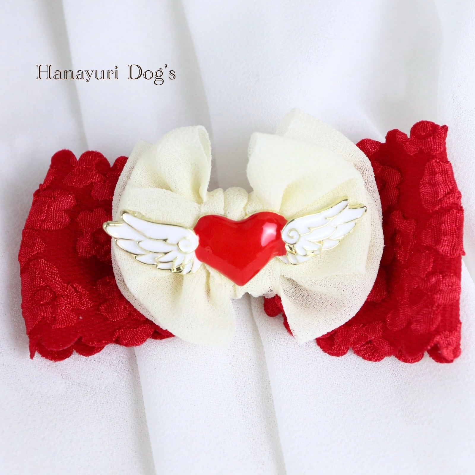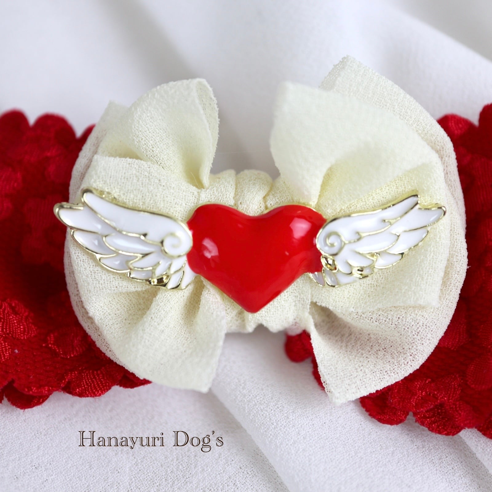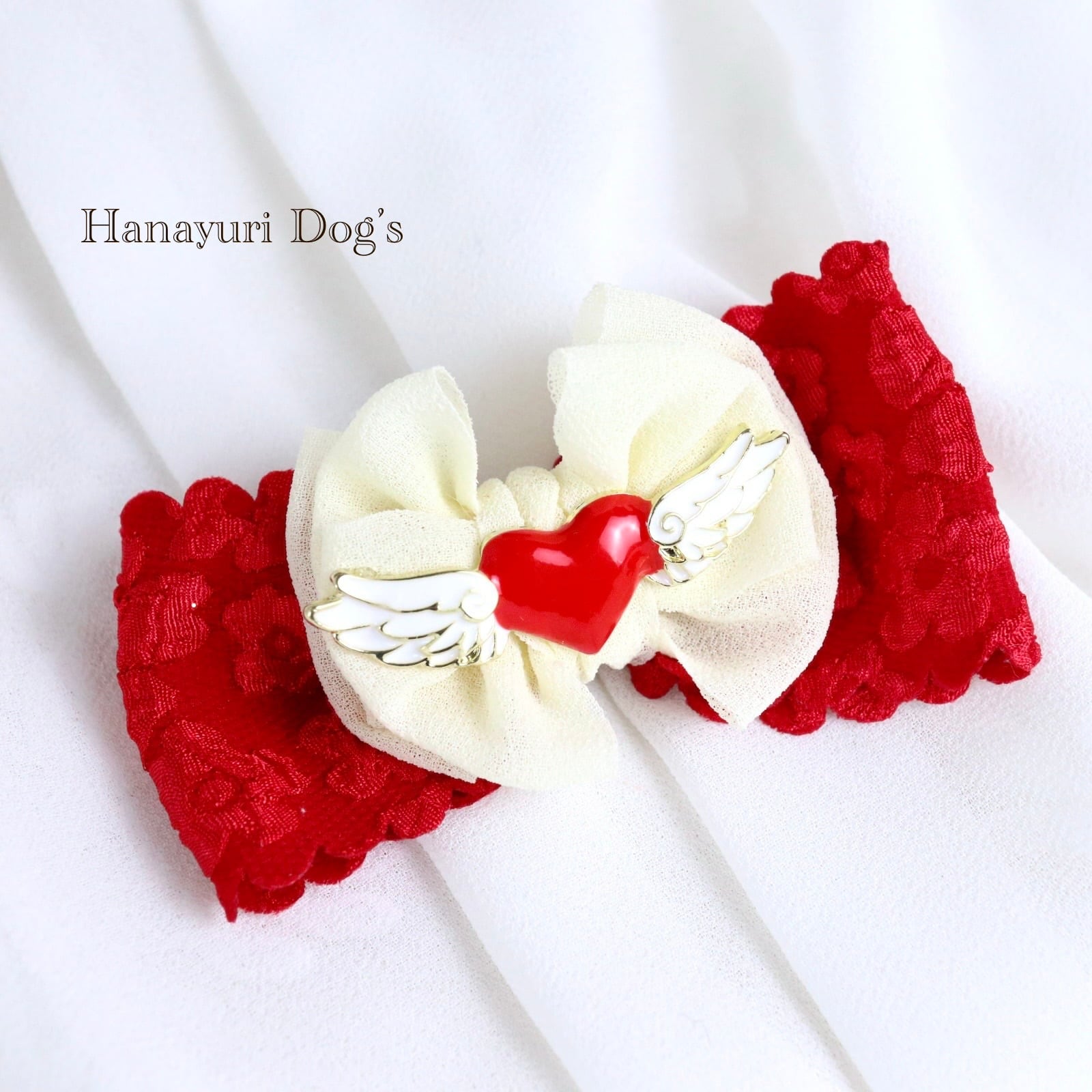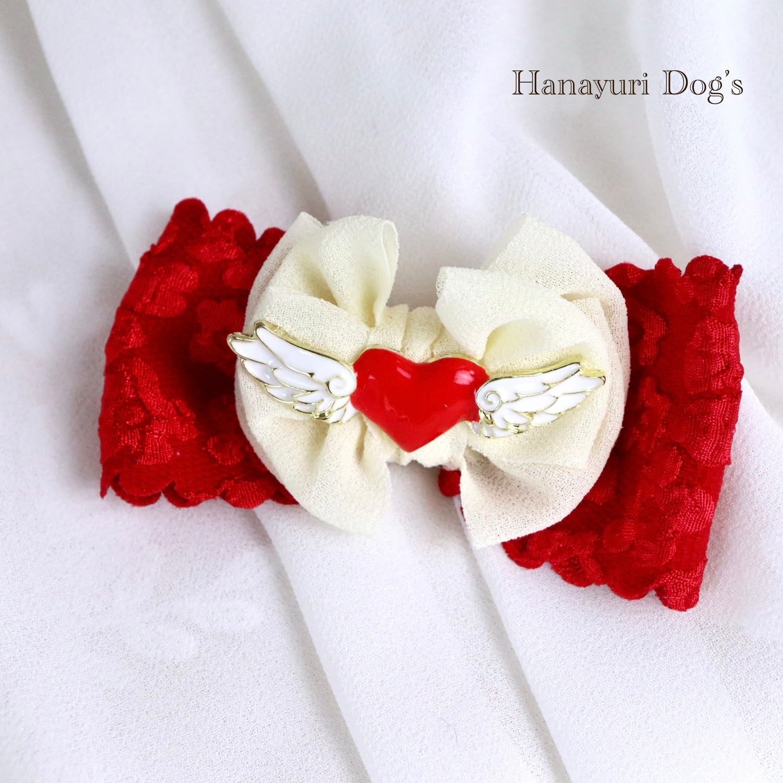 ハートエンジェル 天使 羽 赤×白 バレンタインデー 犬バレッタ キッズ・子供リボン ペット ぬいぐるみ ヘアアクセサリー 髪飾り 普段着 うちの子記念日 誕生日 プレゼント オフ会 イベント 撮影