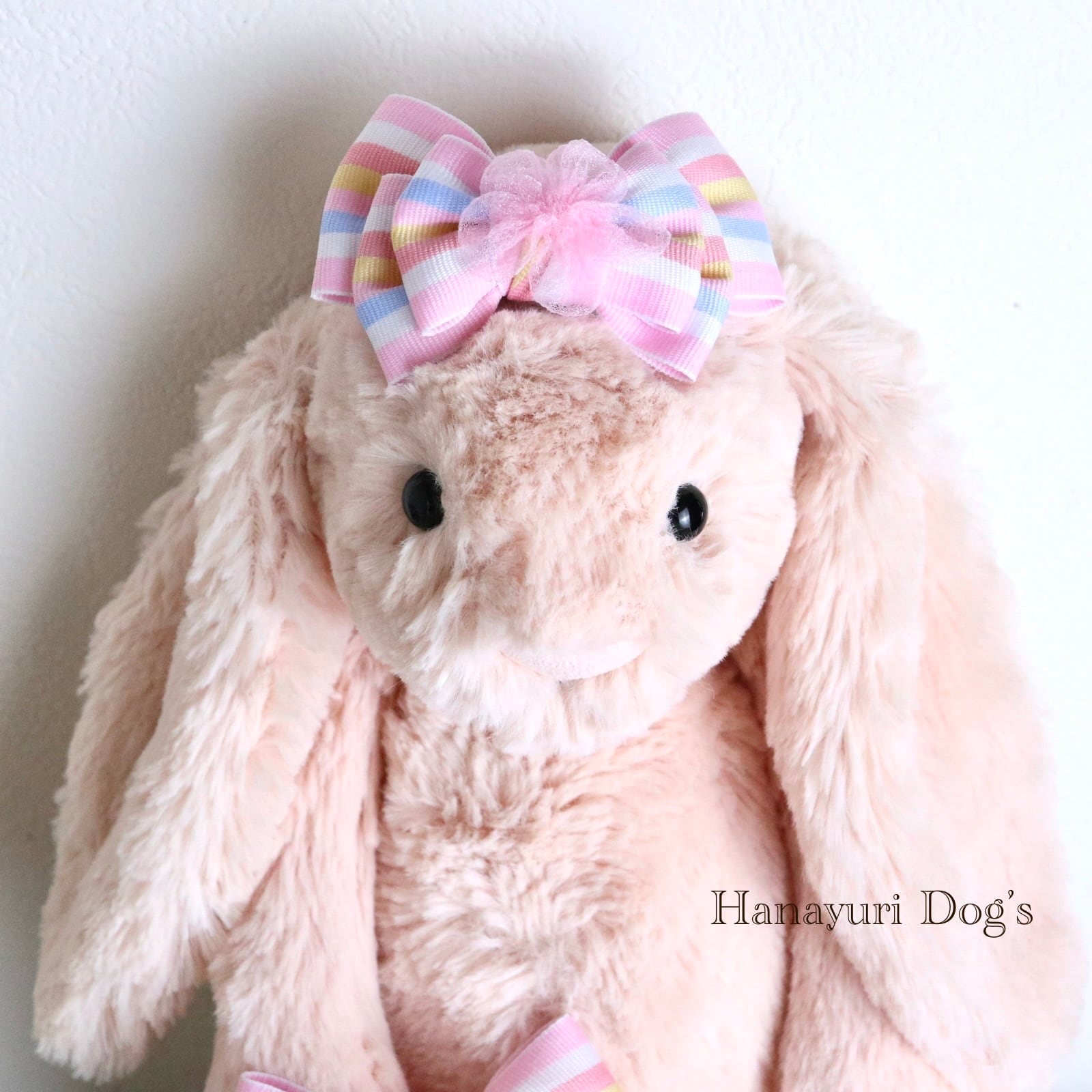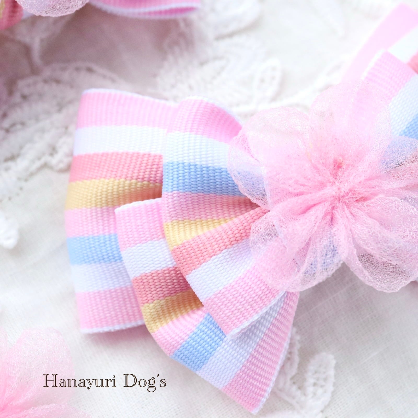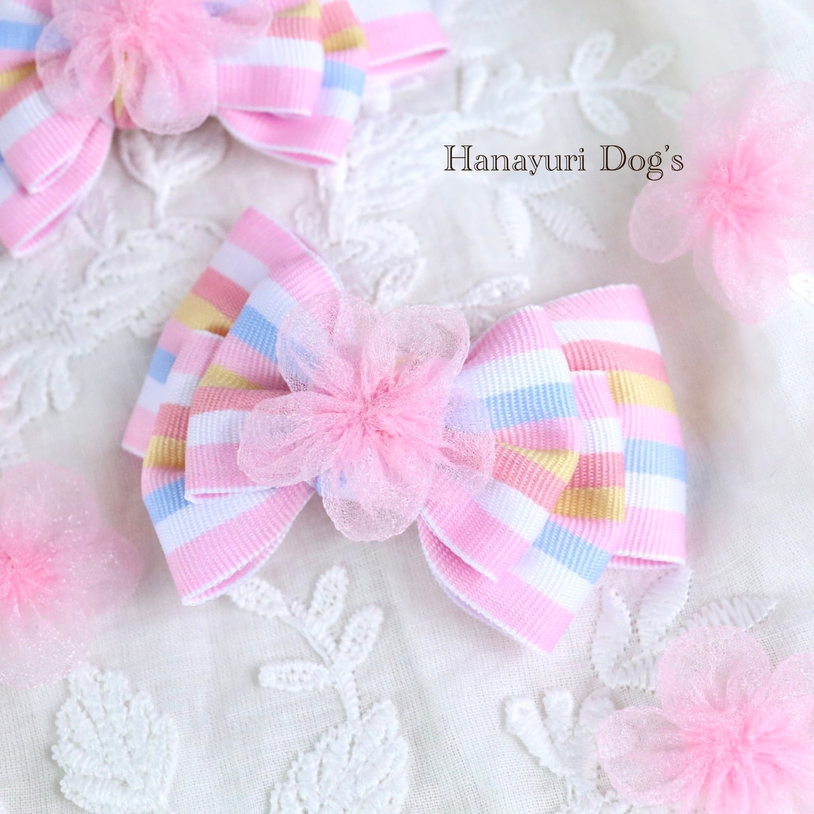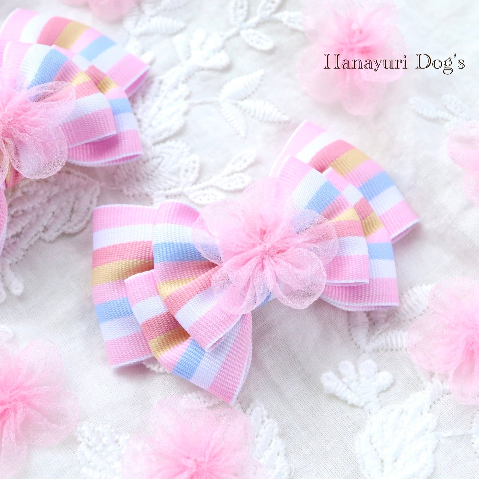 パステルストライプ チュールの花 ひな祭り 桜 春 犬バレッタ キッズ・子供リボン ペット ぬいぐるみ ヘアアクセサリー 髪飾り 普段着 うちの子記念日 誕生日 プレゼント オフ会 イベント 撮影
