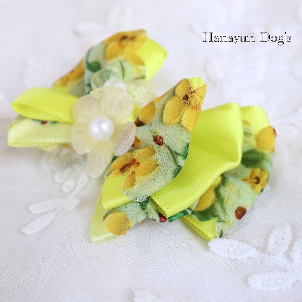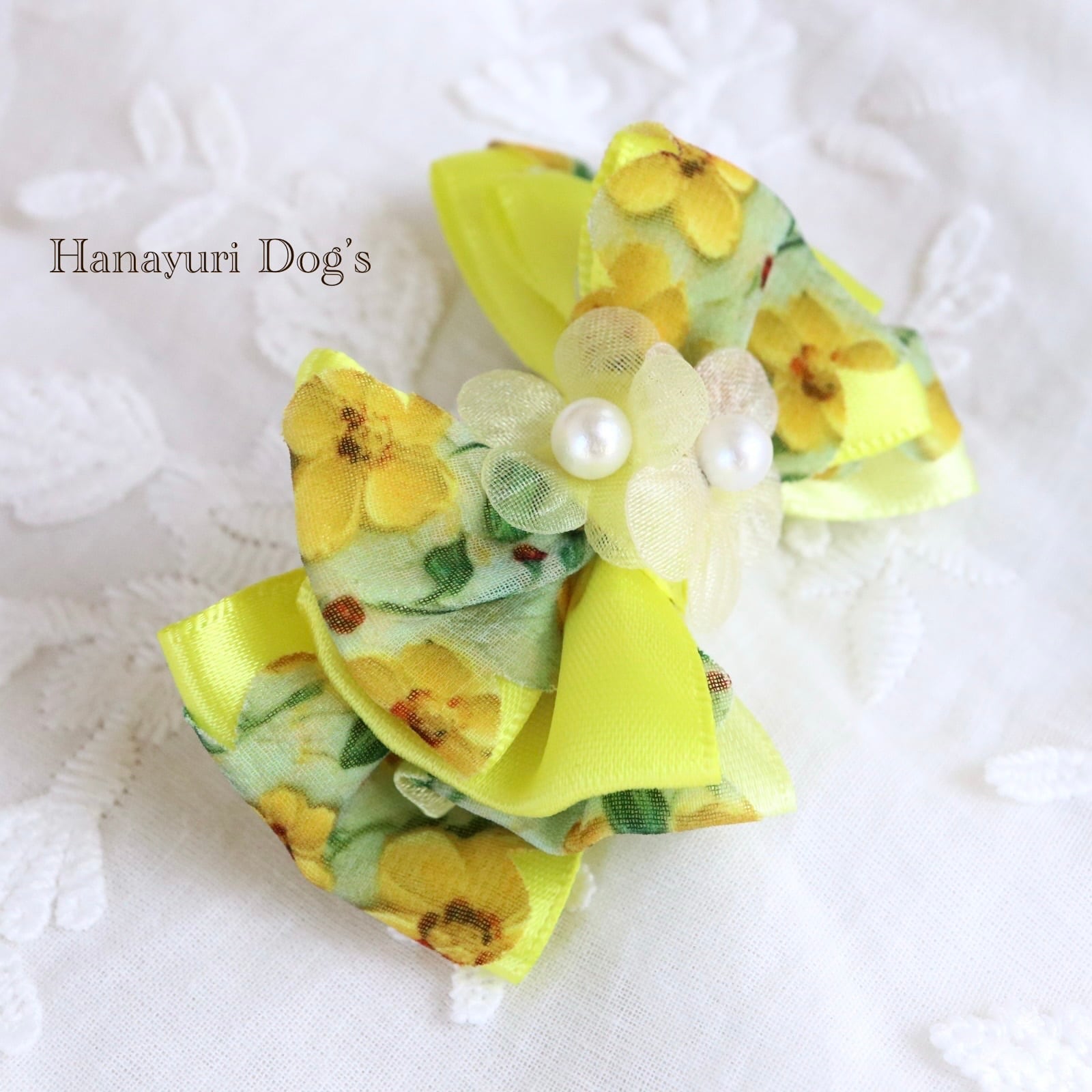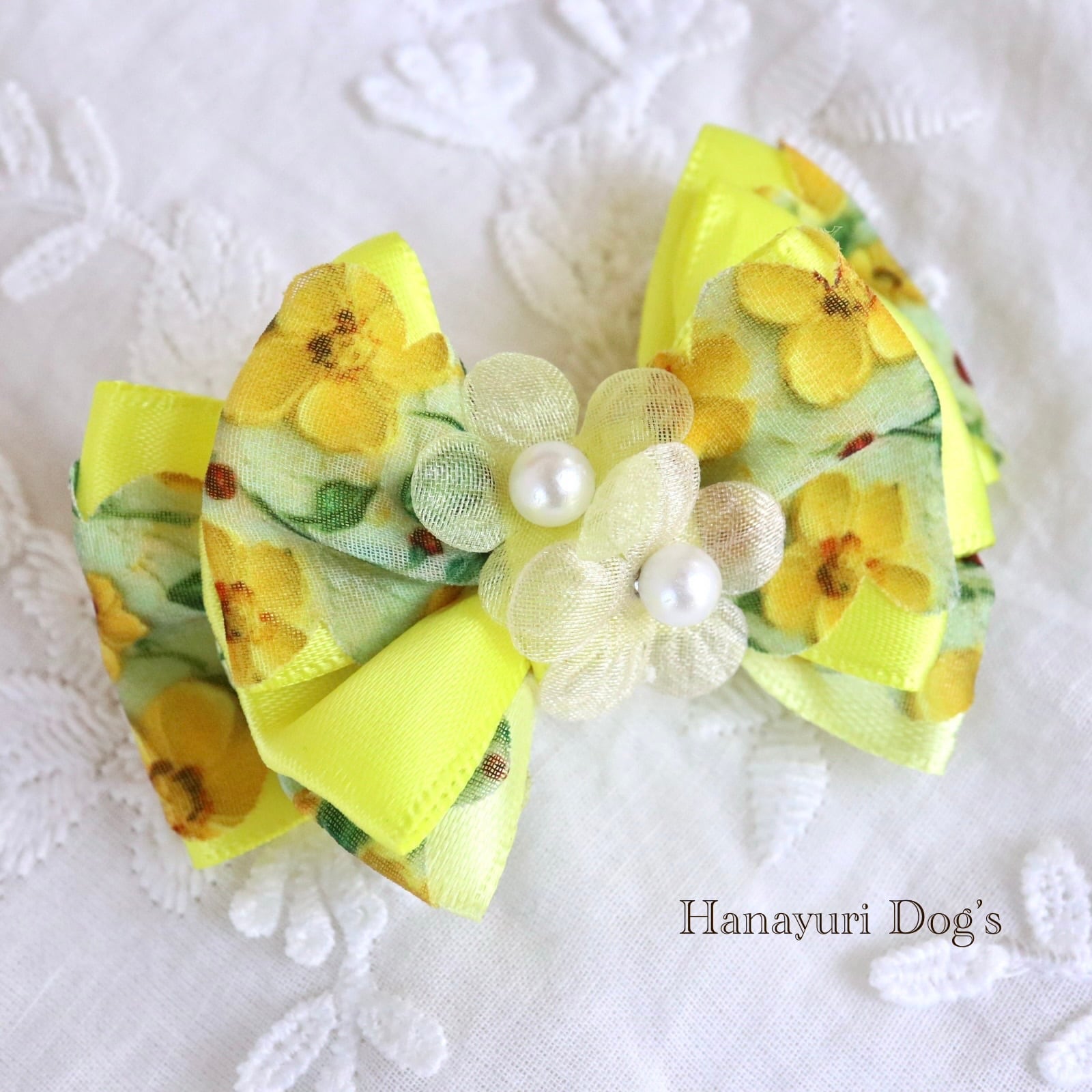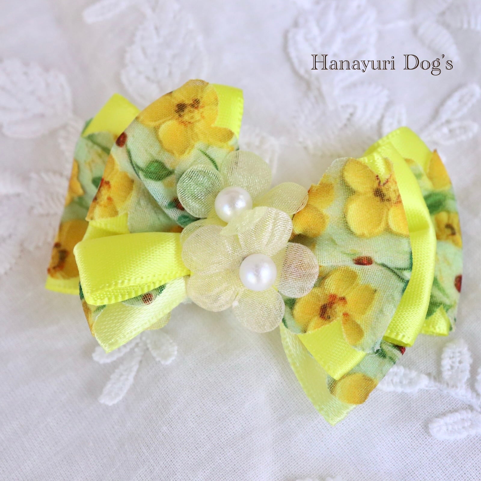 フローラルイエロー ミモザイエロー 花 パール 犬バレッタ キッズ・子供リボン ペット ぬいぐるみ ヘアアクセサリー 髪飾り 普段着 うちの子記念日 誕生日 プレゼント オフ会 イベント 撮影