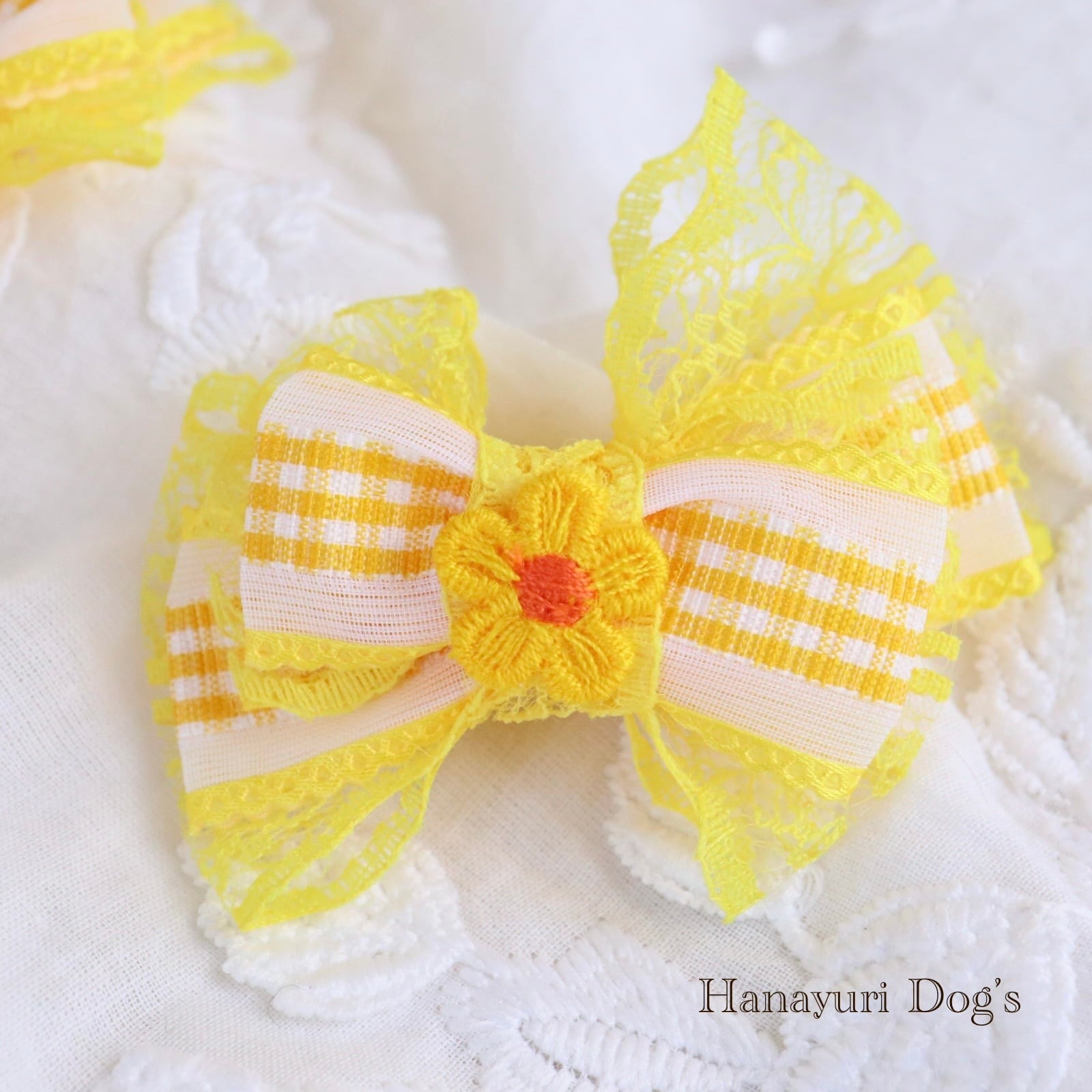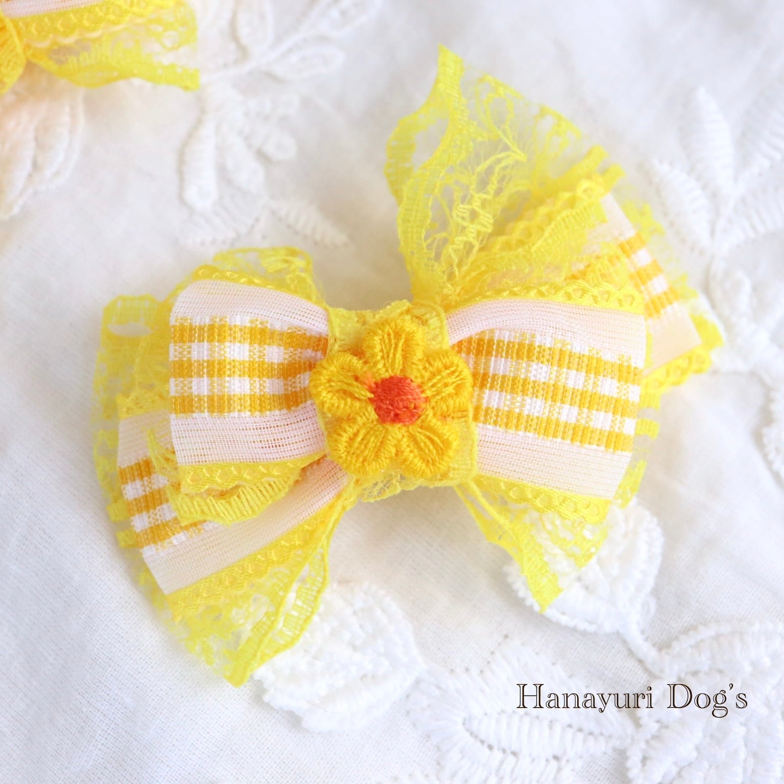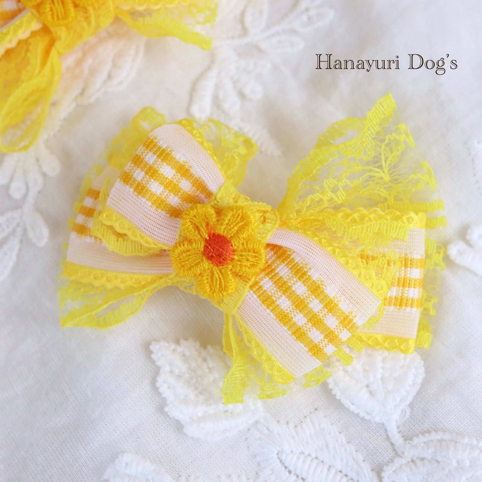 ギンガムチェック イエロー 花 犬バレッタ キッズ・子供リボン ペット ぬいぐるみ ヘアアクセサリー 髪飾り 普段着 うちの子記念日 誕生日 プレゼント オフ会 イベント 撮影
