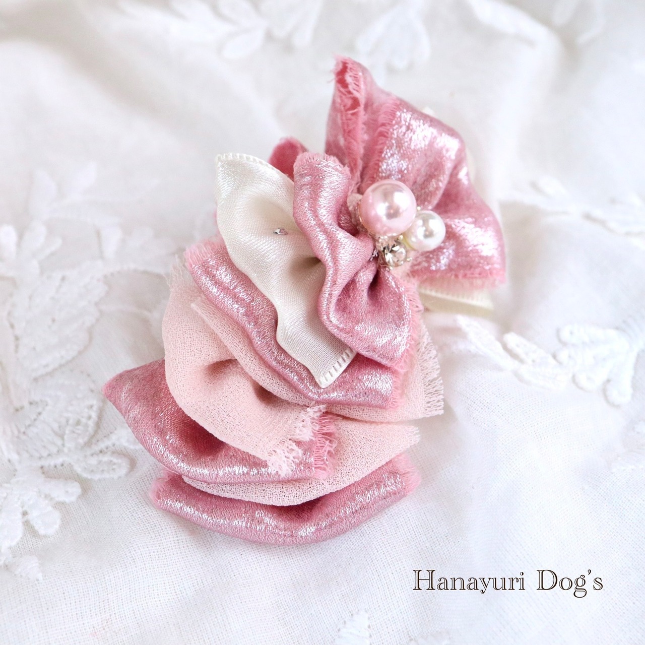 きらめきピンクとパールビジュー 犬バレッタ キッズ・子供リボン ペット ぬいぐるみ ヘアアクセサリー 髪飾り 普段着 うちの子記念日 誕生日 プレゼント オフ会 イベント 撮影