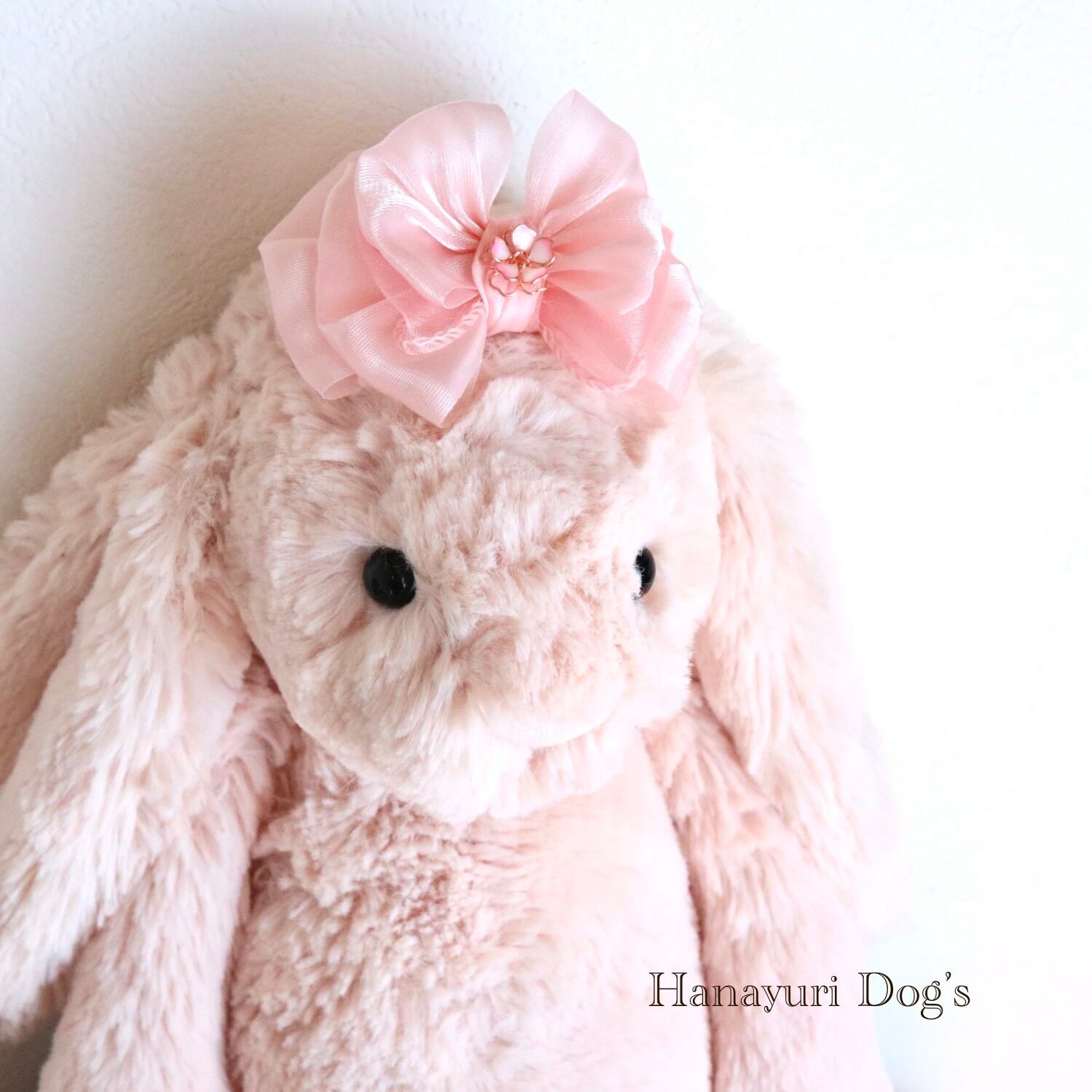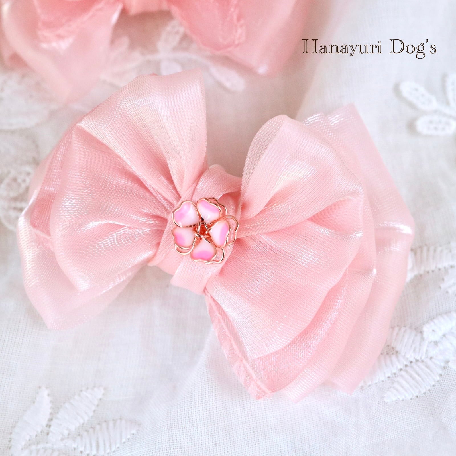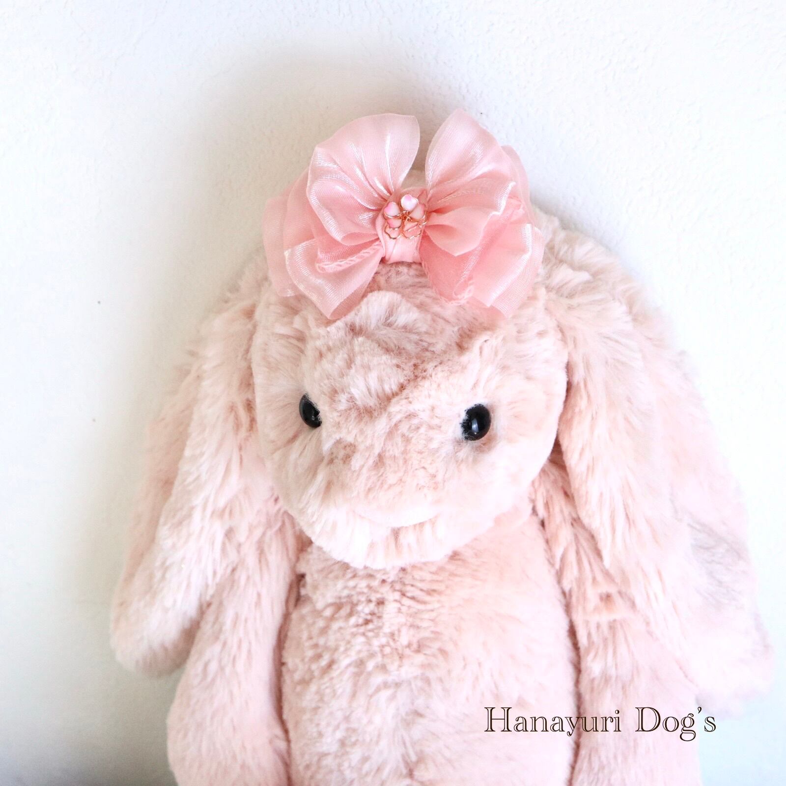 ピンクオーガンジーと桜ビジュー 春 犬バレッタ キッズ・子供リボン ペット ぬいぐるみ ヘアアクセサリー 髪飾り 普段着 うちの子記念日 誕生日 プレゼント オフ会 イベント 撮影