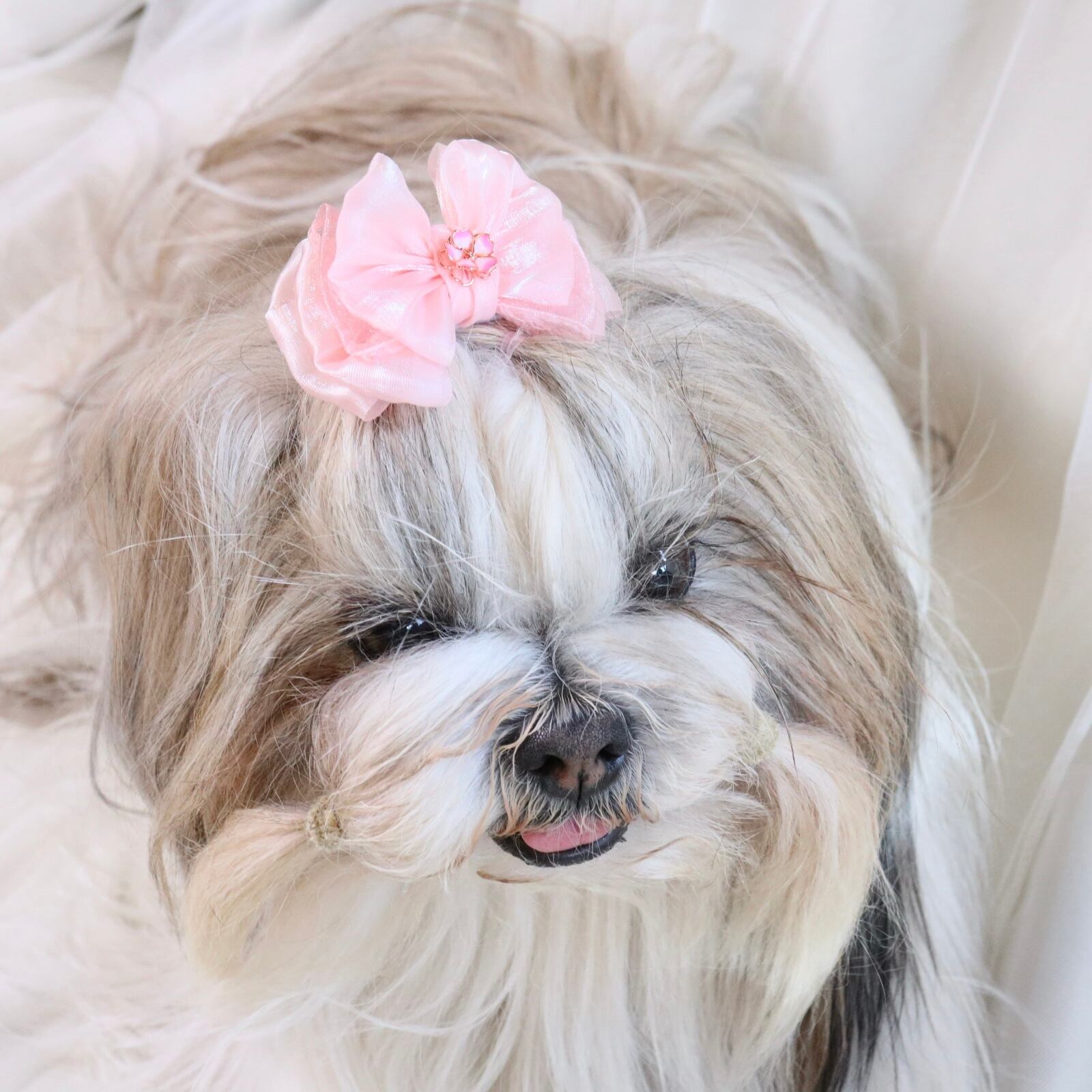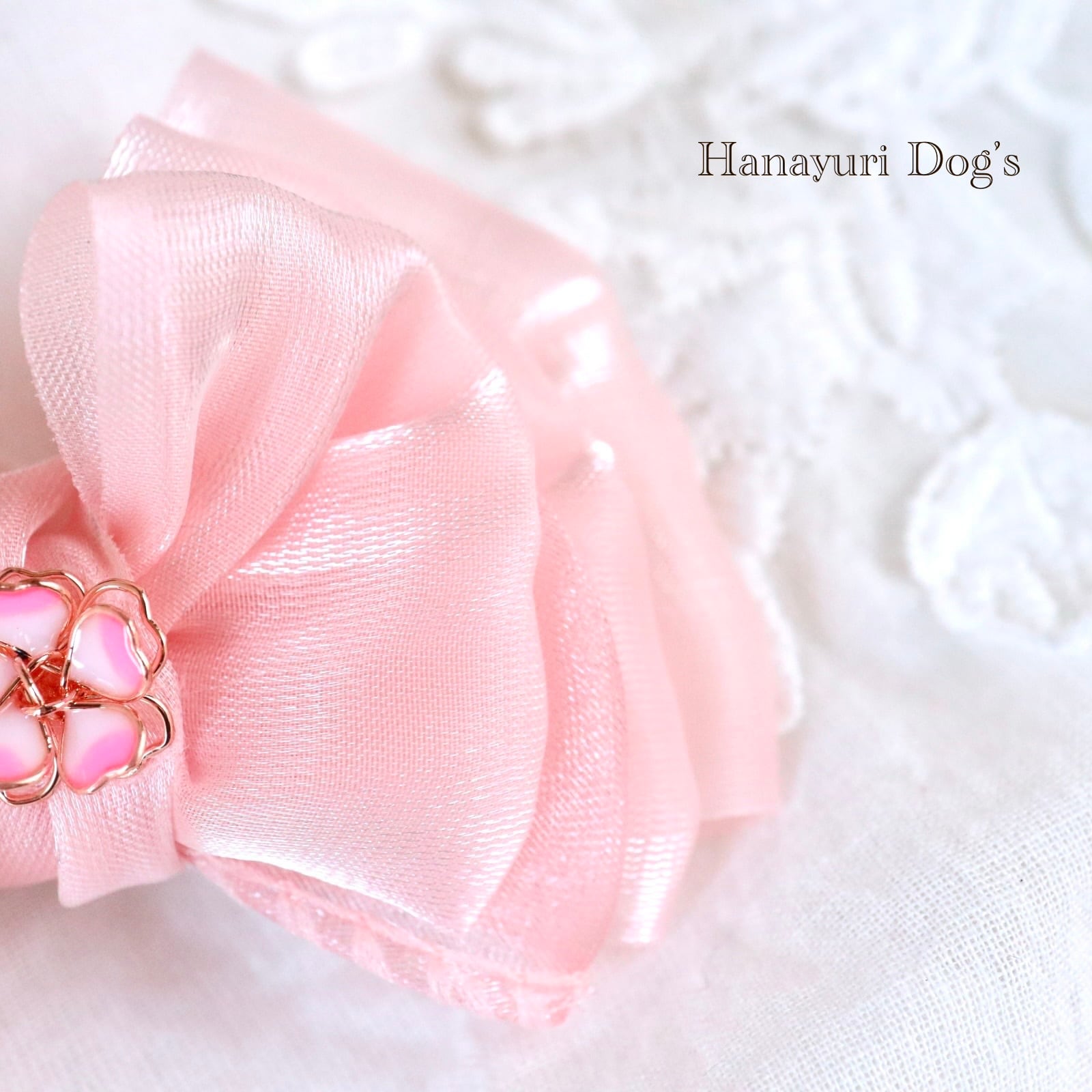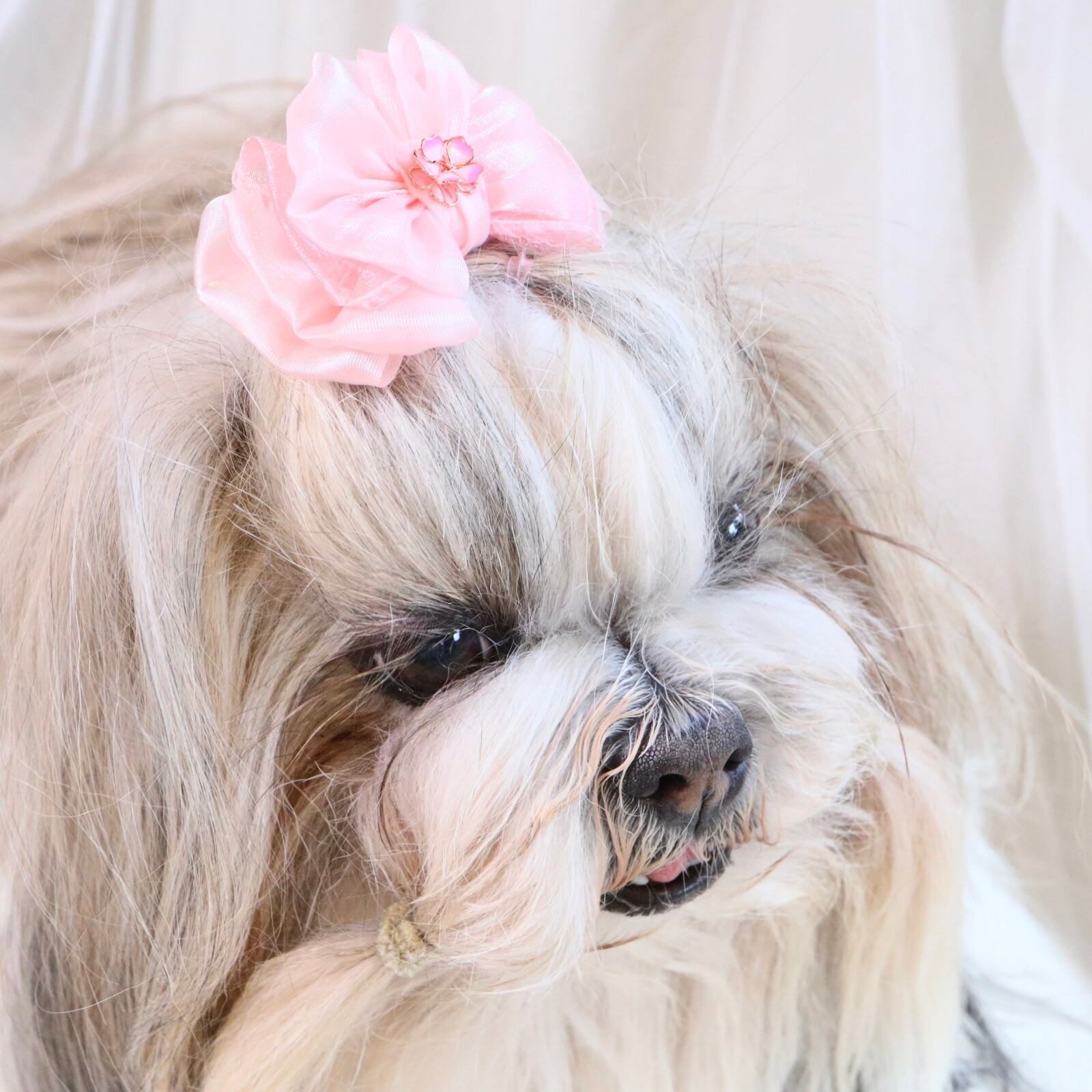 ピンクオーガンジーと桜ビジュー 春 犬バレッタ キッズ・子供リボン ペット ぬいぐるみ ヘアアクセサリー 髪飾り 普段着 うちの子記念日 誕生日 プレゼント オフ会 イベント 撮影