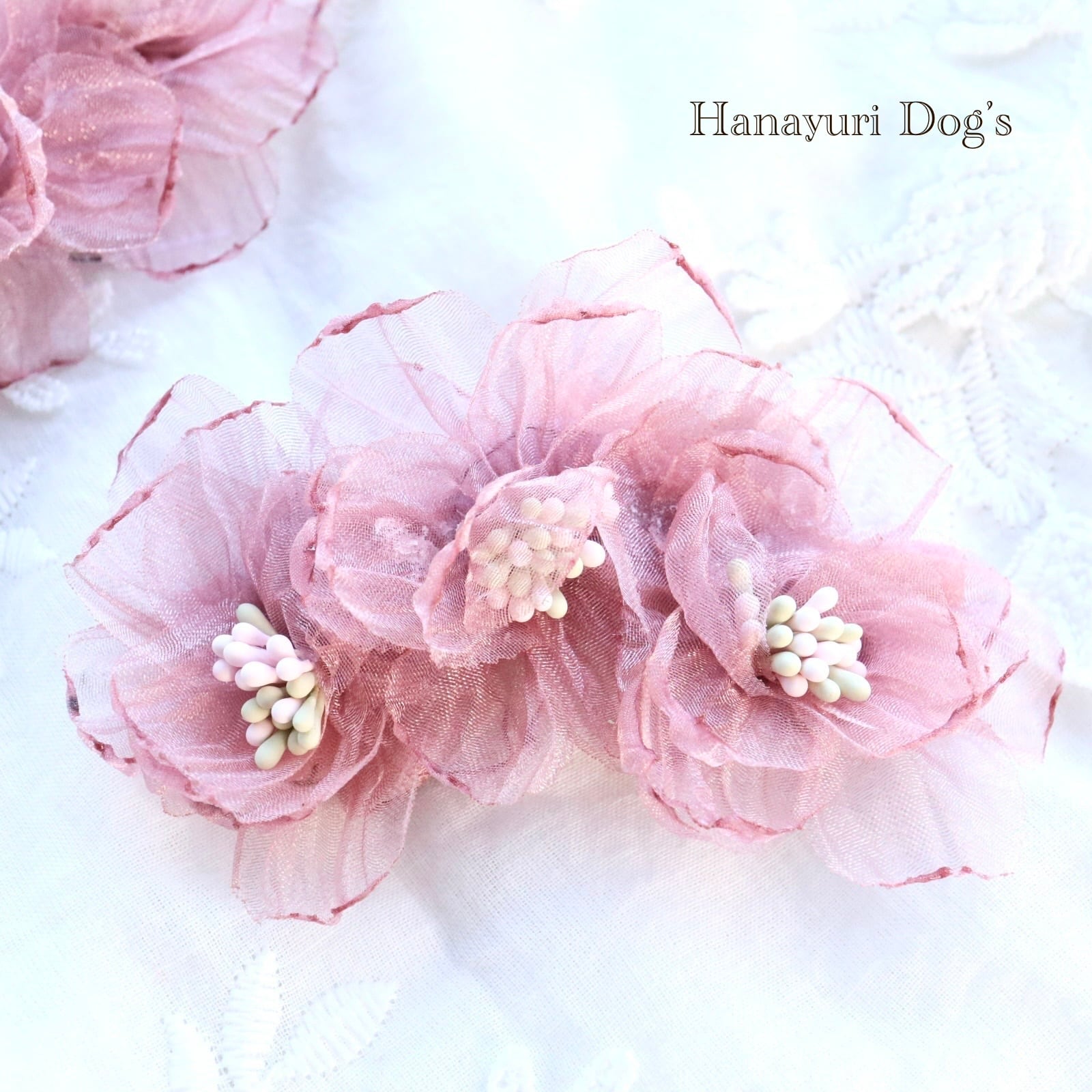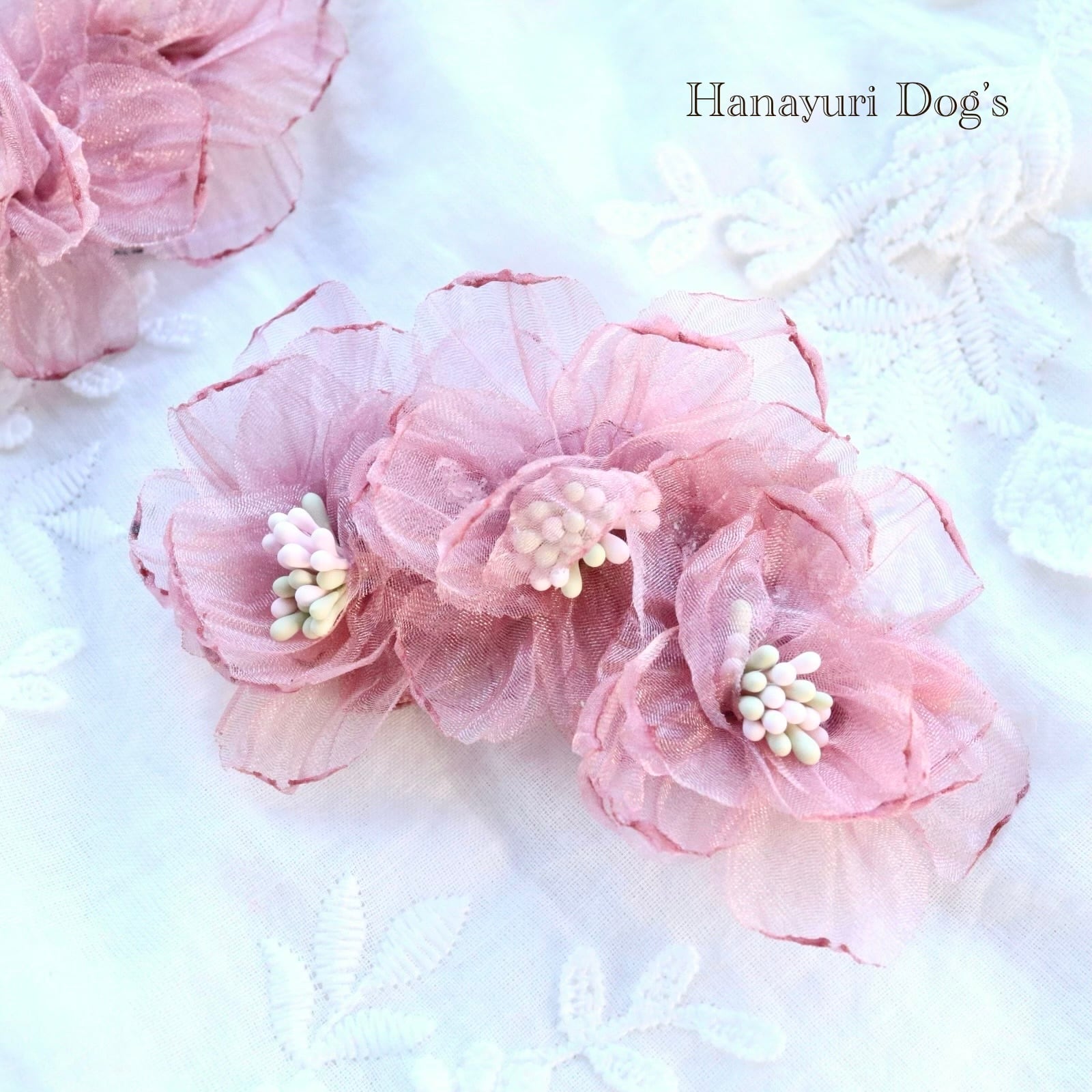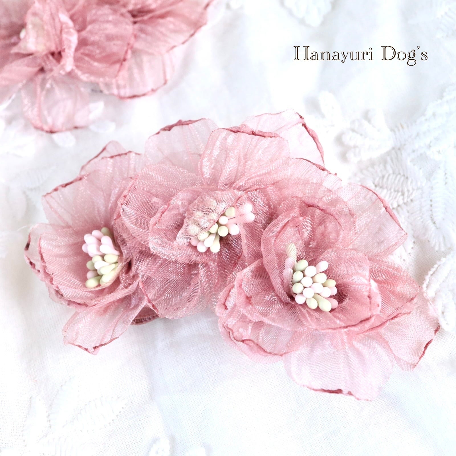 オーガンジーの花 クラシカルピンク 犬バレッタ キッズ・子供リボン ペット ぬいぐるみ ヘアアクセサリー 髪飾り 誕生日 プレゼント オフ会 イベント 撮影 うちの子記念日