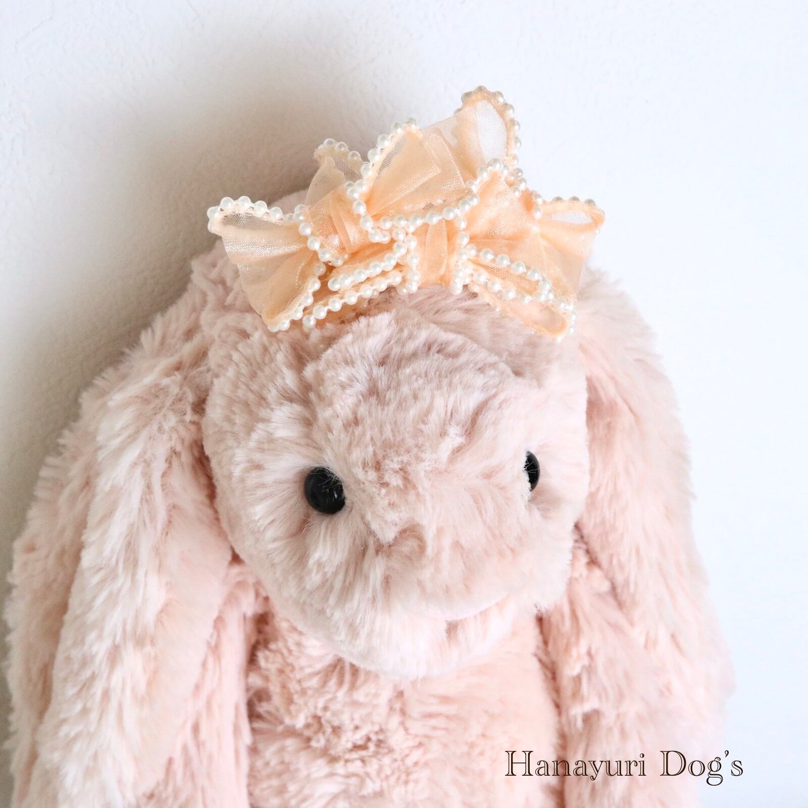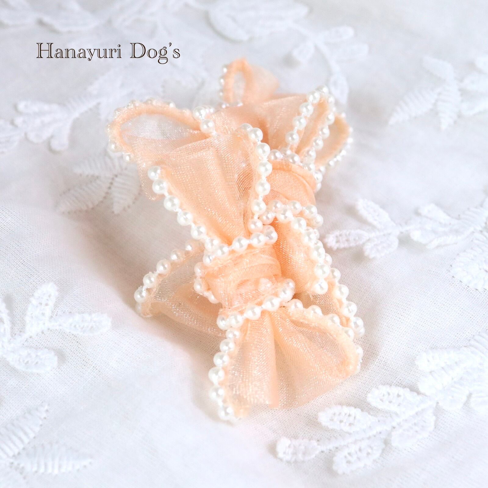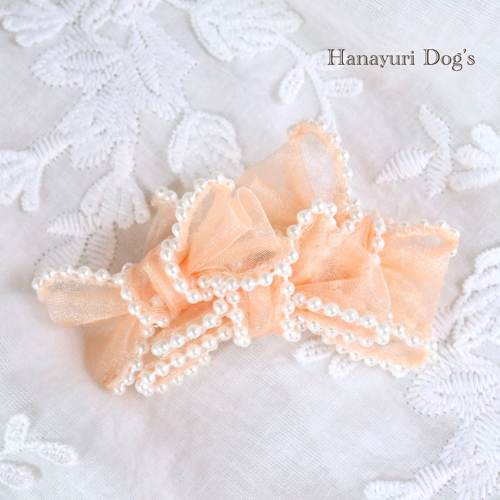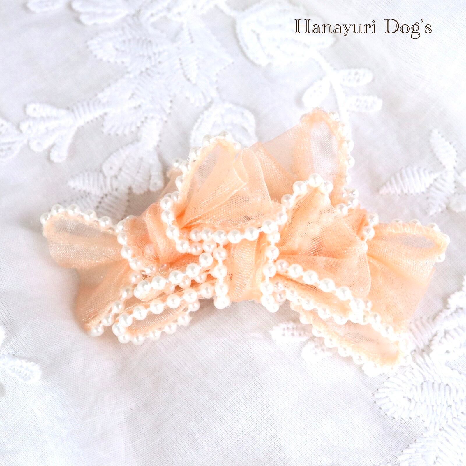 パールオーガンジー サーモンピンク 犬バレッタ キッズ・子供リボン ペット ぬいぐるみ ヘアアクセサリー 髪飾り 誕生日 記念日 プレゼント オフ会 うちの子記念日 イベント 撮影