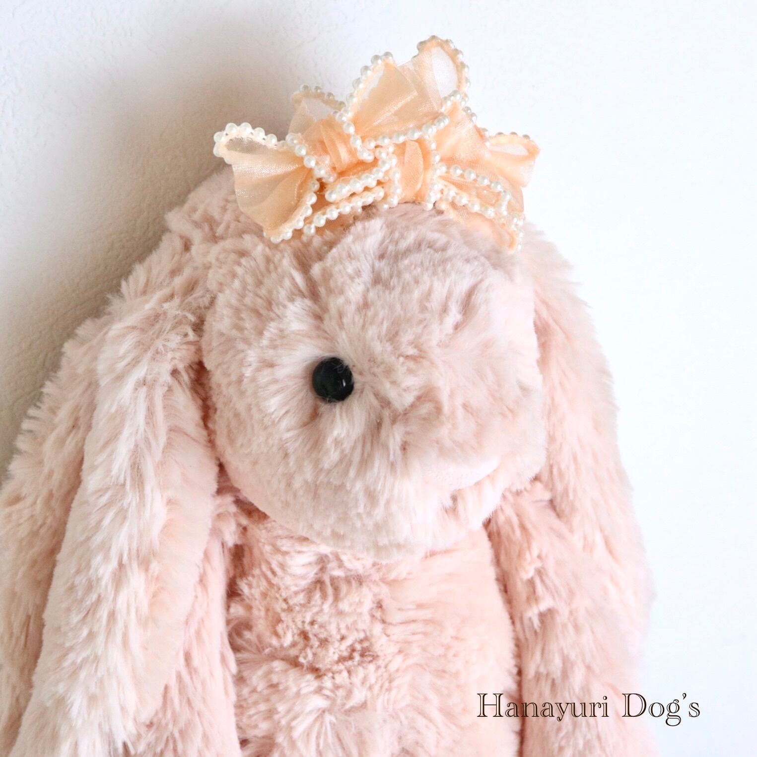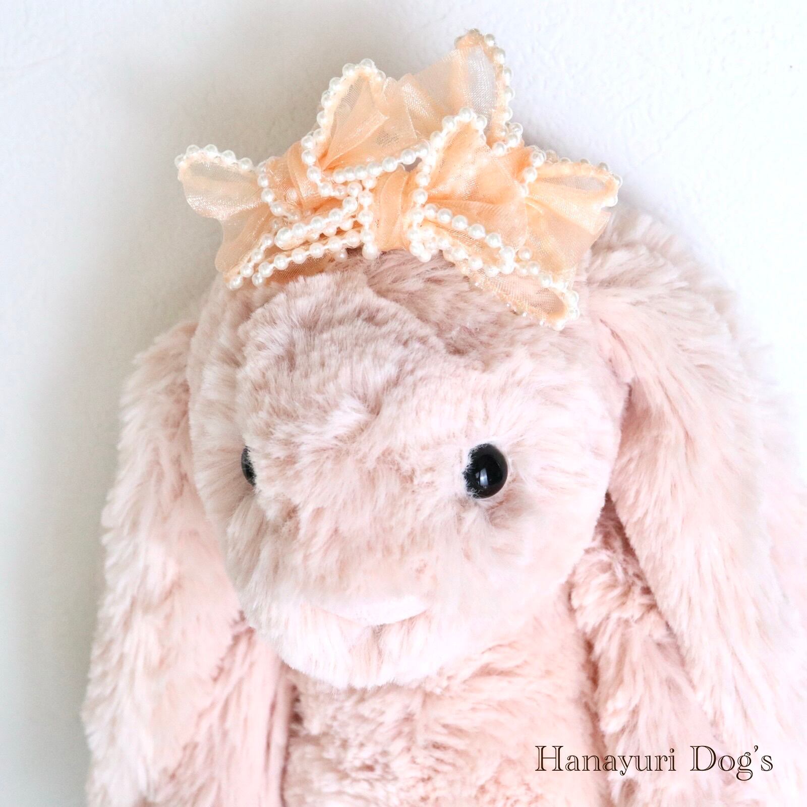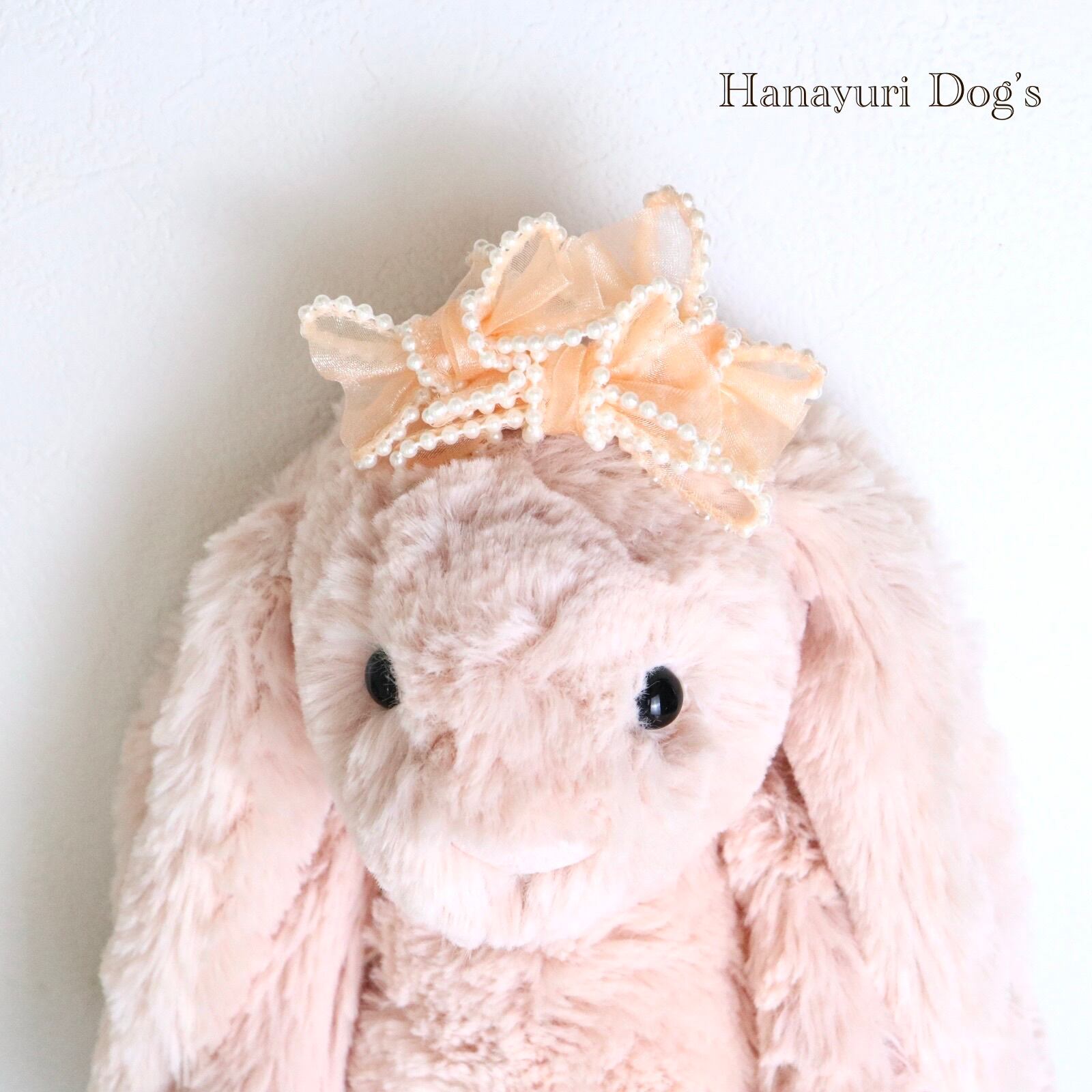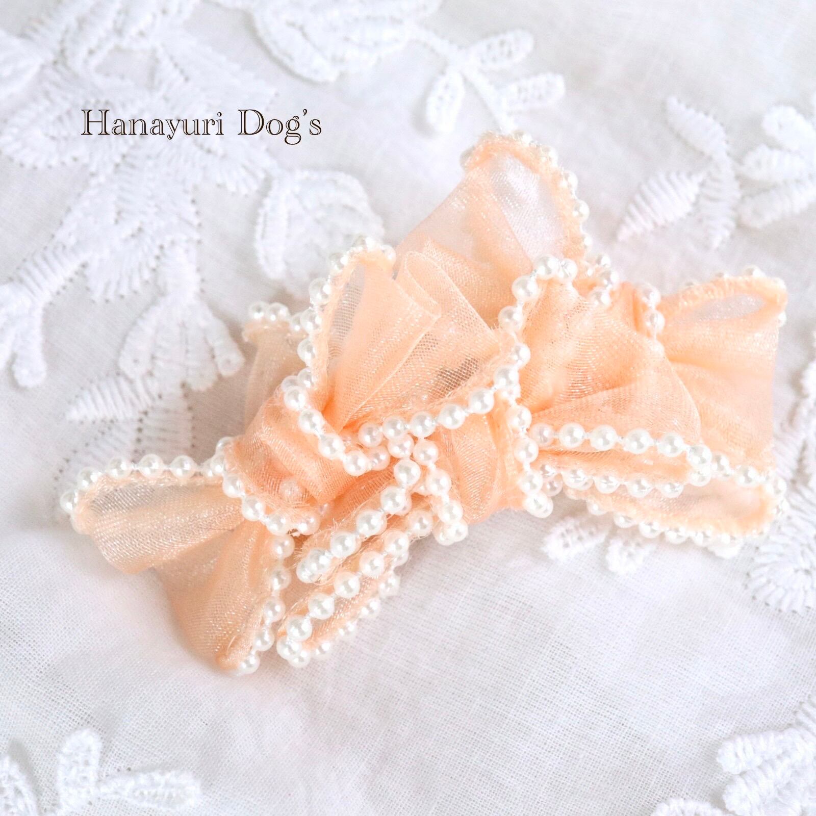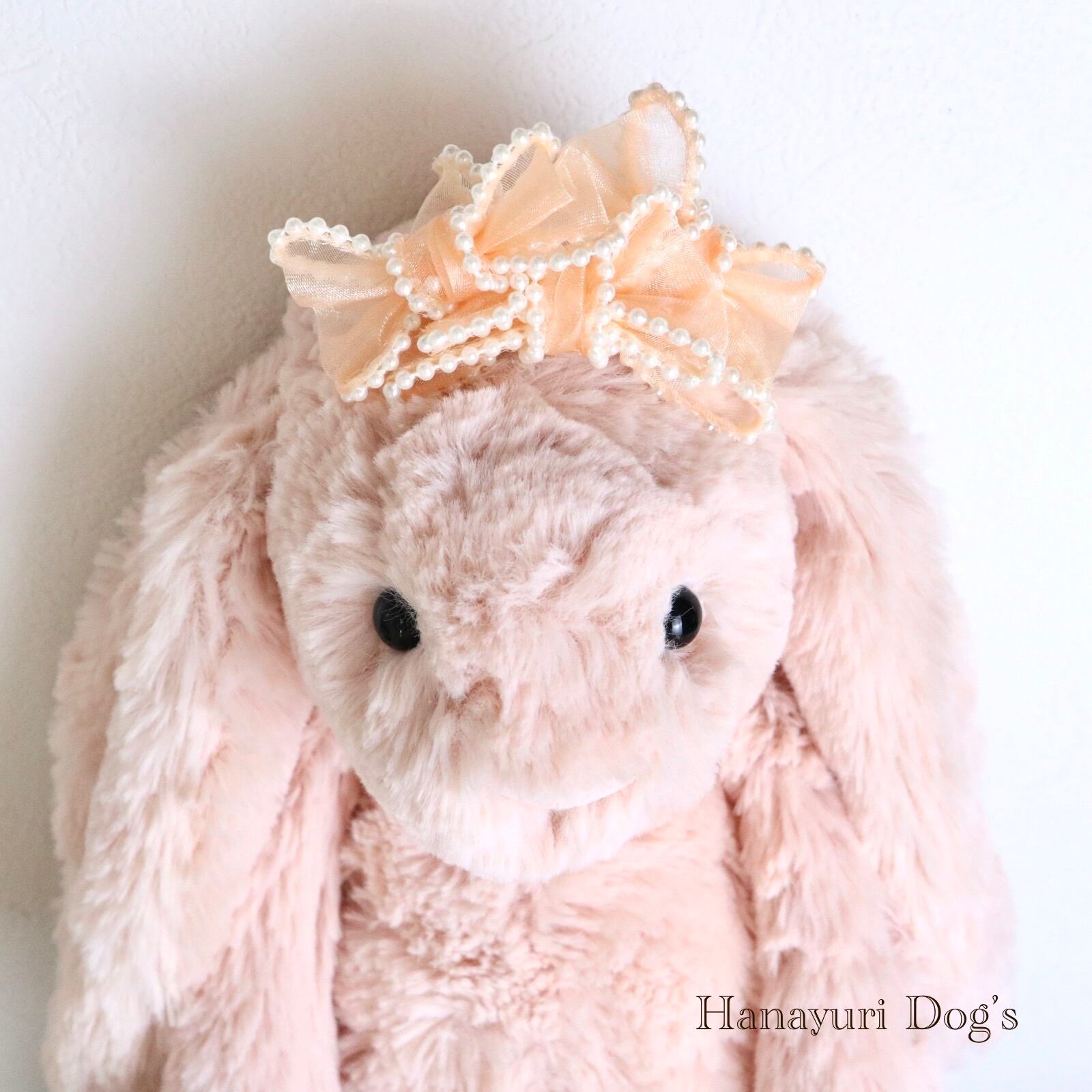 パールオーガンジー サーモンピンク 犬バレッタ キッズ・子供リボン ペット ぬいぐるみ ヘアアクセサリー 髪飾り 誕生日 記念日 プレゼント オフ会 うちの子記念日 イベント 撮影