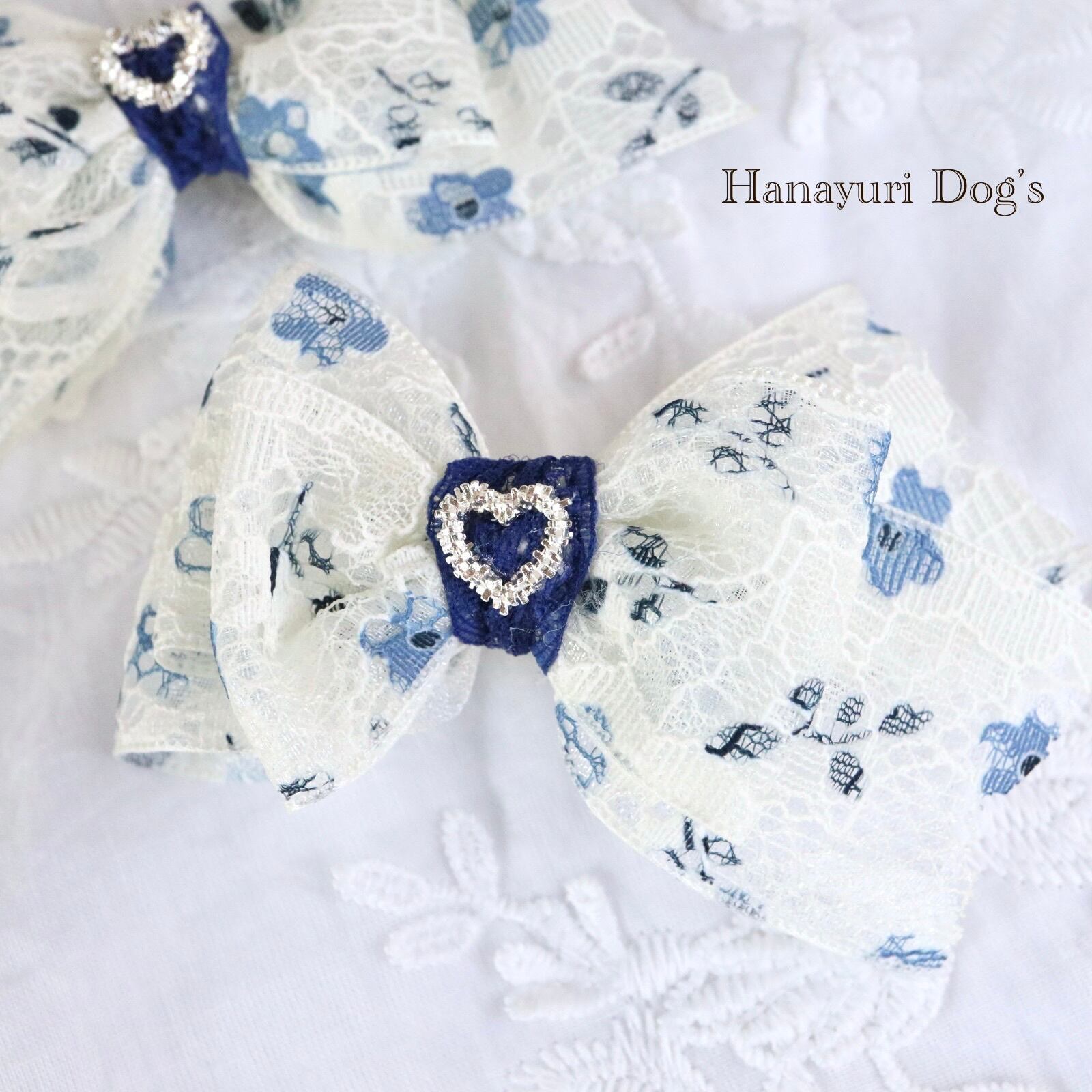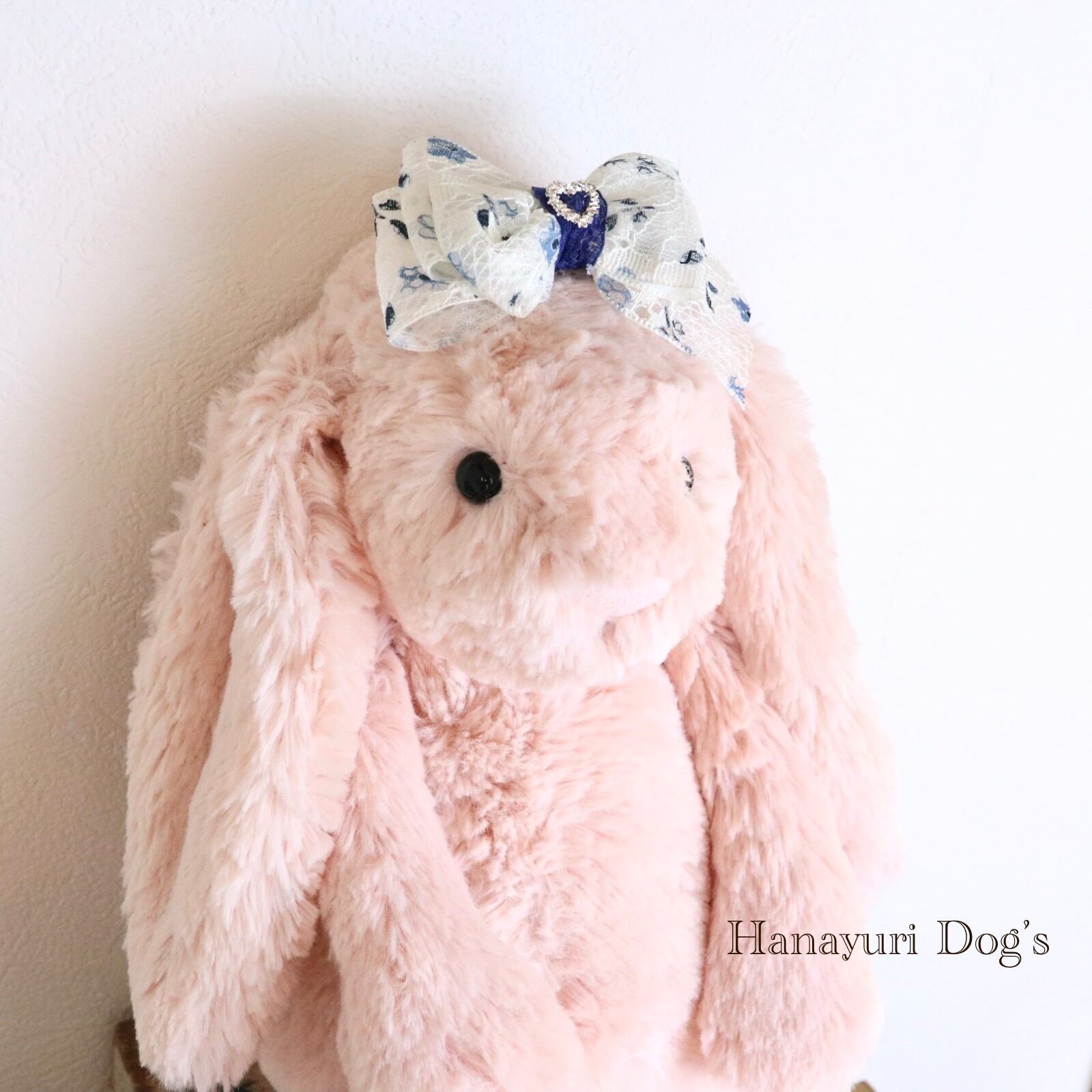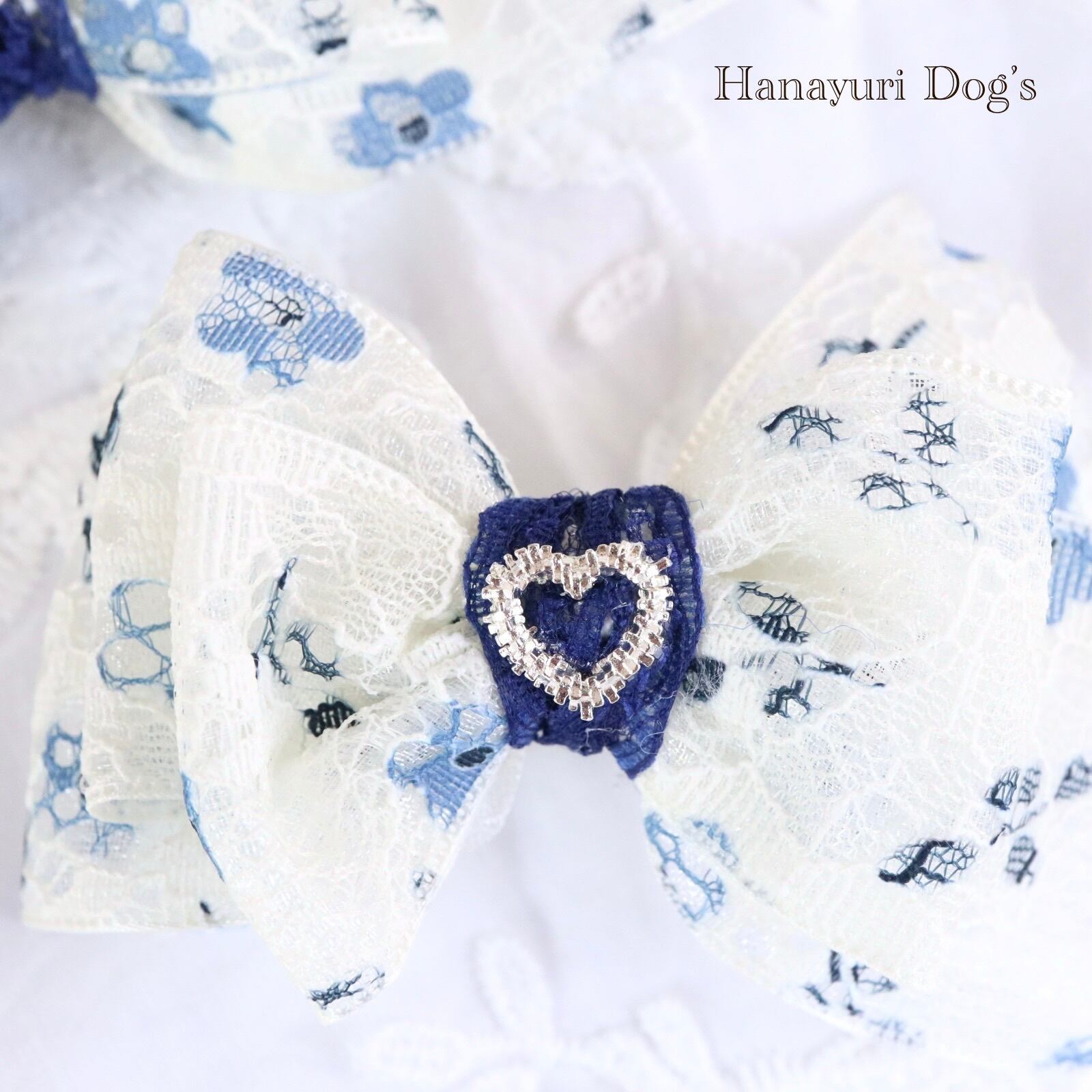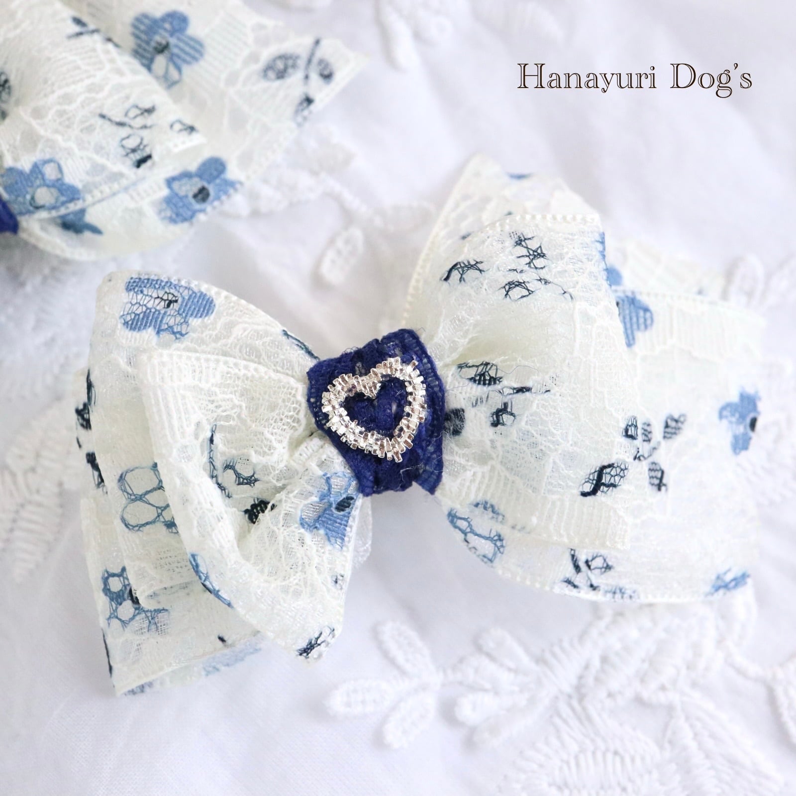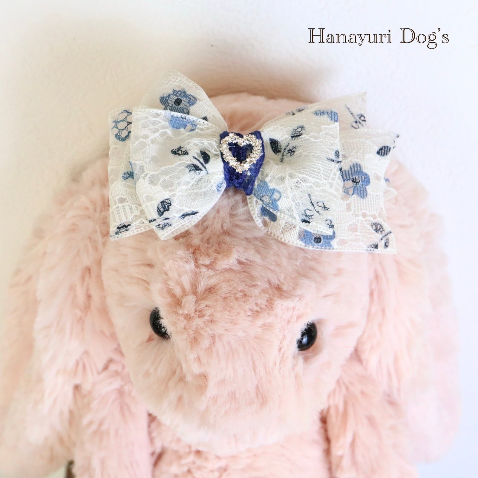 二枚重ねリボン 青い花 ハートビジュー 犬バレッタ キッズ・子供リボン ペット ぬいぐるみ ヘアアクセサリー 髪飾り 誕生日 記念日 プレゼント オフ会 うちの子記念日 イベント 撮影