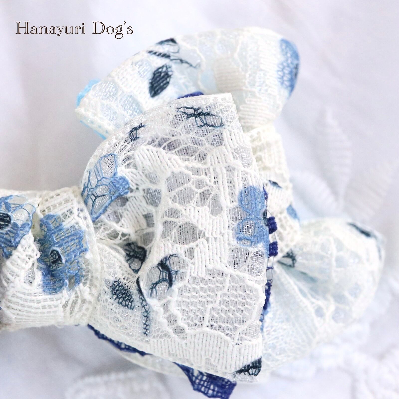 オーガンジーとレースの二枚重ねのブルーの花柄リボンです。