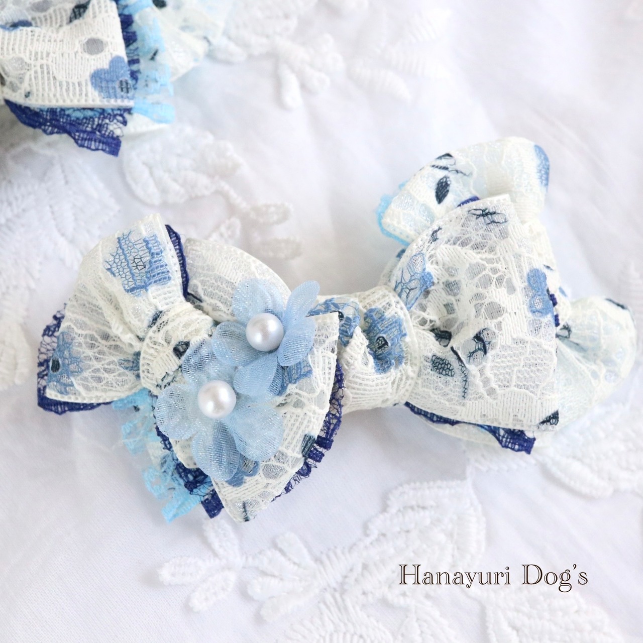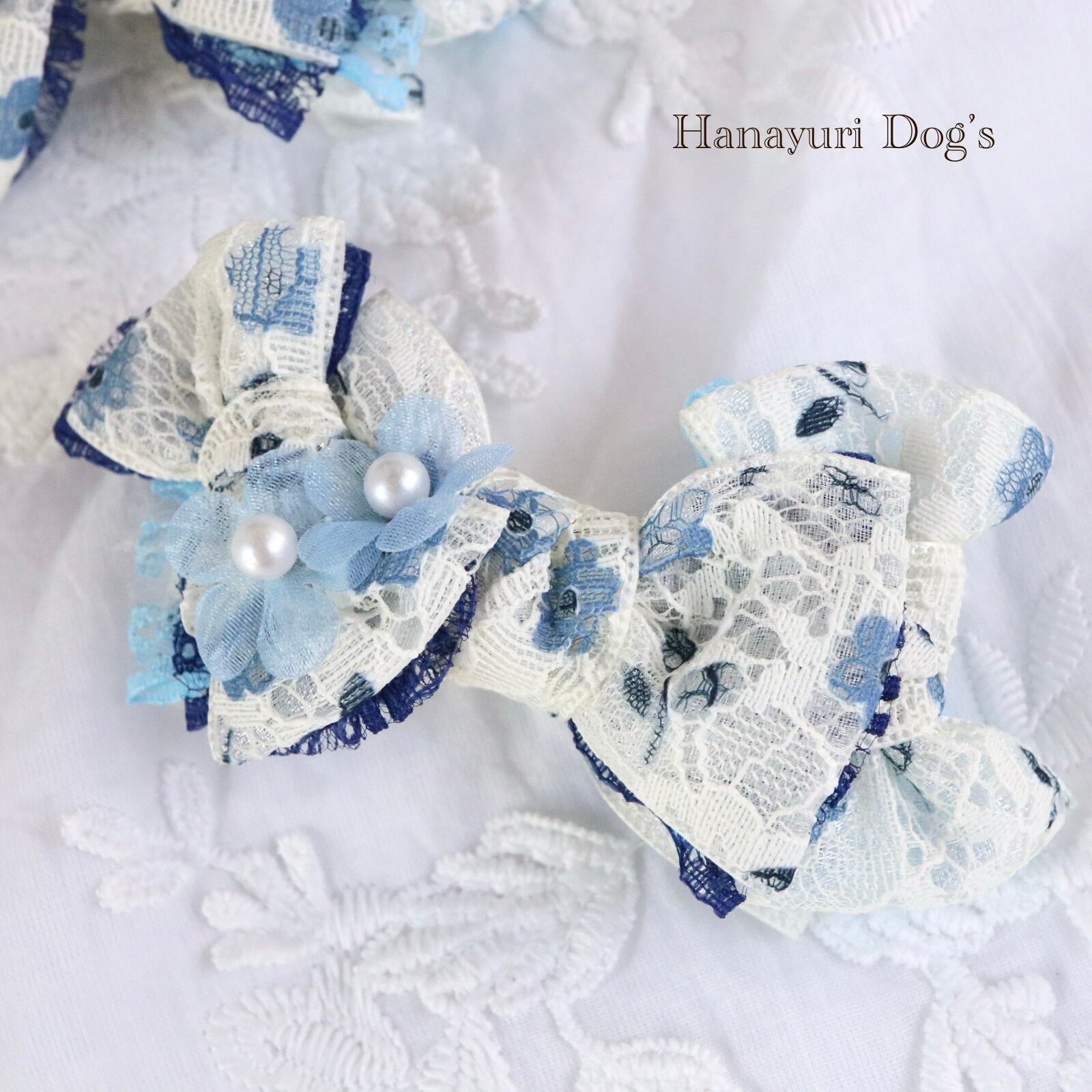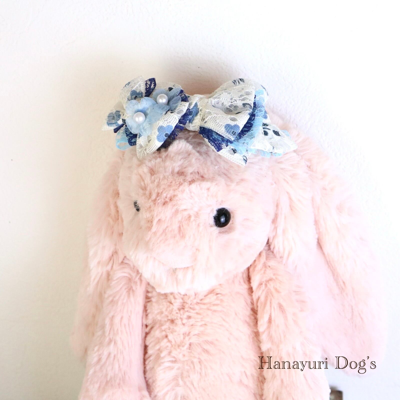 二枚重ねリボン 青い花 パールの花2 犬バレッタ キッズ・子供リボン ペット ぬいぐるみ ヘアアクセサリー 髪飾り 誕生日 記念日 プレゼント オフ会 うちの子記念日 イベント 撮影