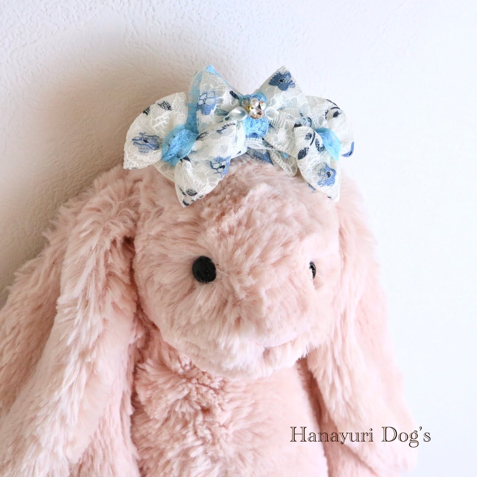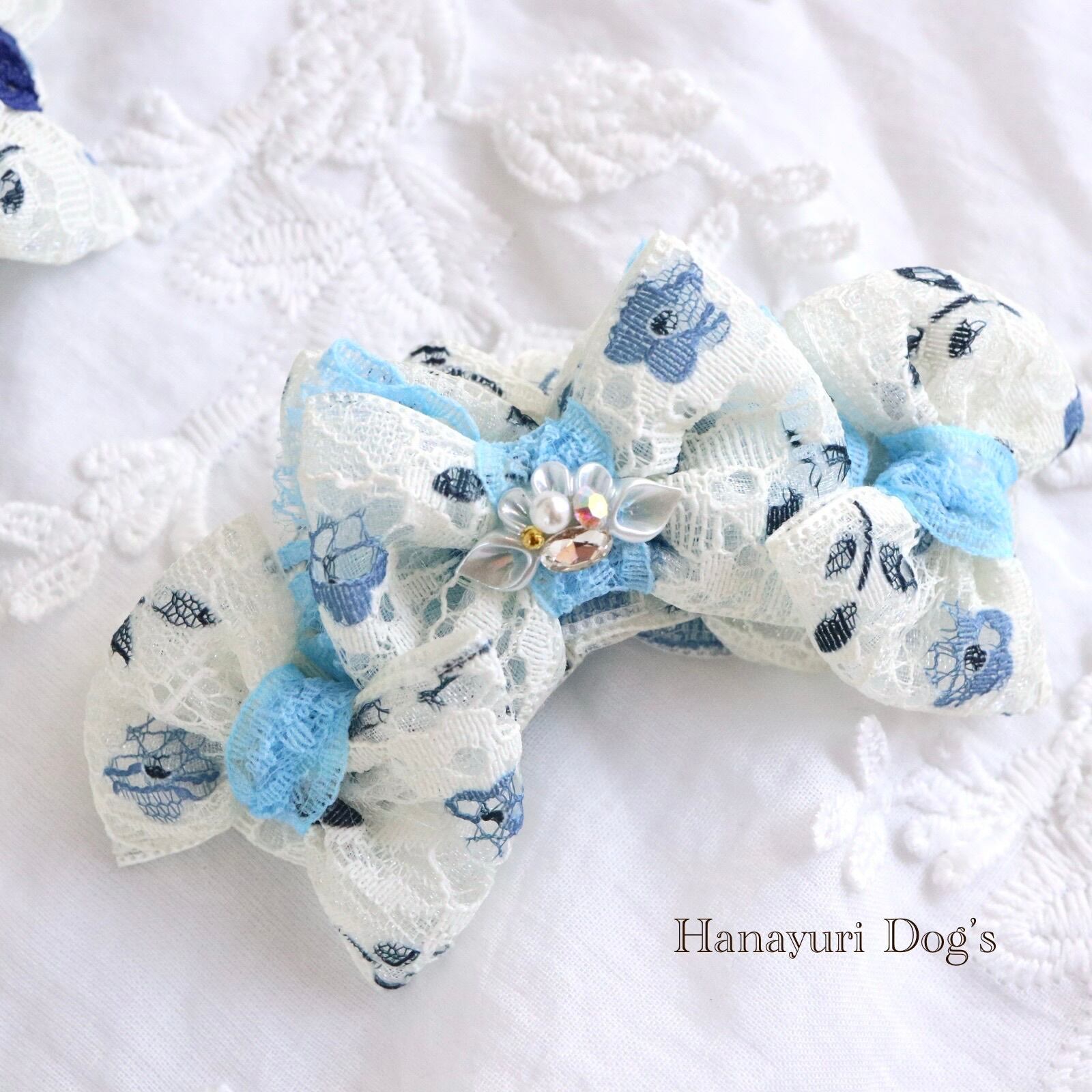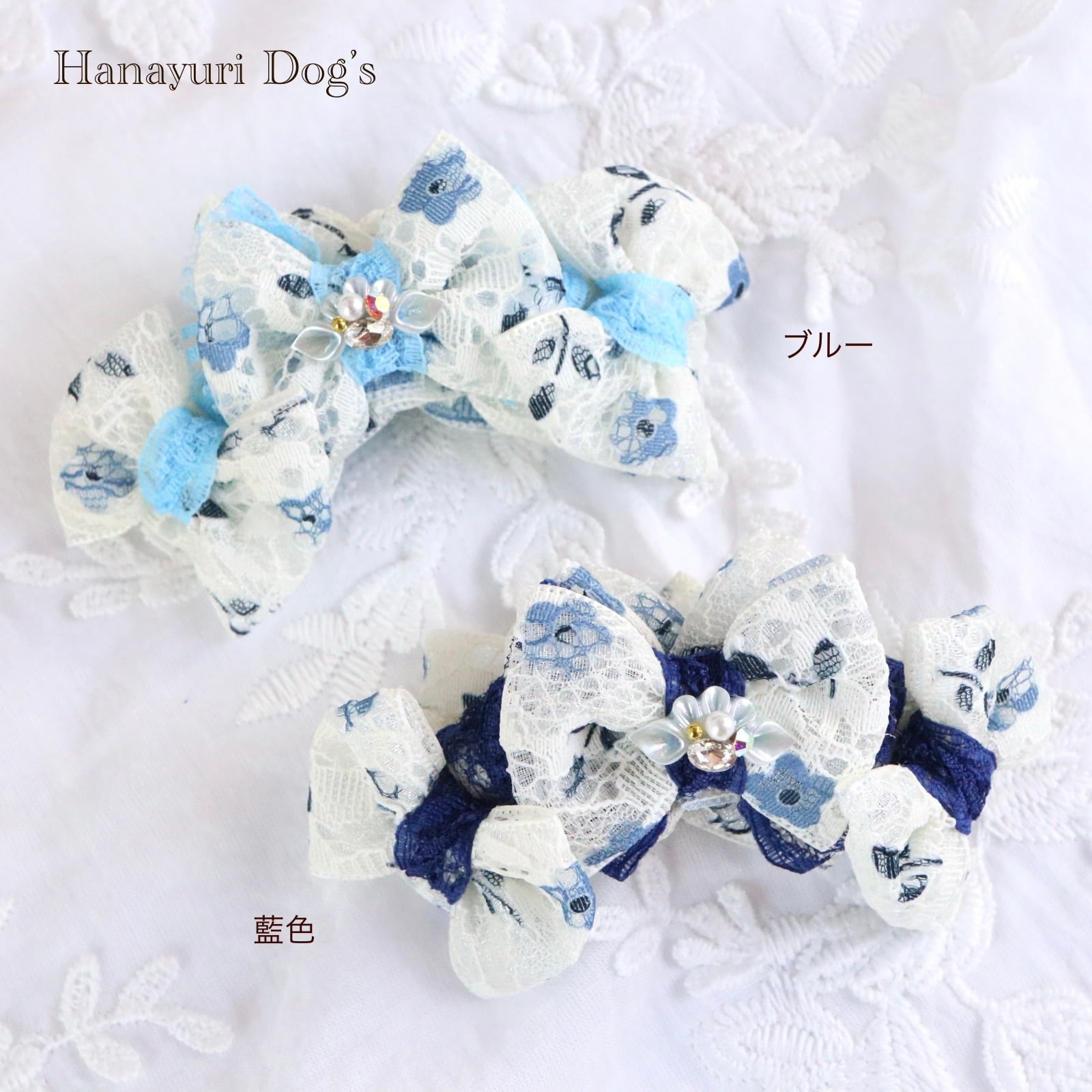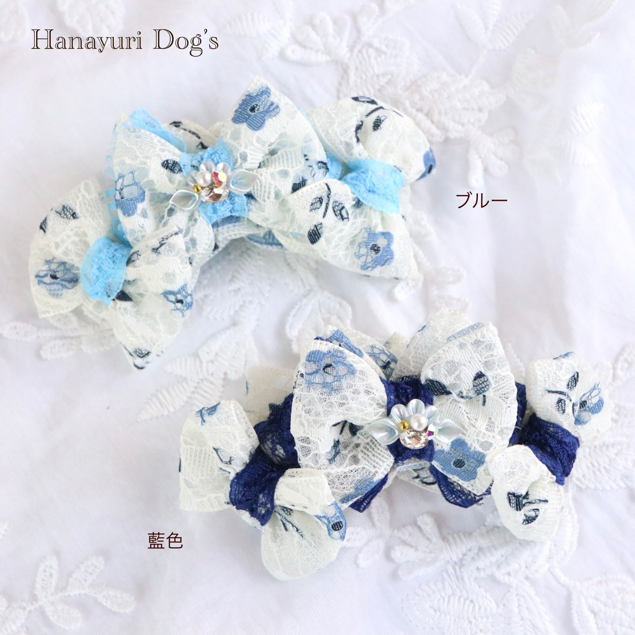 二枚重ねリボン 青い花 2色1P パール貝ビジュー 犬バレッタ キッズ・子供リボン ペット ぬいぐるみ ヘアアクセサリー 髪飾り 誕生日 記念日 プレゼント オフ会 うちの子記念日 イベント 撮影