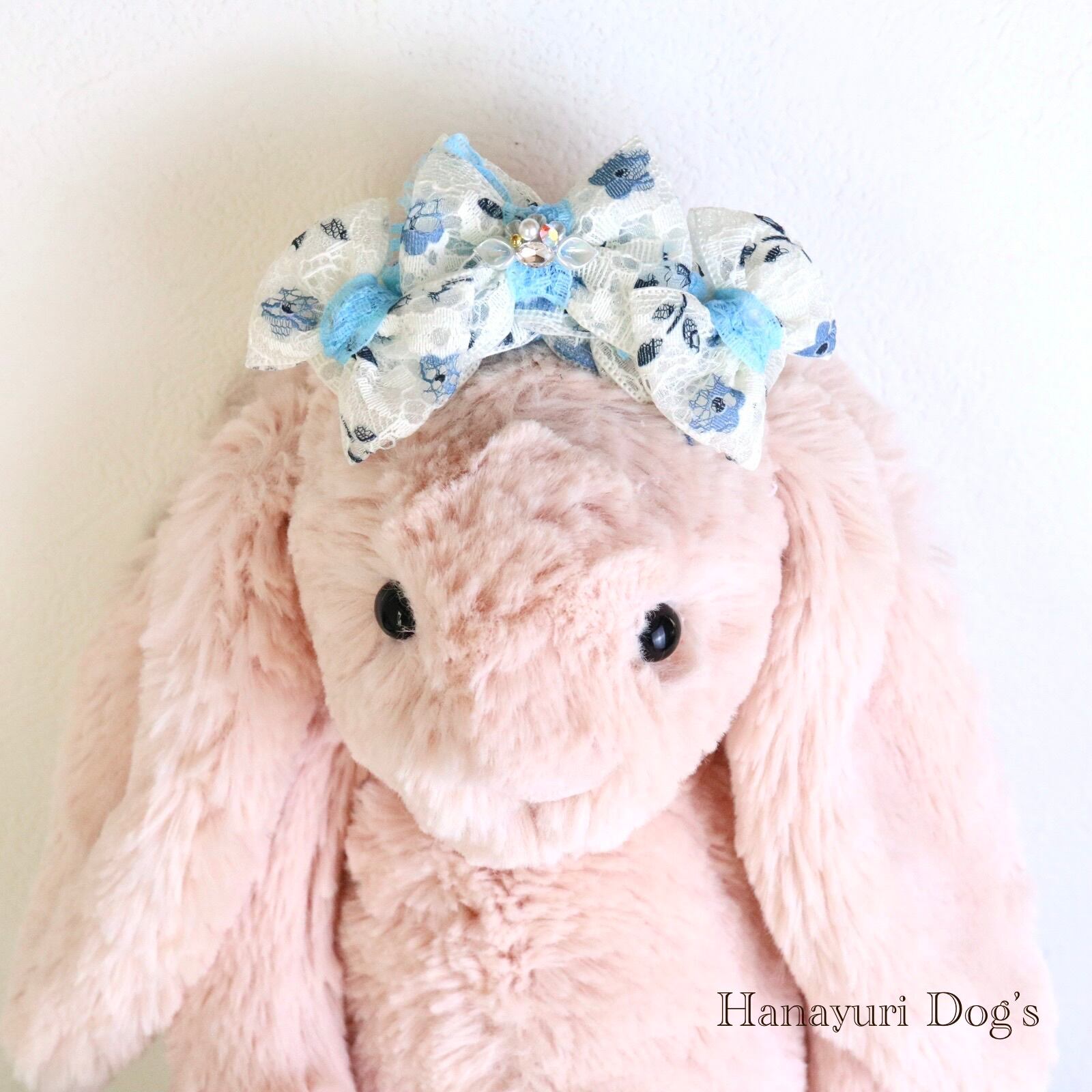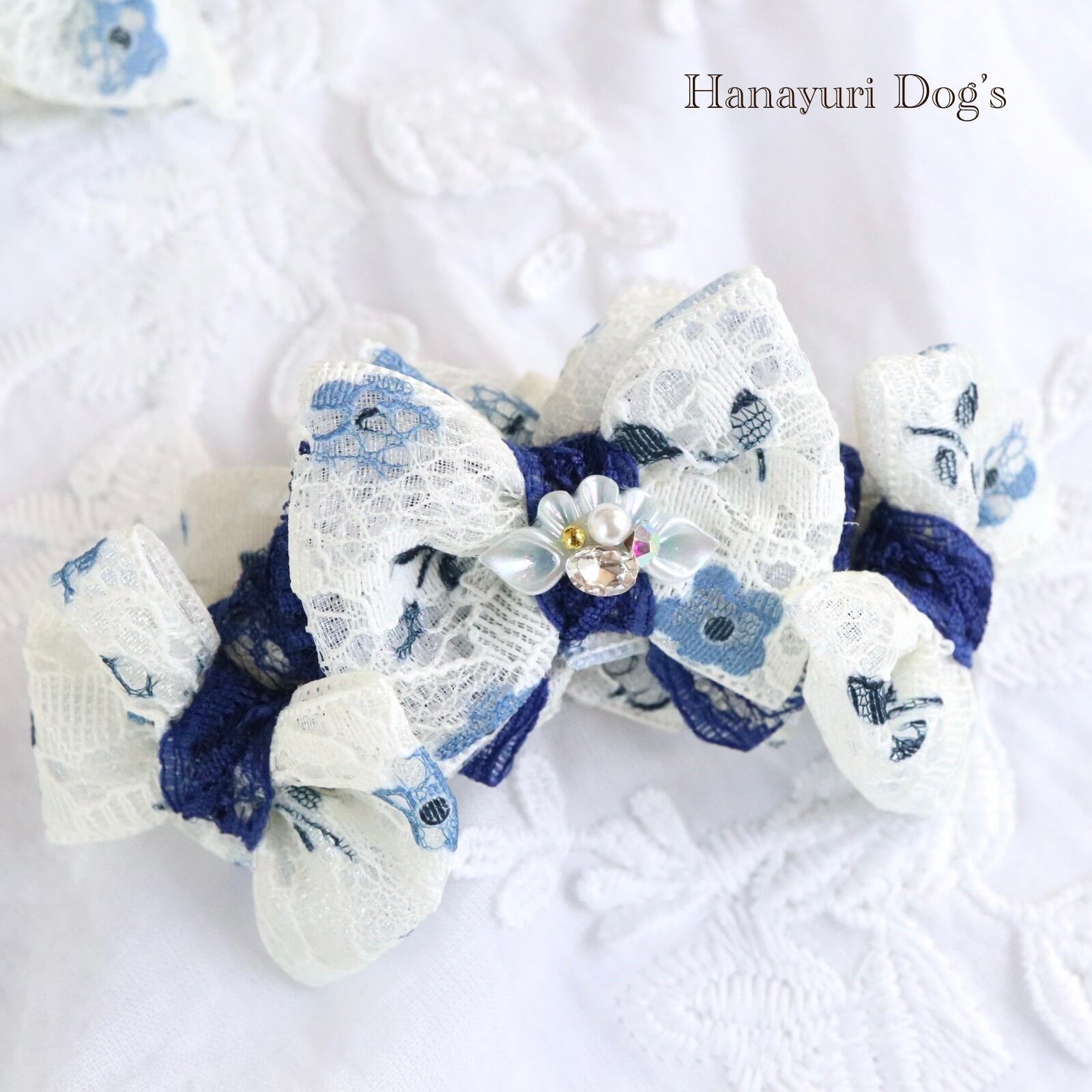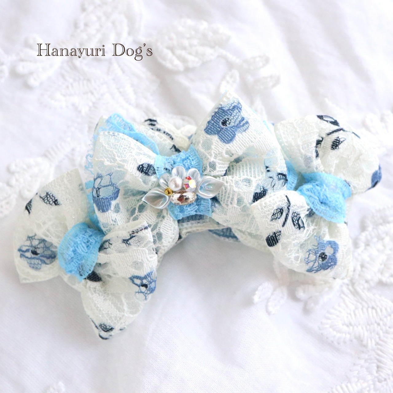 二枚重ねリボン 青い花 2色1P パール貝ビジュー 犬バレッタ キッズ・子供リボン ペット ぬいぐるみ ヘアアクセサリー 髪飾り 誕生日 記念日 プレゼント オフ会 うちの子記念日 イベント 撮影