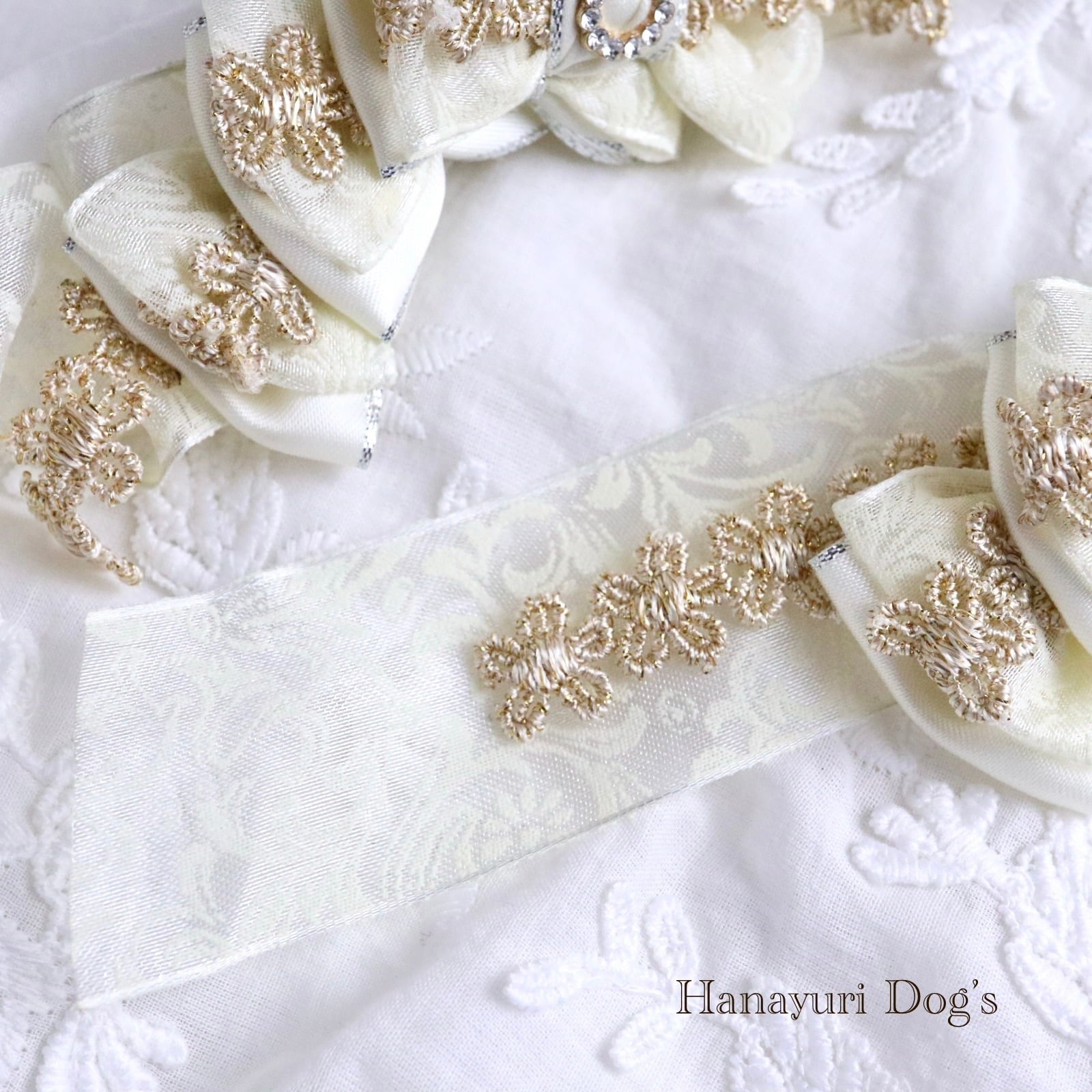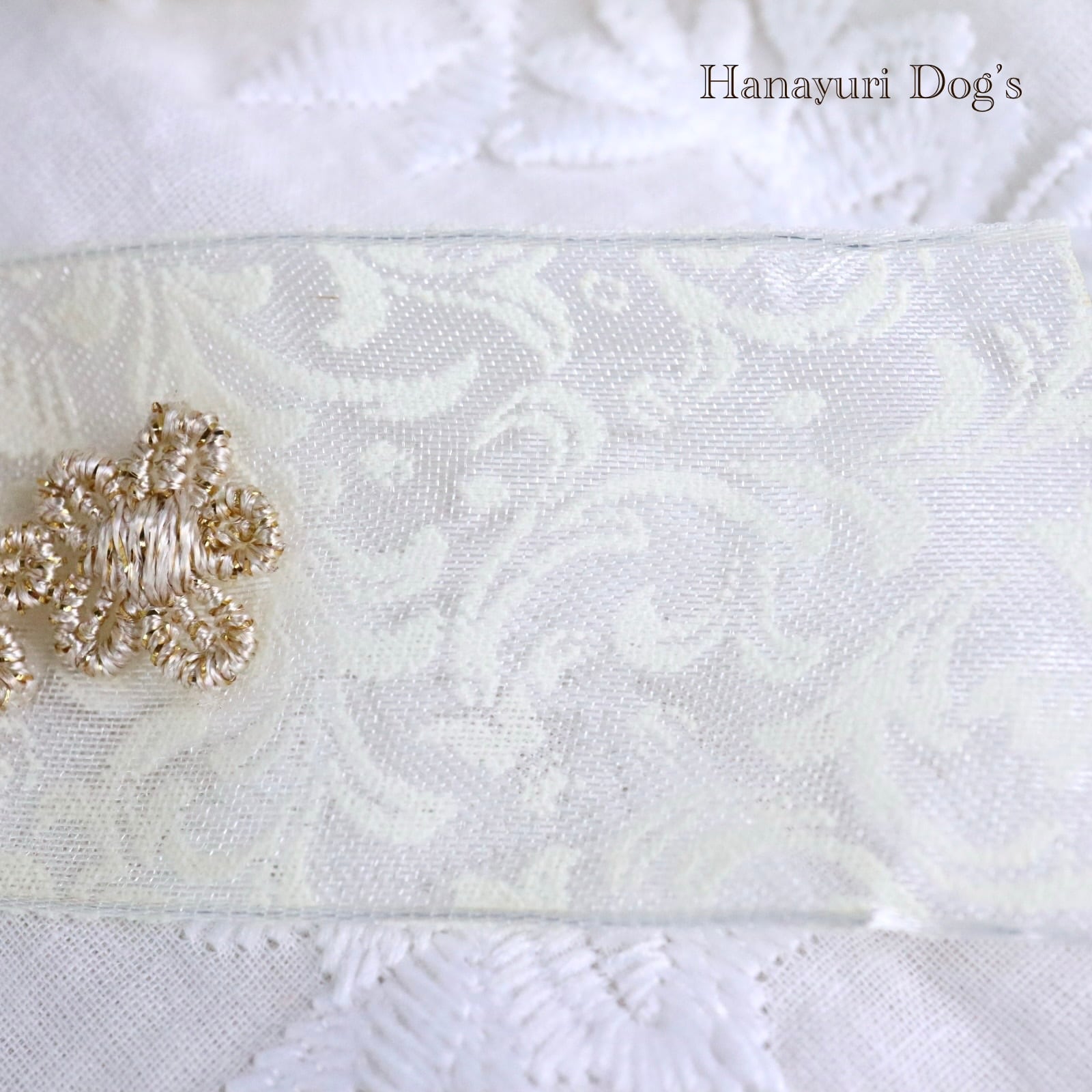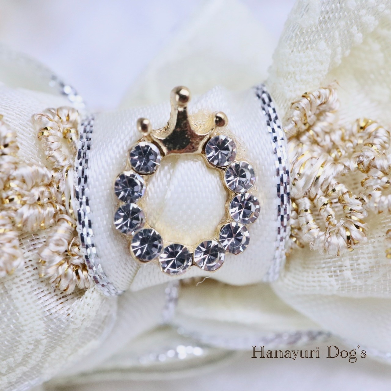 凹凸のある植物柄レース、銀エッジリボン、金の刺繍花の豪華リボンと小さなクラウンリースビジューがエレガントで高級感を感じるバレッタリボンです。