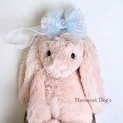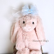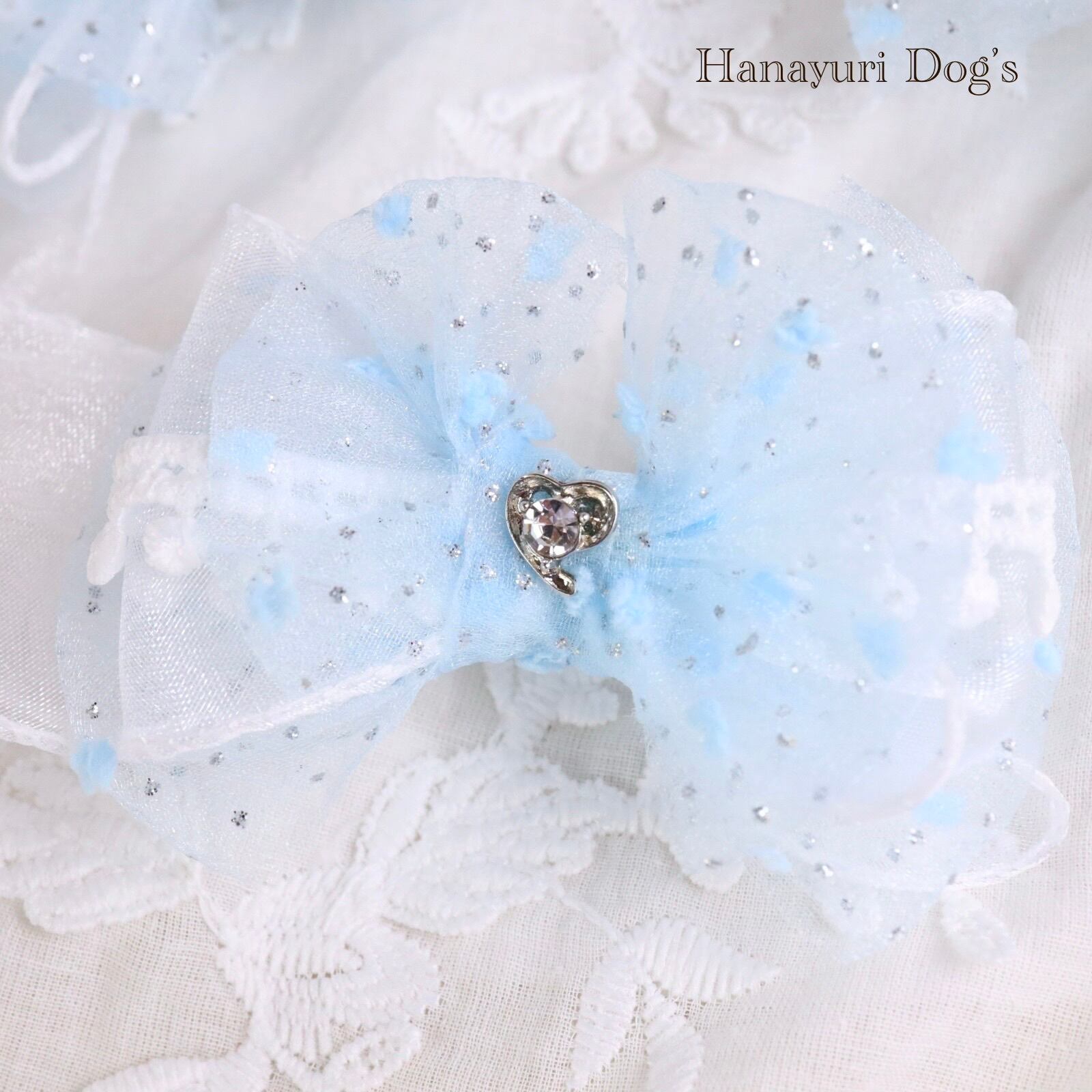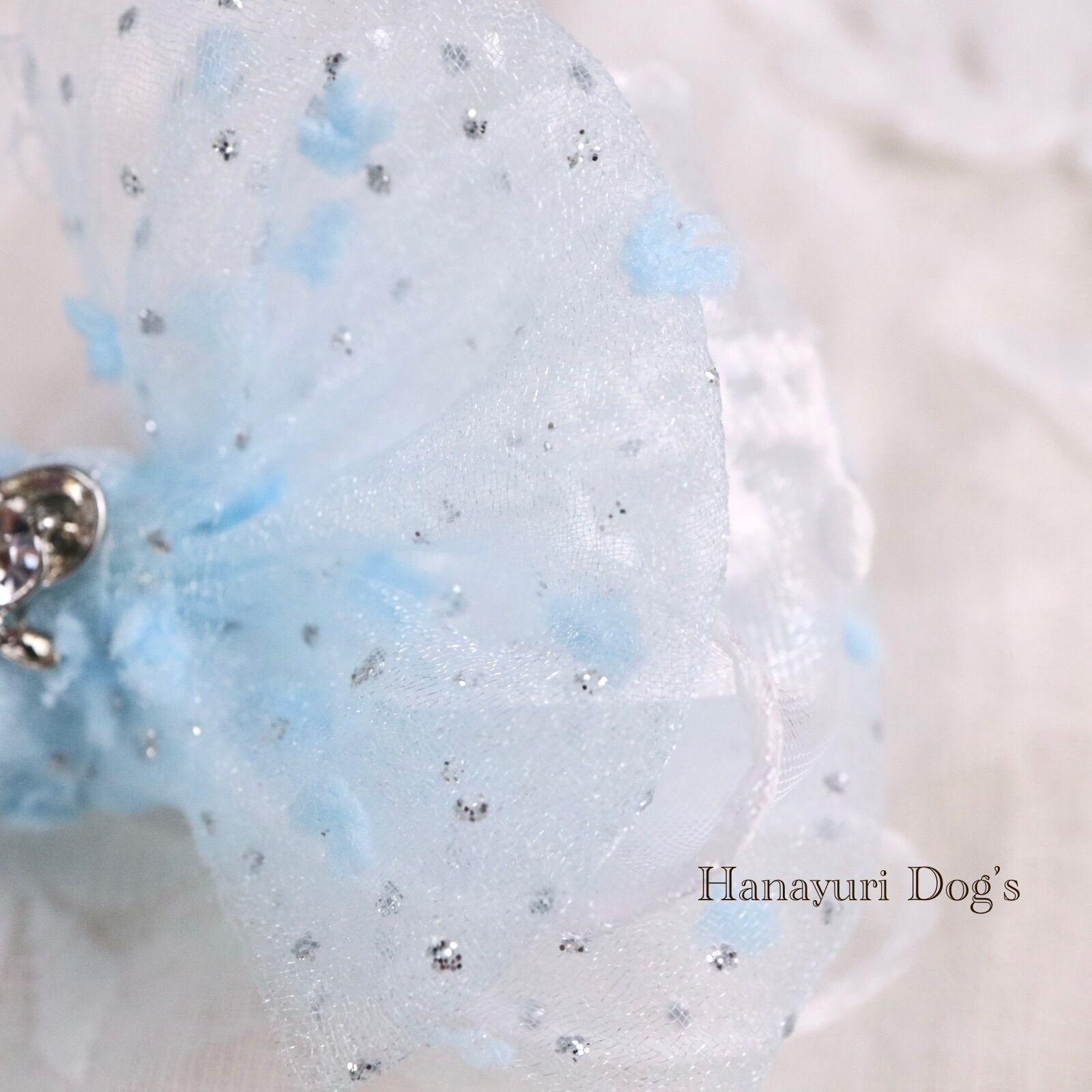 淡いブルーのオーガンジーには無数の小さなラインストーンが煌めき、ブルーの綿のようなドットが愛らしいリボンです。