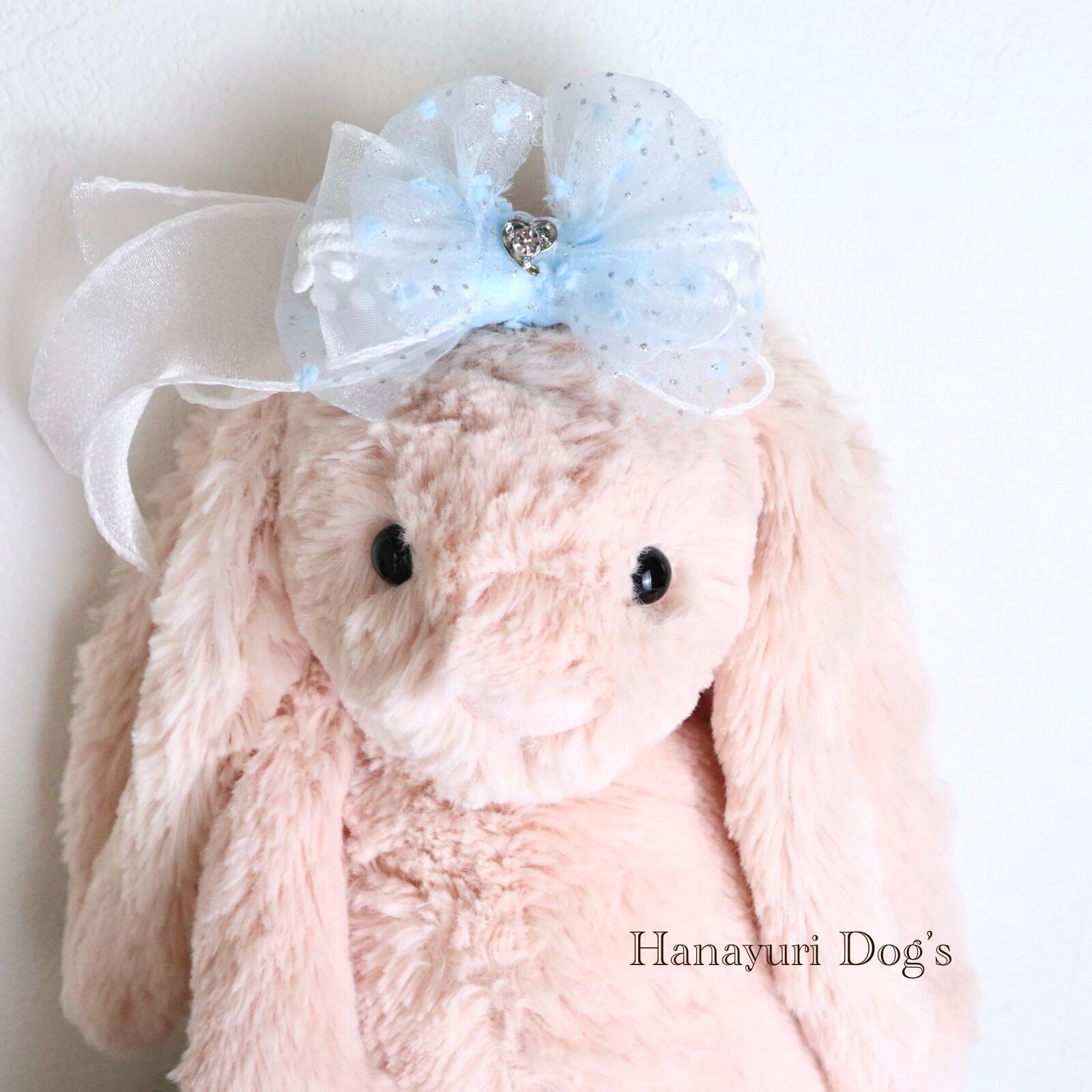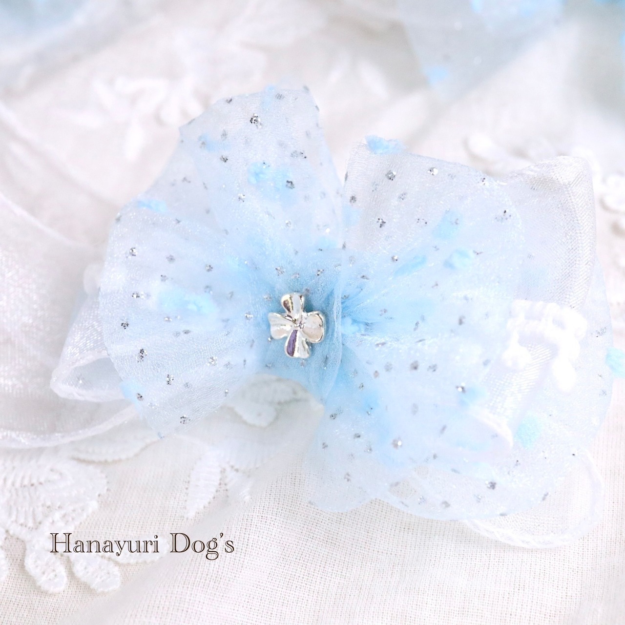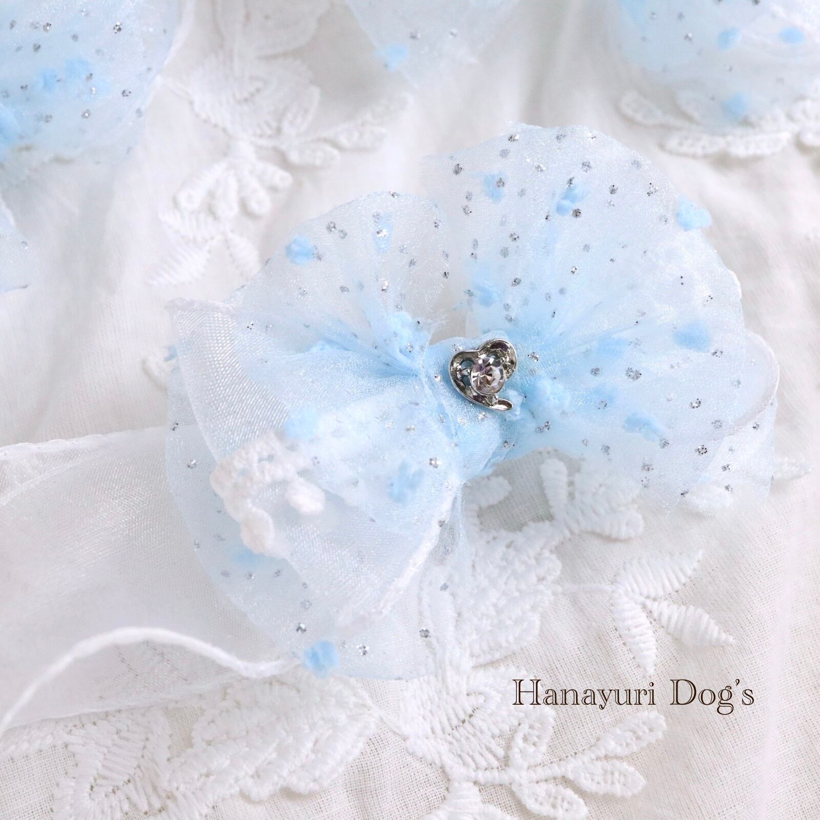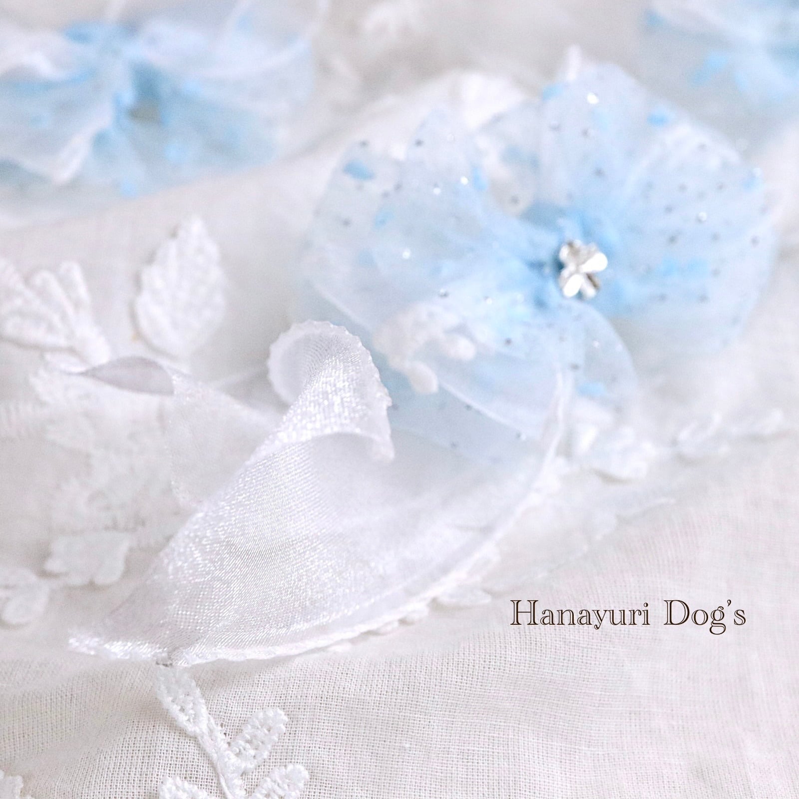 流れるオーガンジー ブルー×ホワイト ハート・花1P ラインストーン 犬バレッタ キッズ・子供リボン ペット ぬいぐるみ ヘアアクセサリー 髪飾り 誕生日 記念日 プレゼント オフ会 うちの子記念日 イベント 撮影