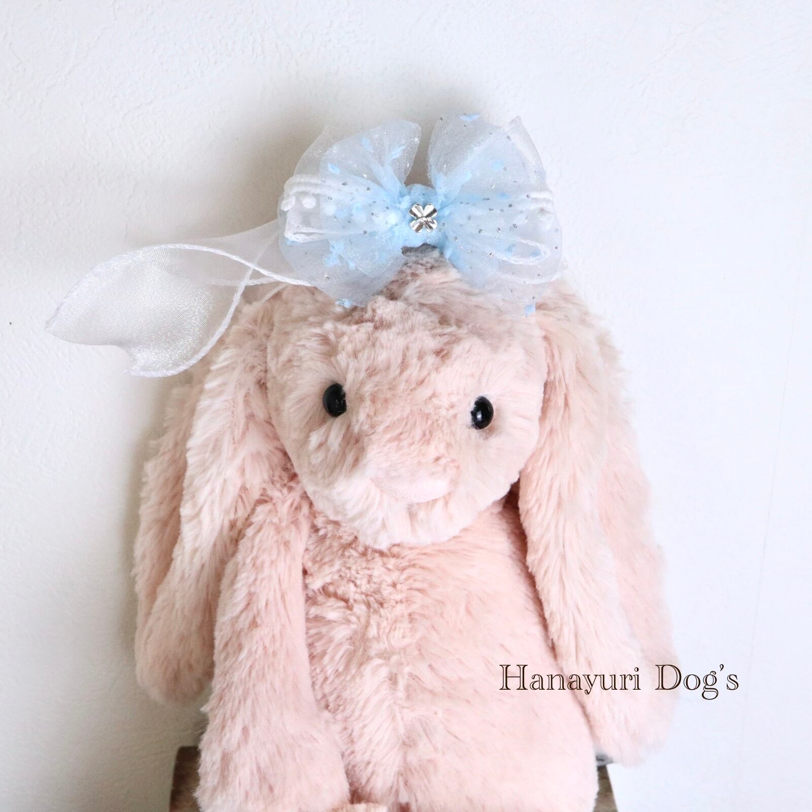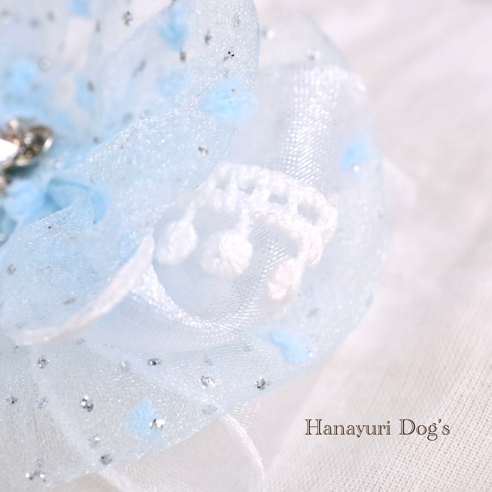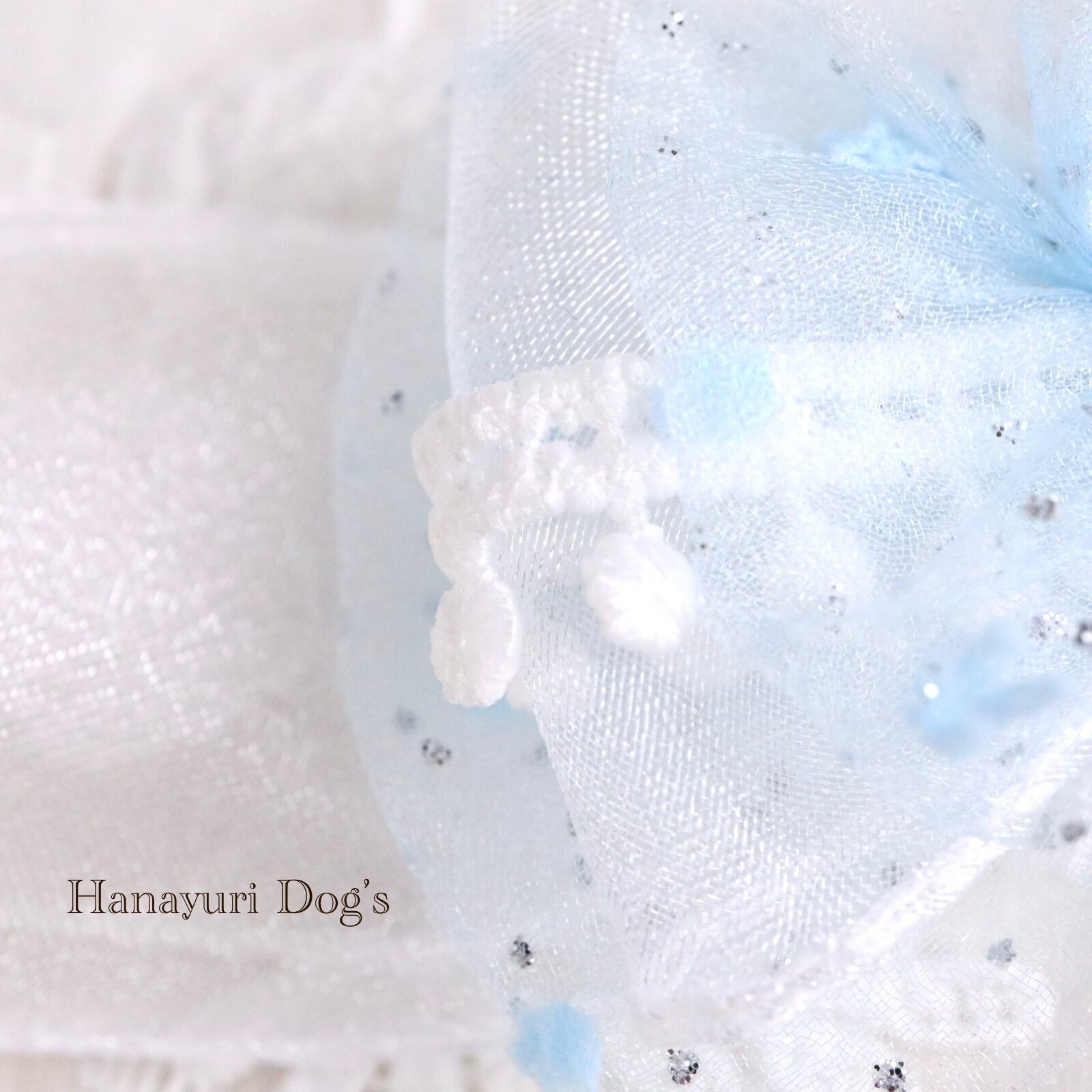 流れるオーガンジー ブルー×ホワイト ハート・花1P ラインストーン 犬バレッタ キッズ・子供リボン ペット ぬいぐるみ ヘアアクセサリー 髪飾り 誕生日 記念日 プレゼント オフ会 うちの子記念日 イベント 撮影