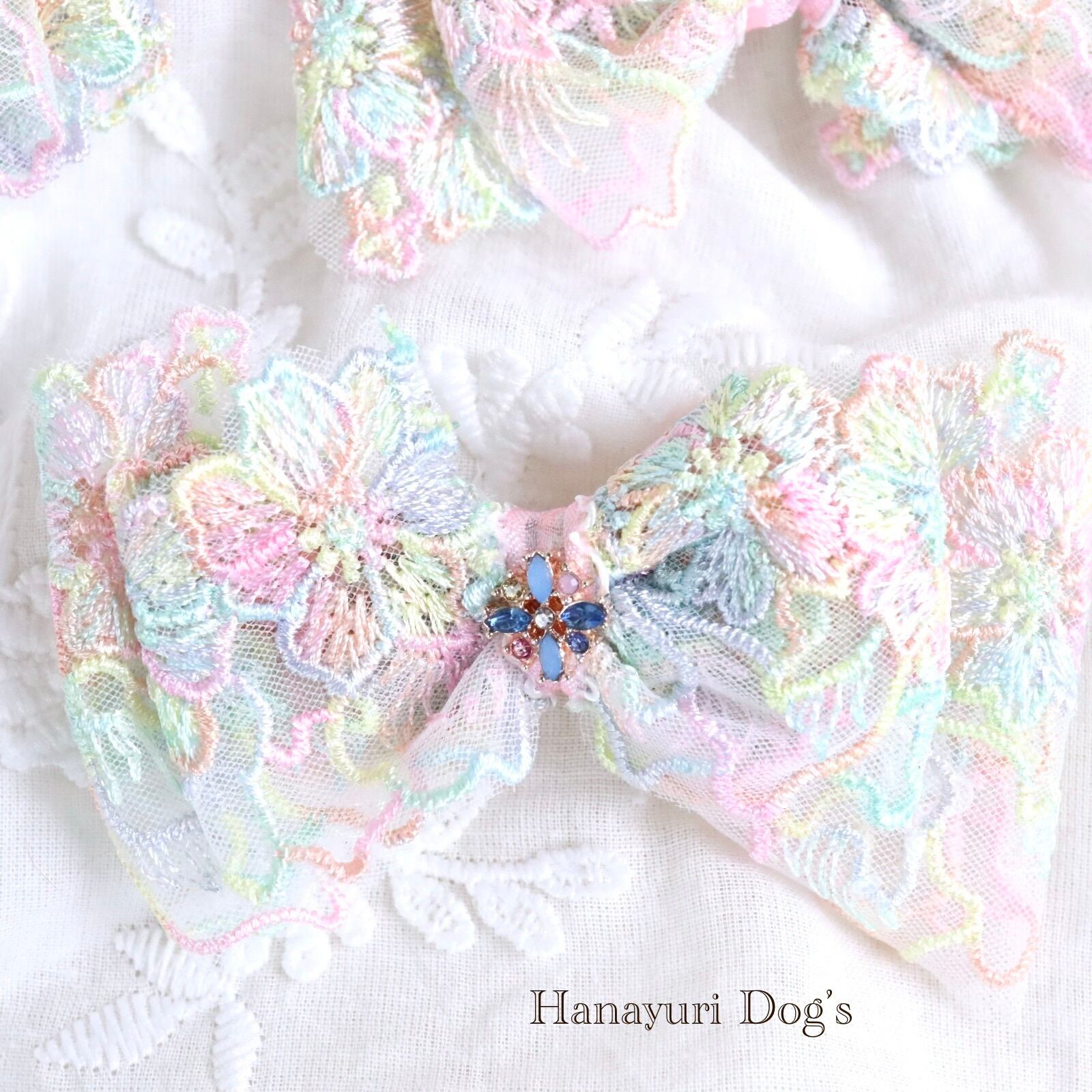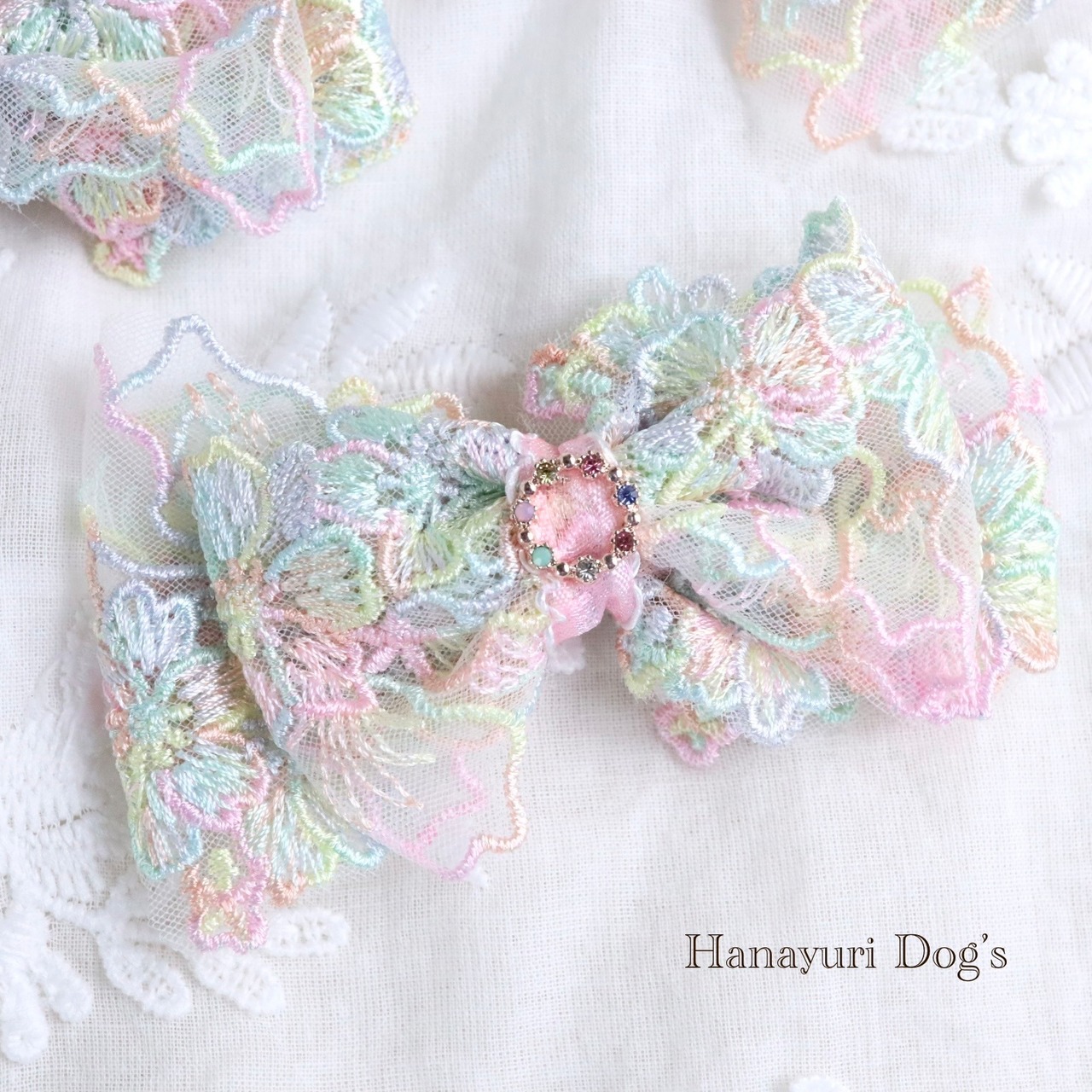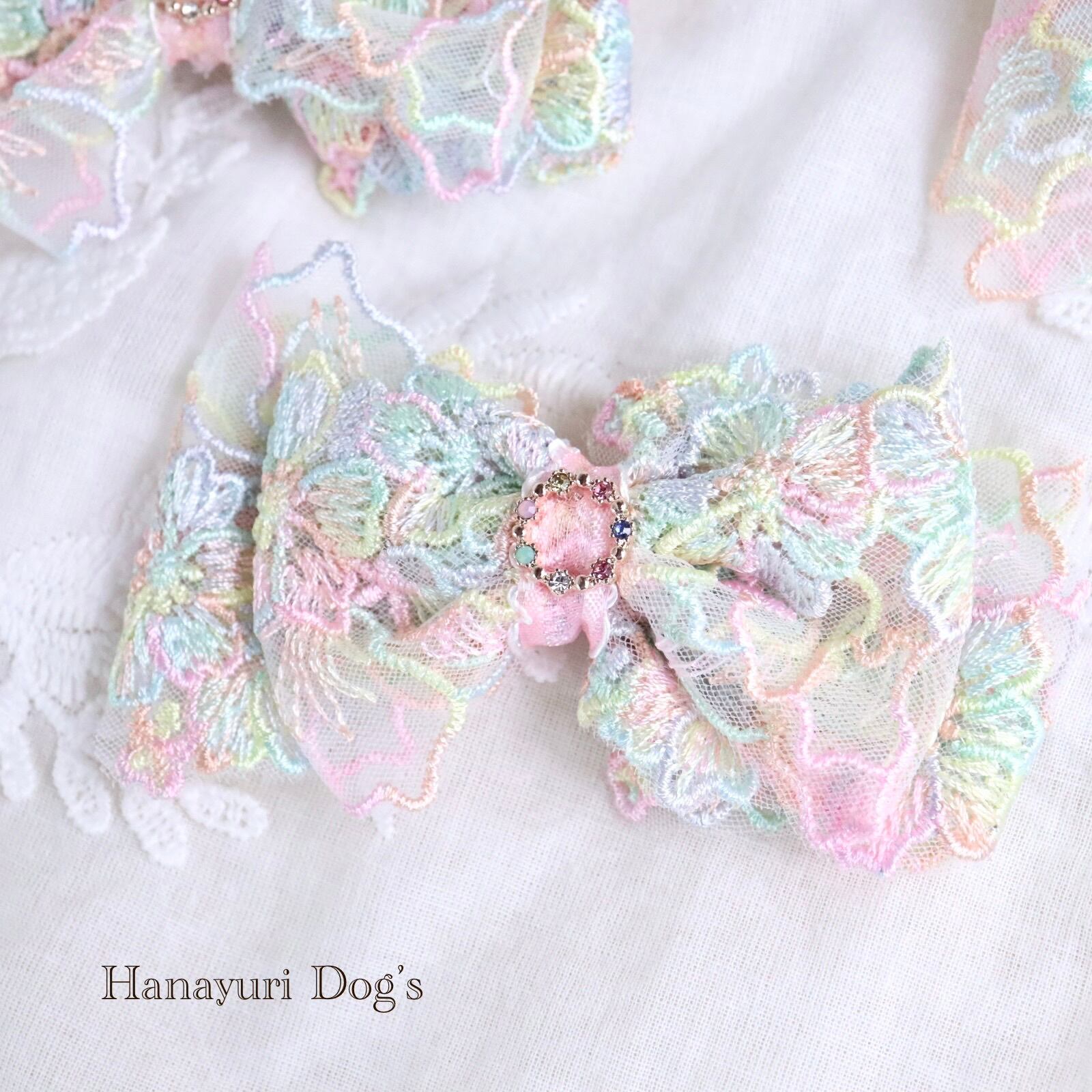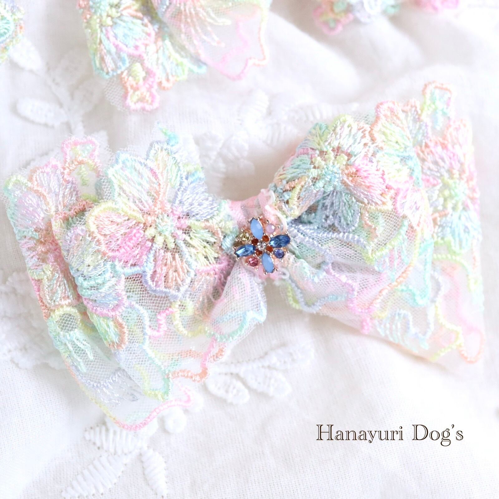 高級カラフル刺繍 リングと花ビジュー1P 犬バレッタ キッズ・子供リボン ペット ぬいぐるみ ヘアアクセサリー 髪飾り 誕生日 記念日 プレゼント オフ会 うちの子記念日 イベント 撮影