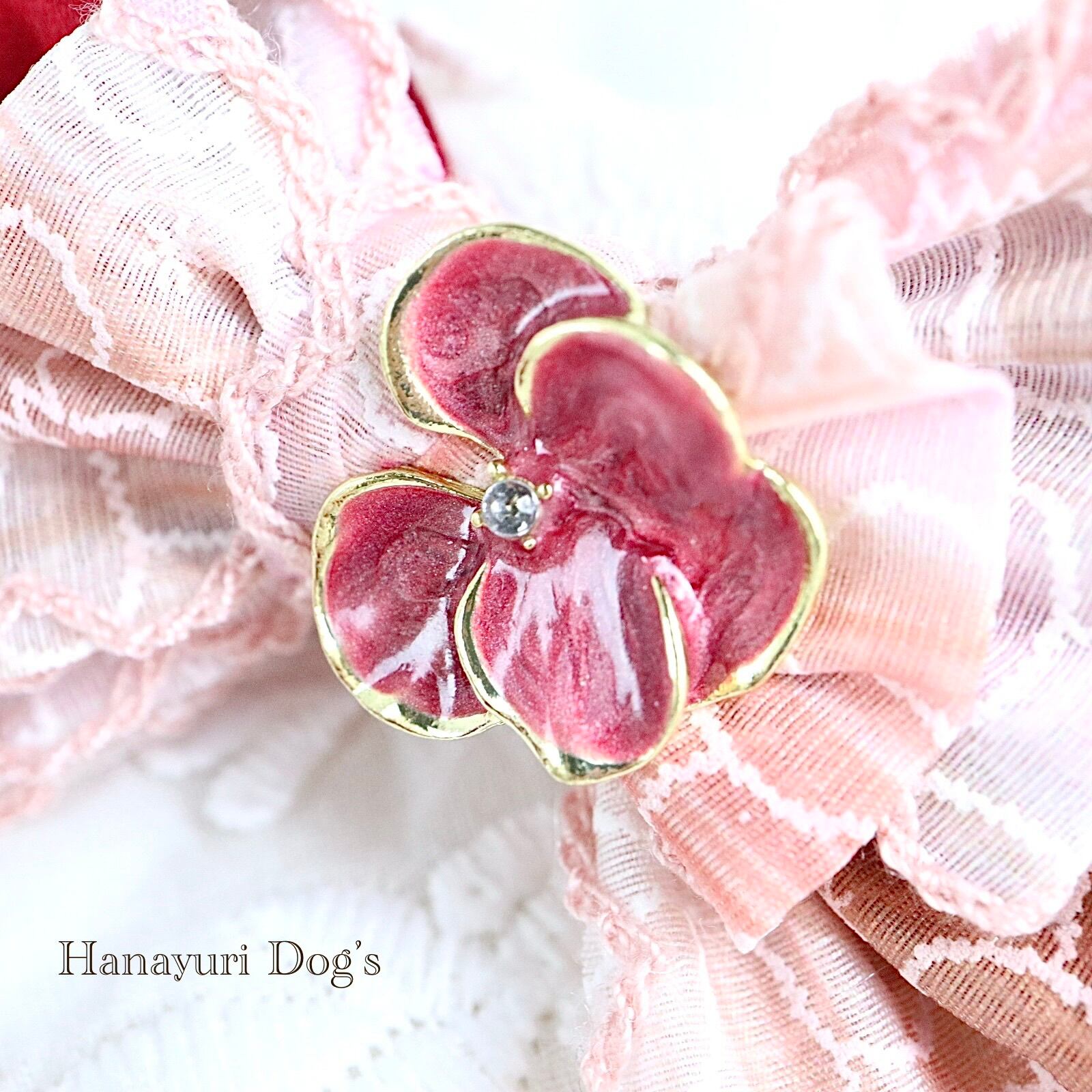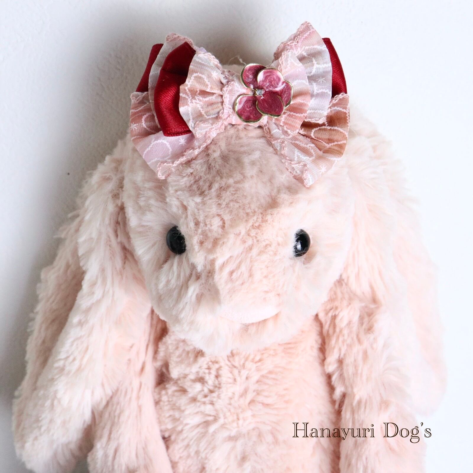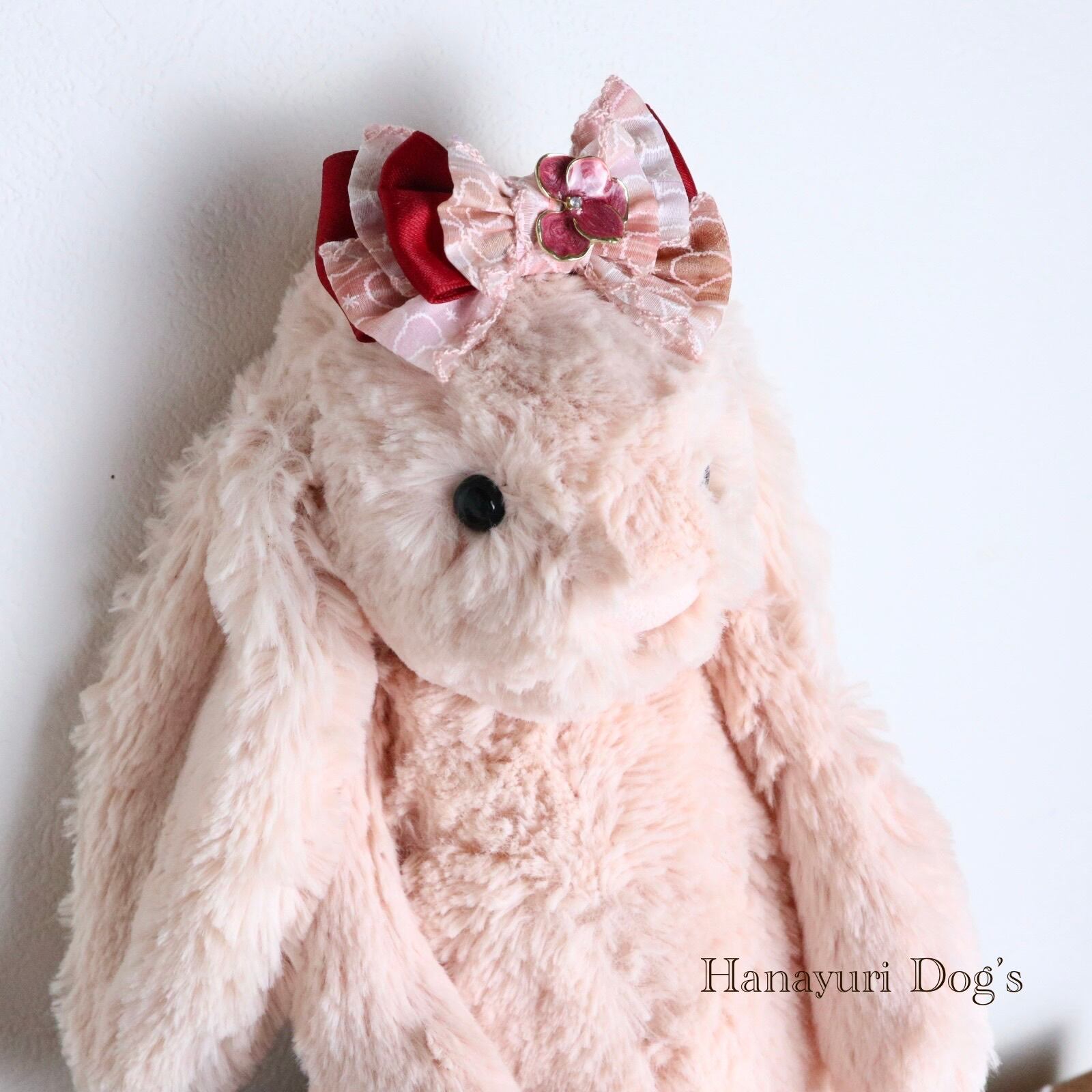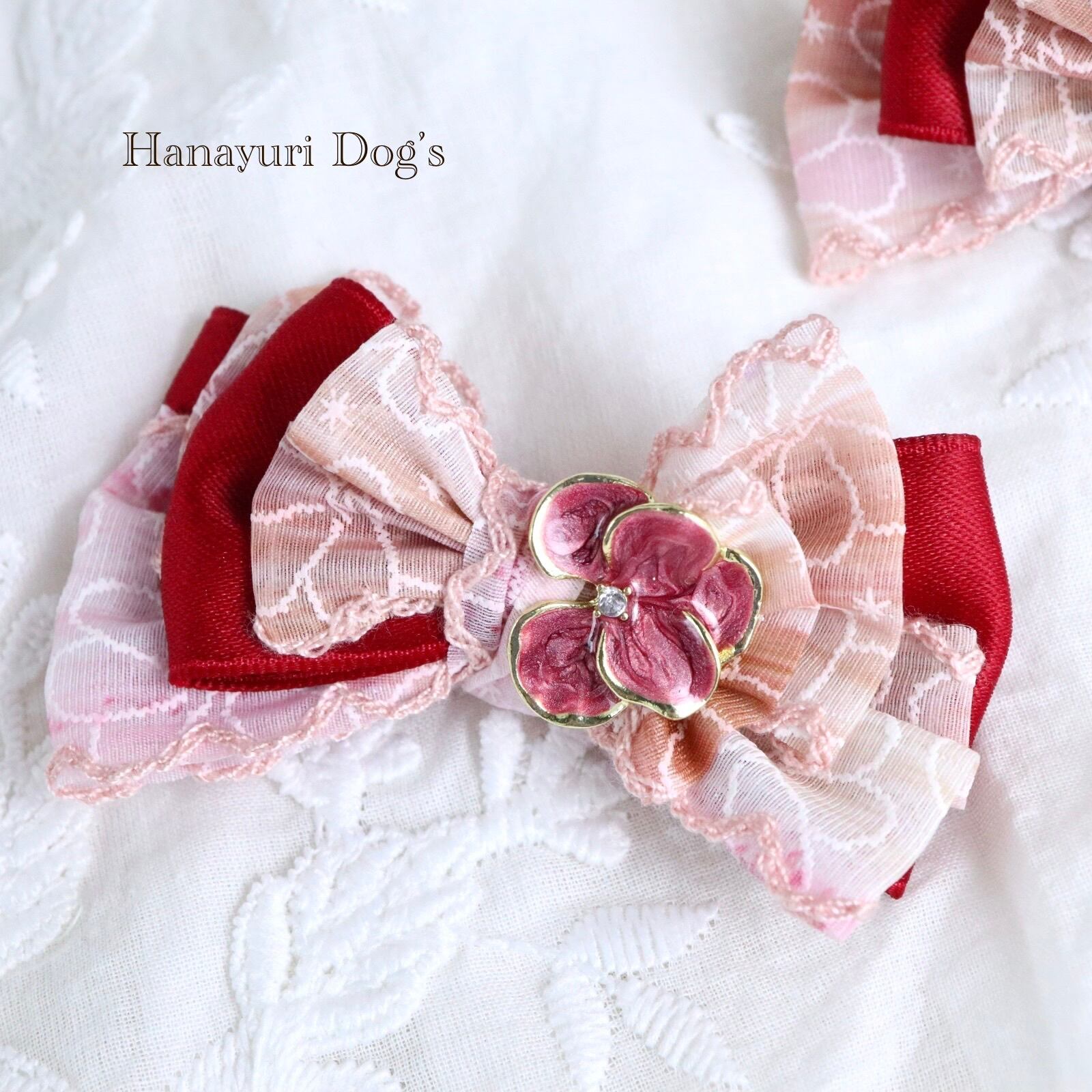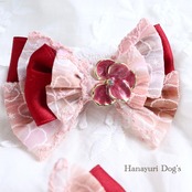 ピンク×ワインレッド 花ビジュー 犬バレッタ キッズ・子供リボン ペット ぬいぐるみ ヘアアクセサリー 髪飾り 誕生日 記念日 プレゼント オフ会 うちの子記念日 イベント 撮影
