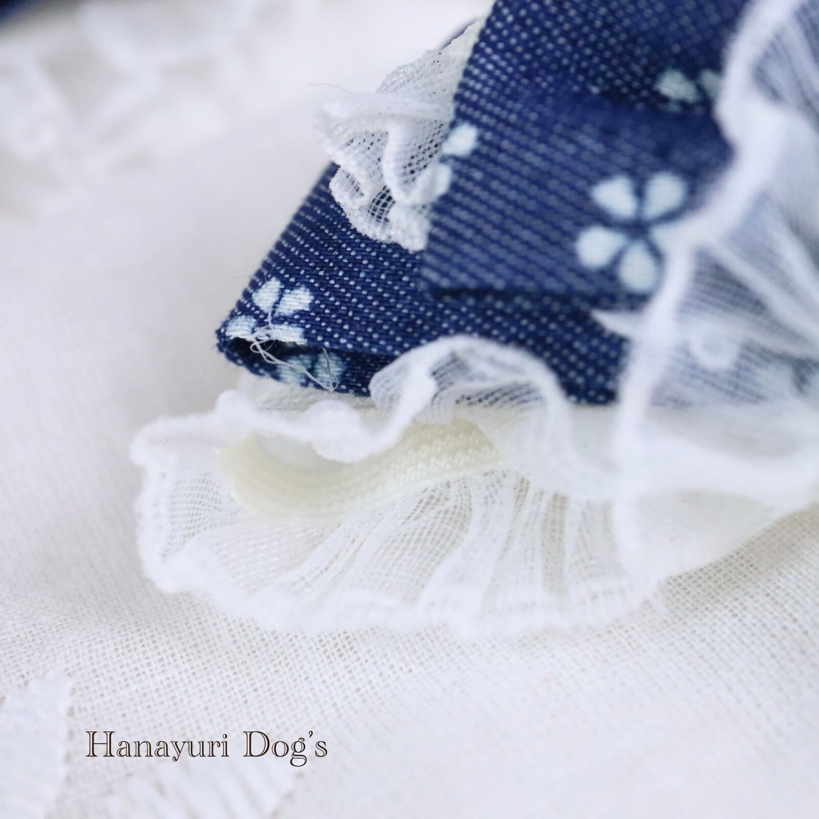 愛らしい小花柄のブルージーンズに、真っ白なフリルレースを合わせたフェミニンスタイルのデニムリボンです。