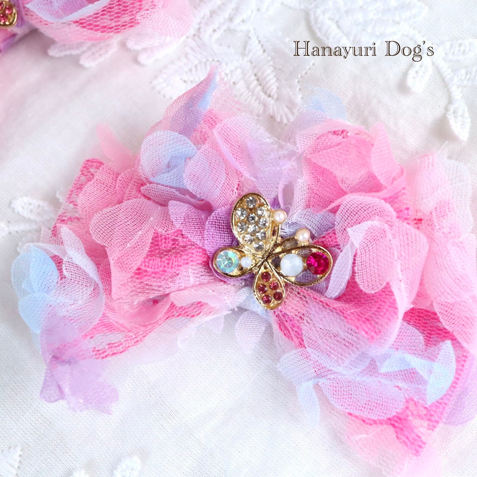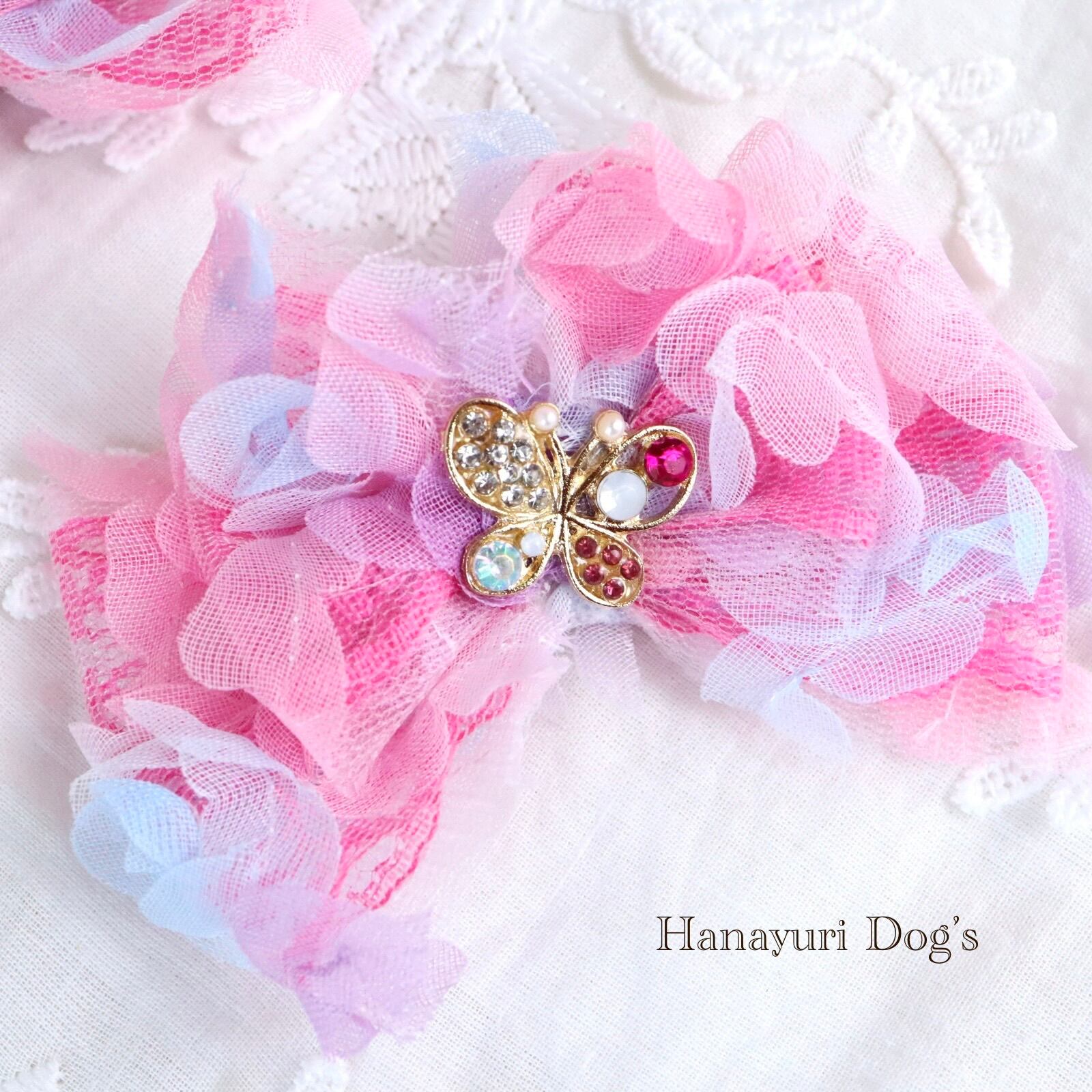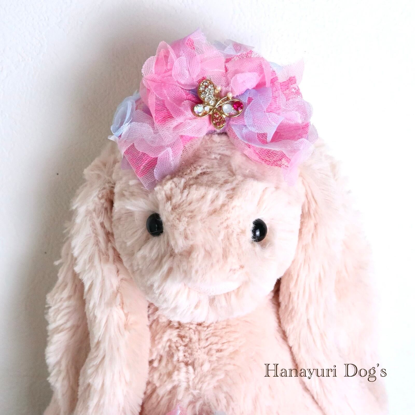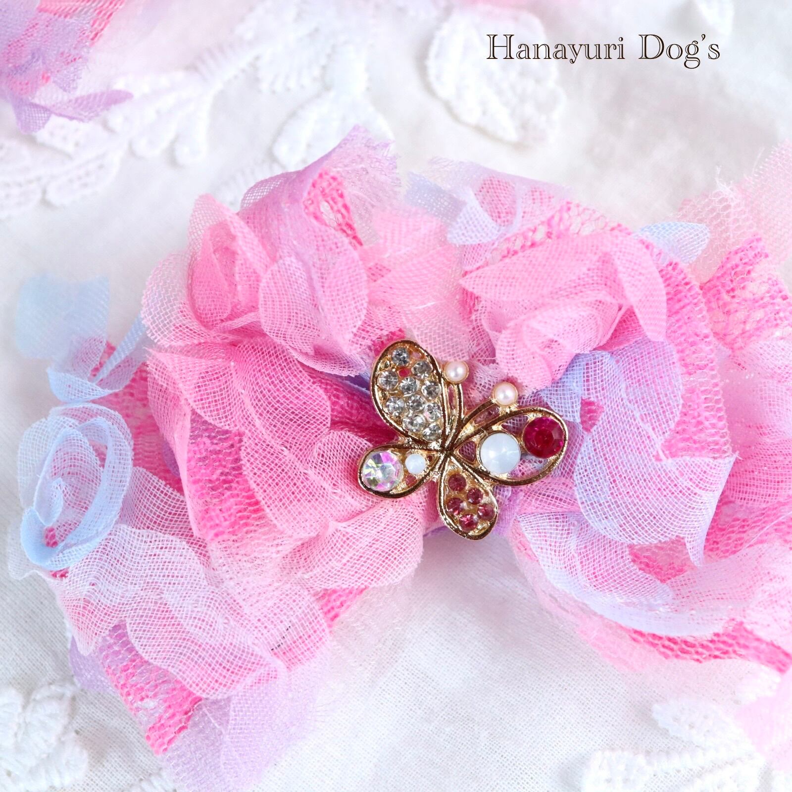 チュール重ね ピンク 蝶 犬バレッタ キッズ・子供リボン ペット ぬいぐるみ ヘアアクセサリー 髪飾り 誕生日 記念日 プレゼント オフ会 うちの子記念日 イベント 撮影