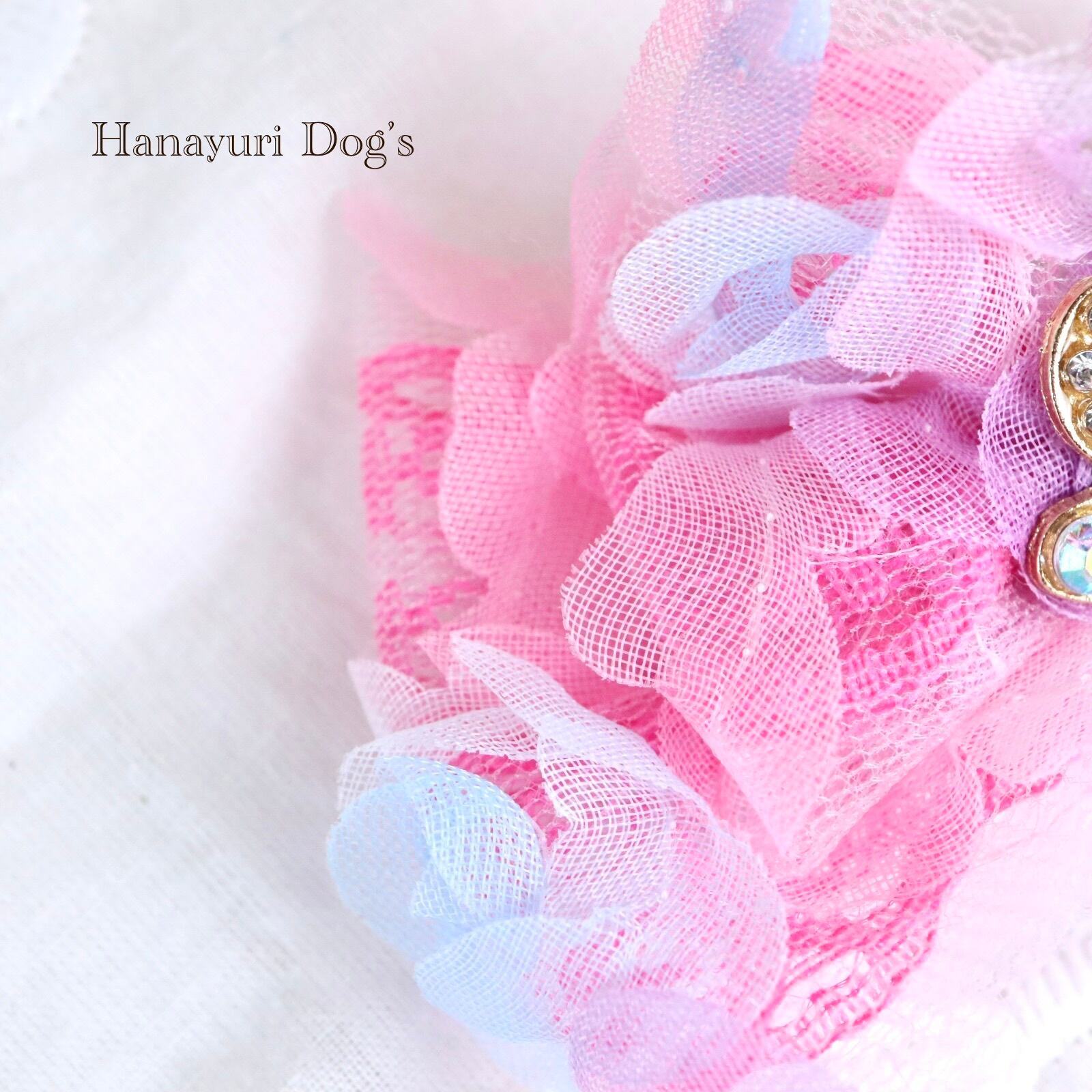 淡いチュール重ねのリボンの下に濃いピンクを覗かせて、くっきり華やかで個性的な色合いに仕上げました。