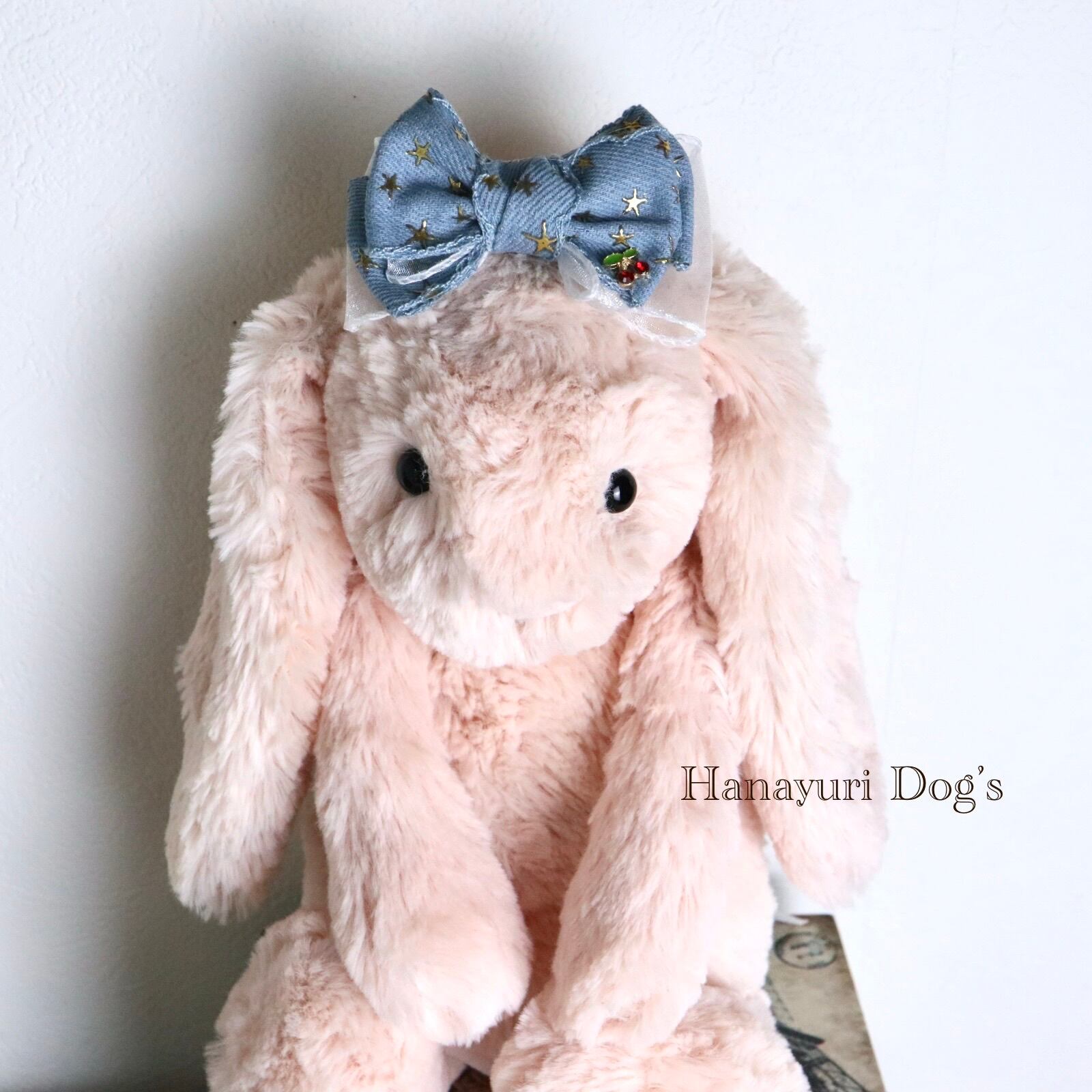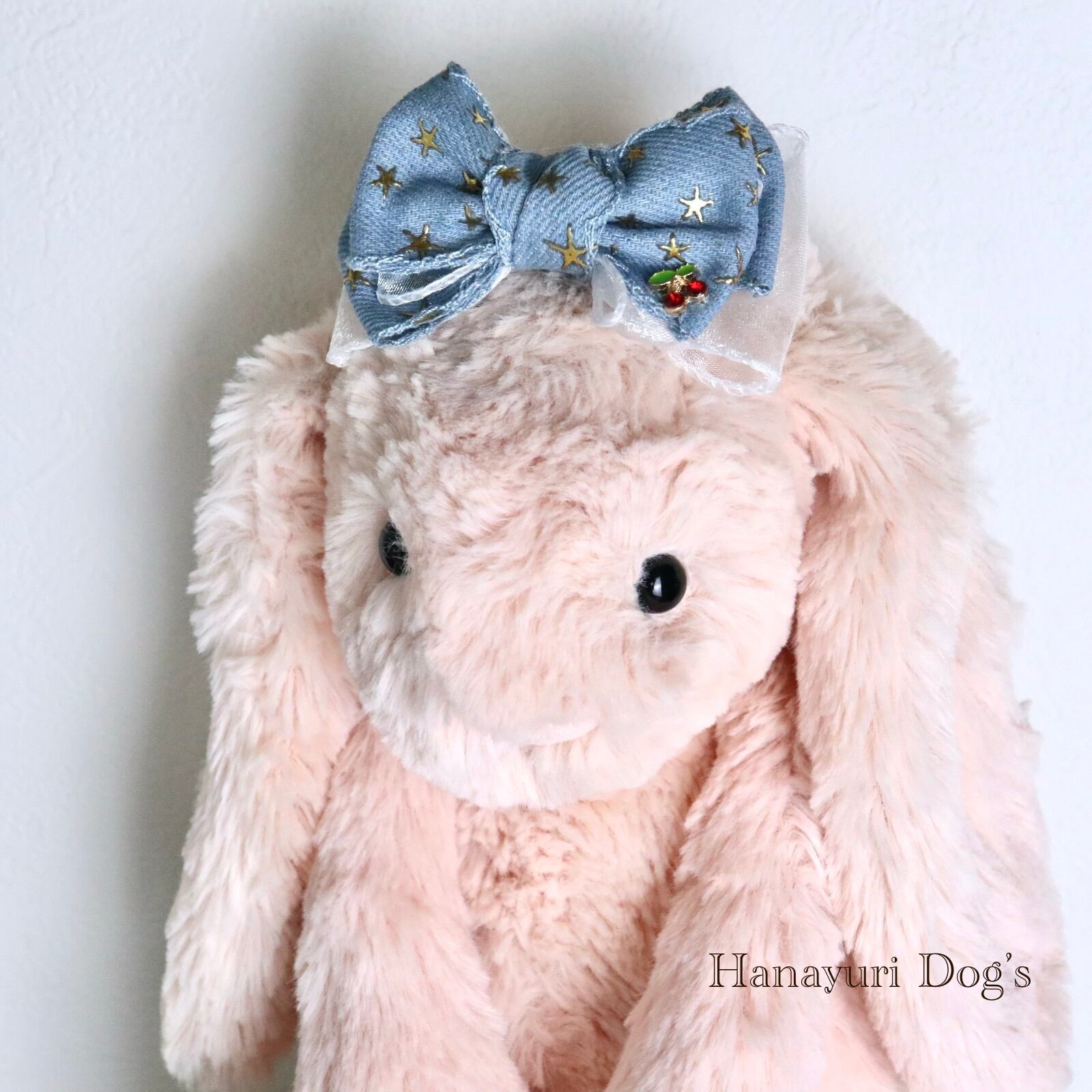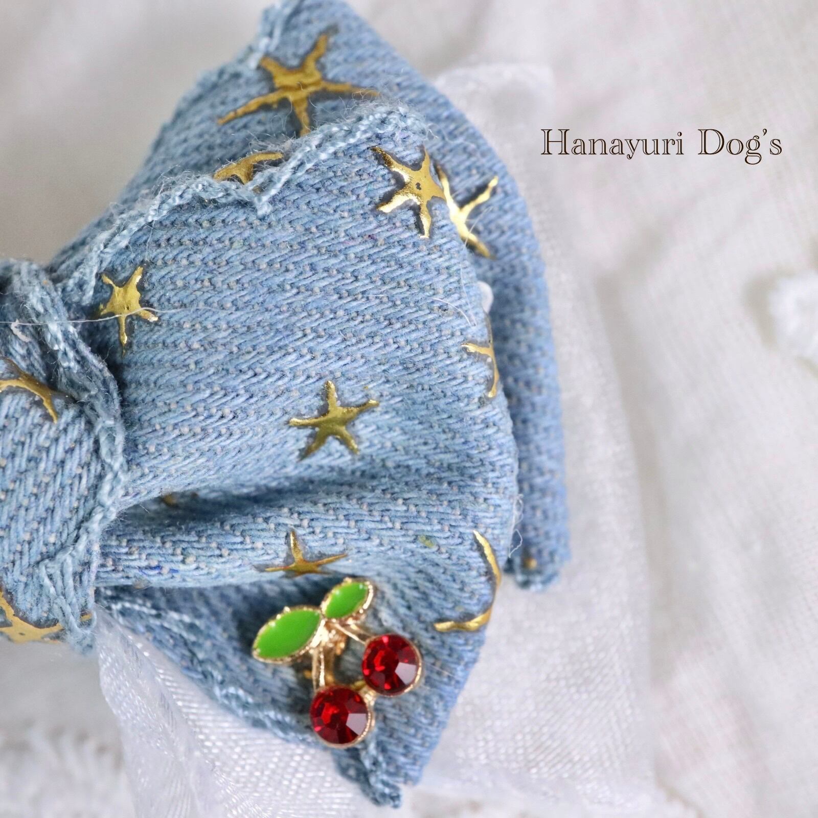 ビンテージ風デニム ライトブルー 星 チェリー さくらんぼ 犬バレッタ キッズ・子供リボン ペット ぬいぐるみ ヘアアクセサリー 髪飾り 誕生日 記念日 プレゼント オフ会 うちの子記念日 イベント 撮影
