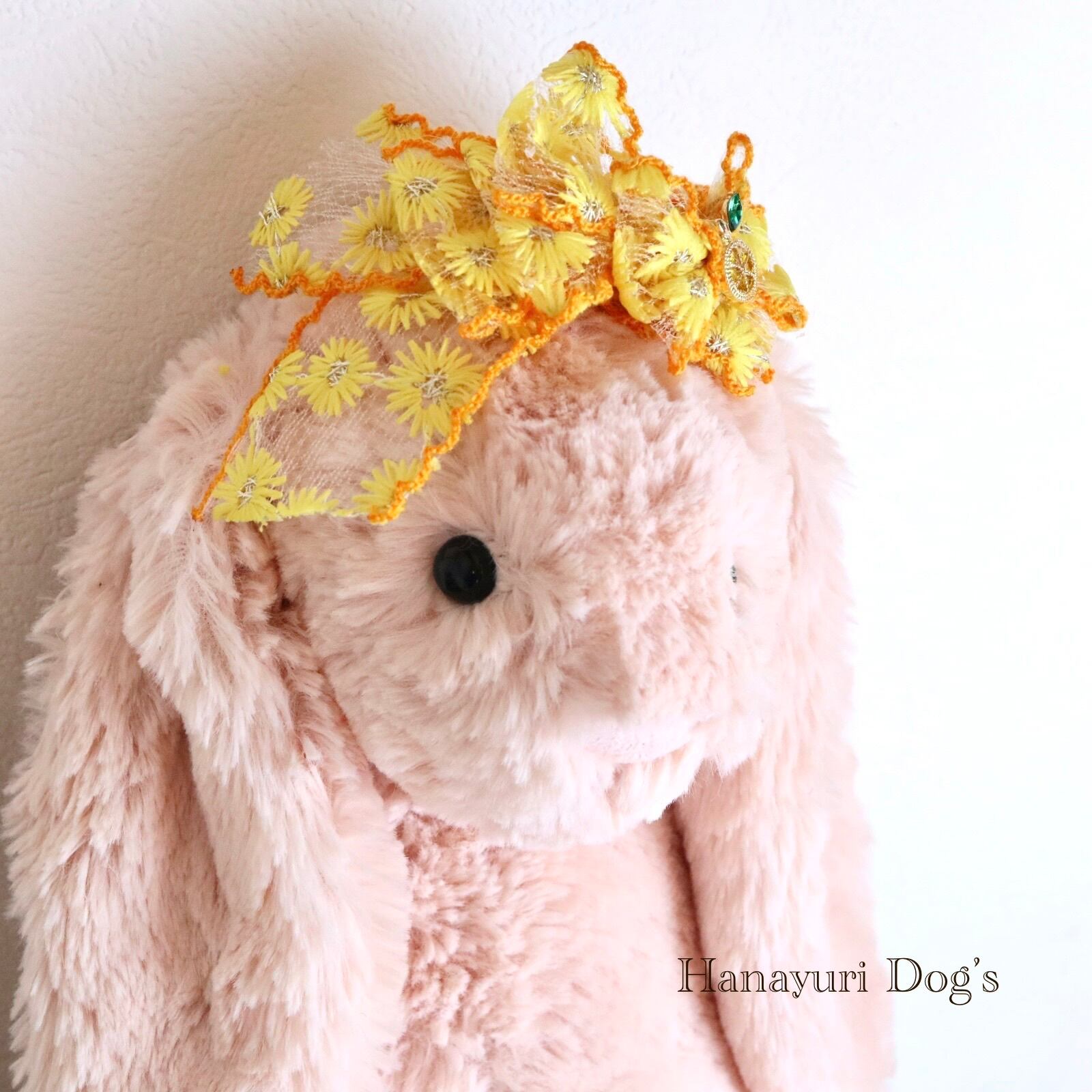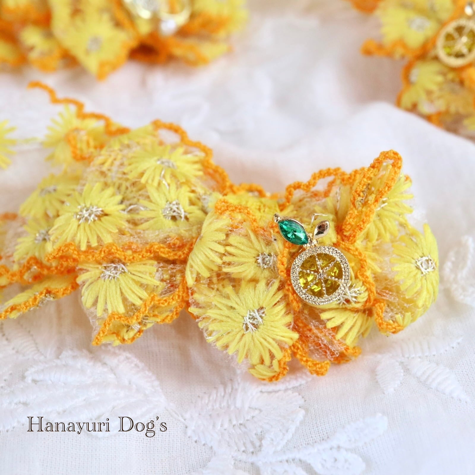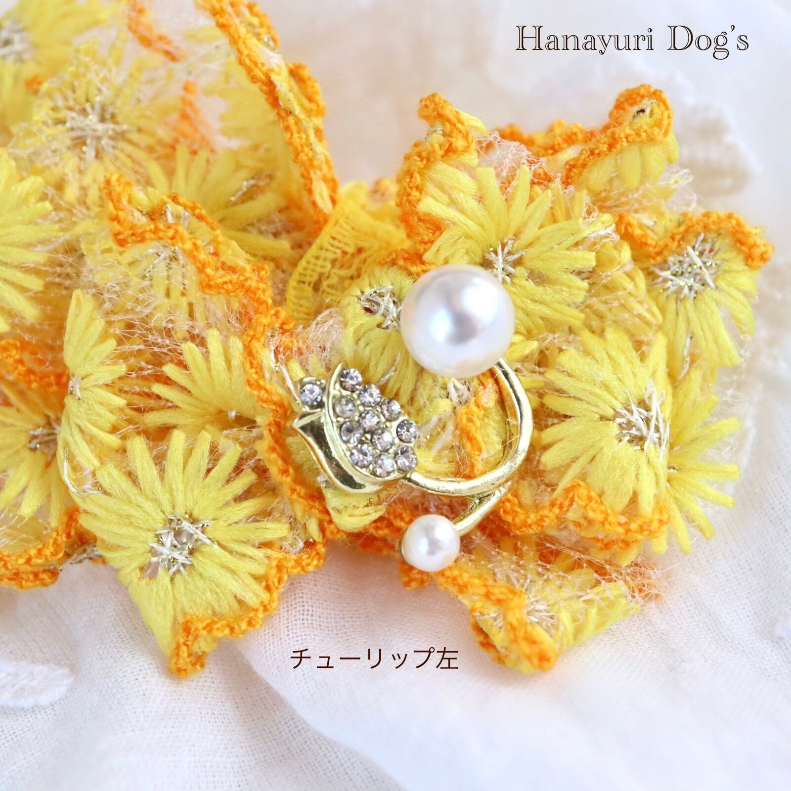 黄色チュール オレンジ 花刺繍 オレンジ チューリップ 犬バレッタ キッズ・子供リボン ペット ぬいぐるみ ヘアアクセサリー 髪飾り 誕生日 記念日 プレゼント オフ会 うちの子記念日 イベント 撮影